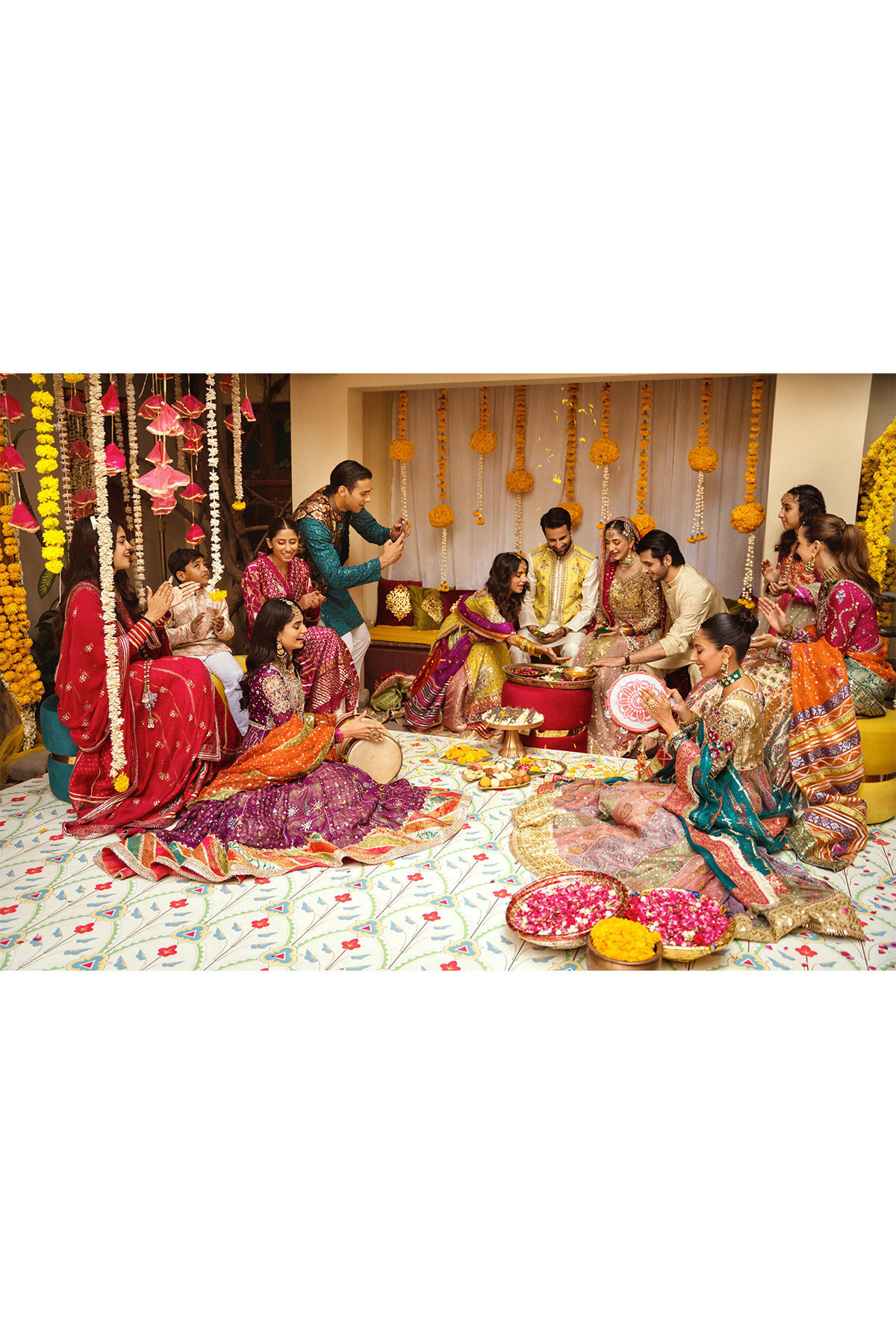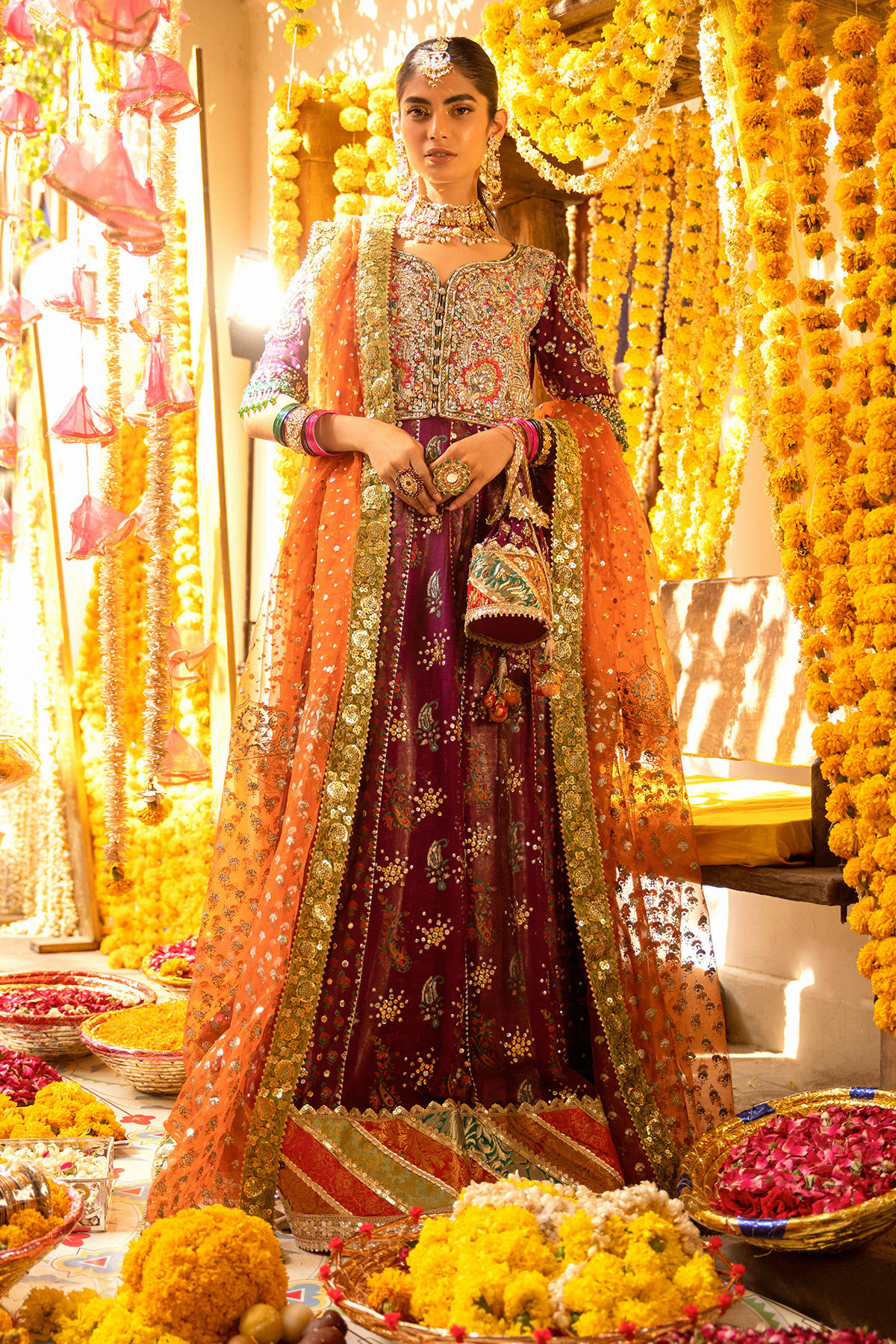Head-turning details of silk thread rosettes and light-catching crystals on silk net deep plum canvas featuring hand-block printed details.