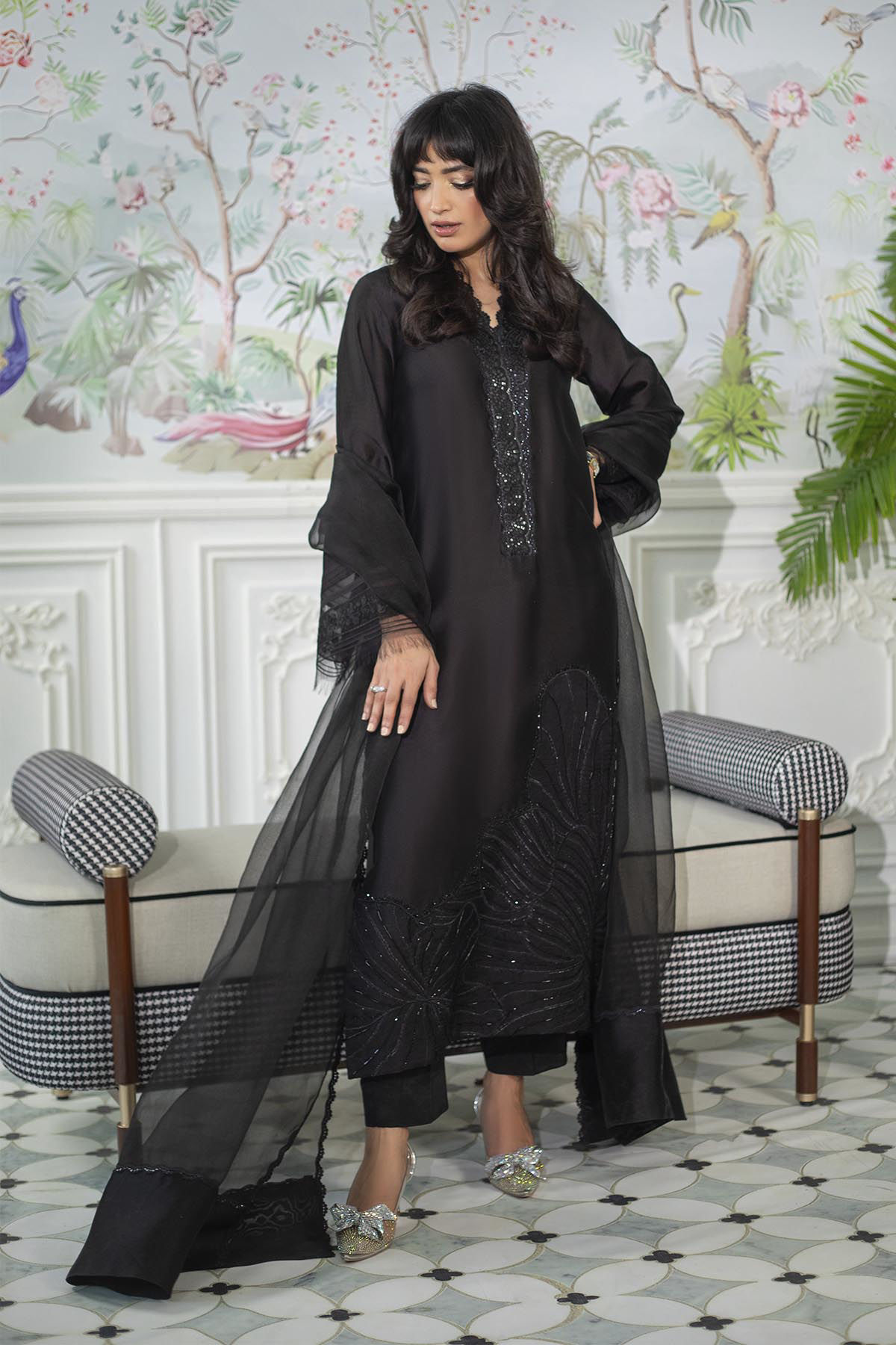 Long silhouette shirt crafted from pure shisha silk in head turning ebony, showcasing abstract tone-on-tone embroidered details complemented by light-catching beads and crystals. The hem of the shirt is meticulously appliquéd on silk fabric, embellished with light-catching sequin accents at the neckline. This exquisite shirt can be elegantly paired with matching pants and an organza dupatta, ensuring a stunning appearance this festive season.