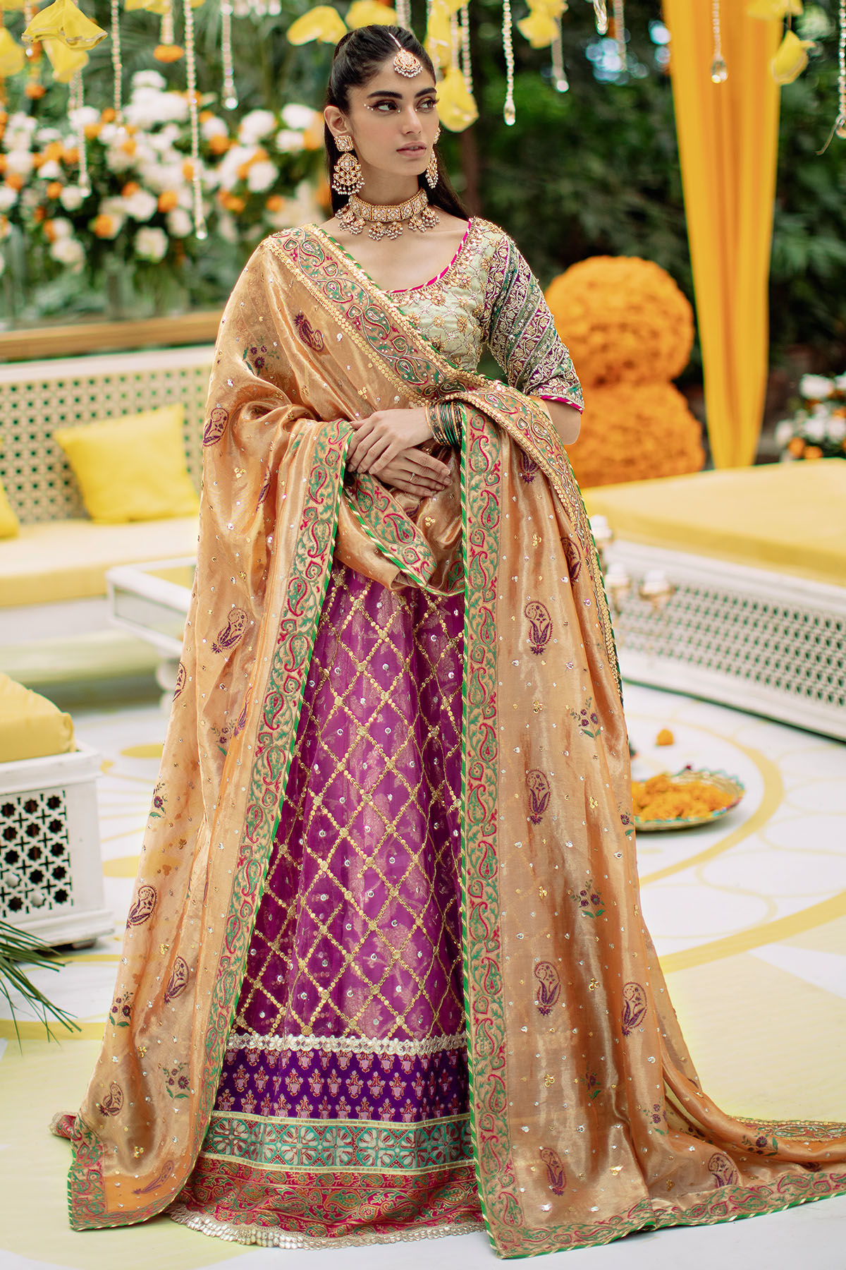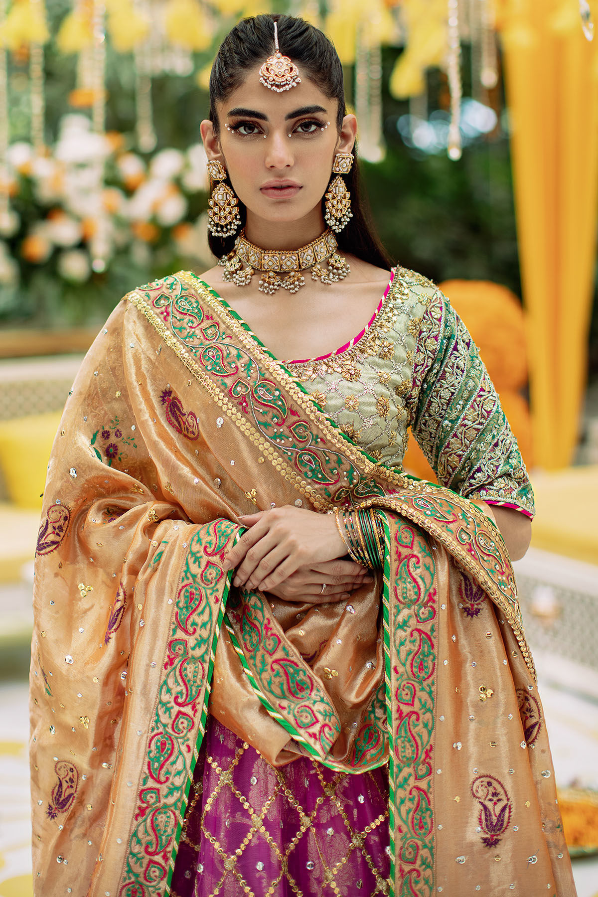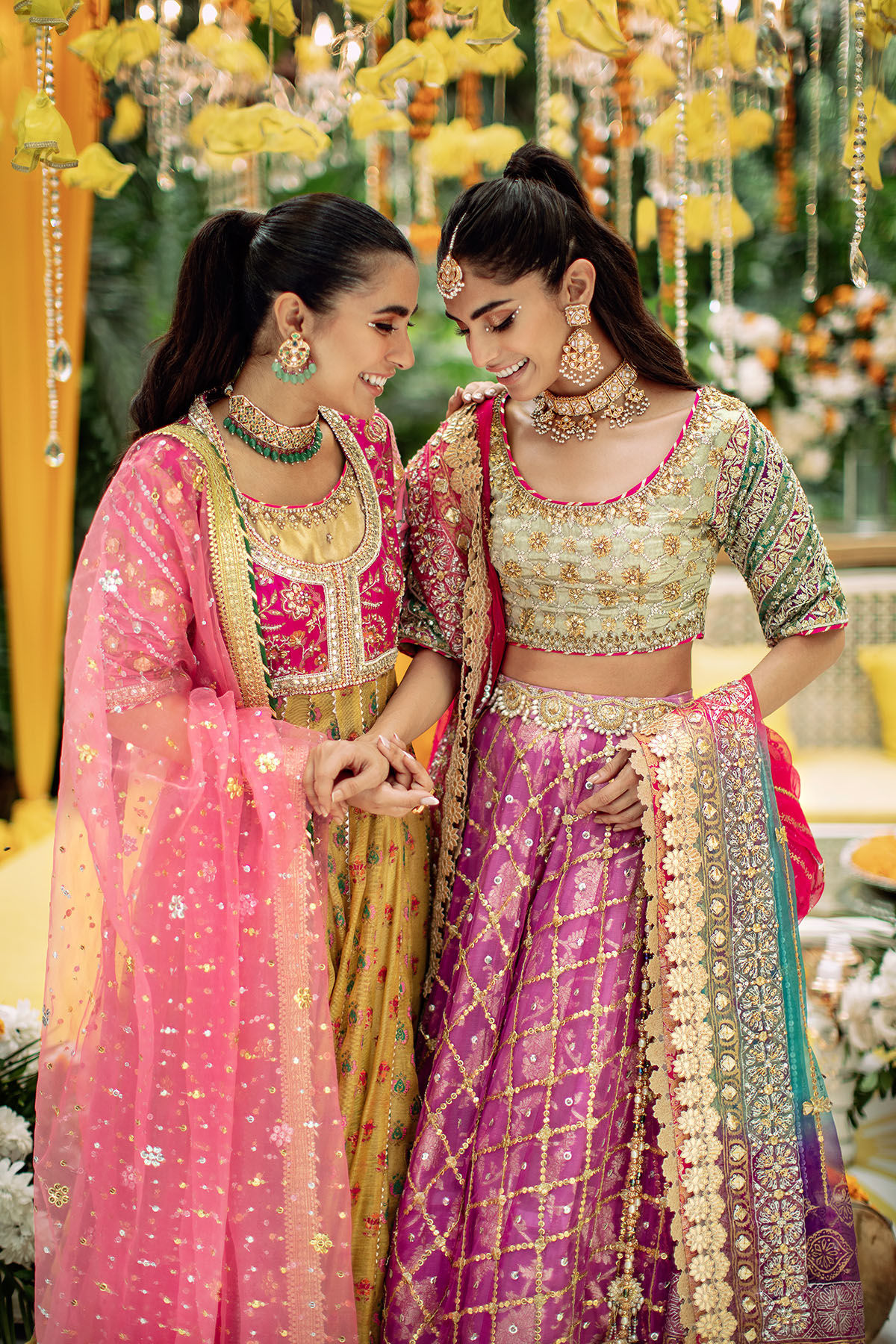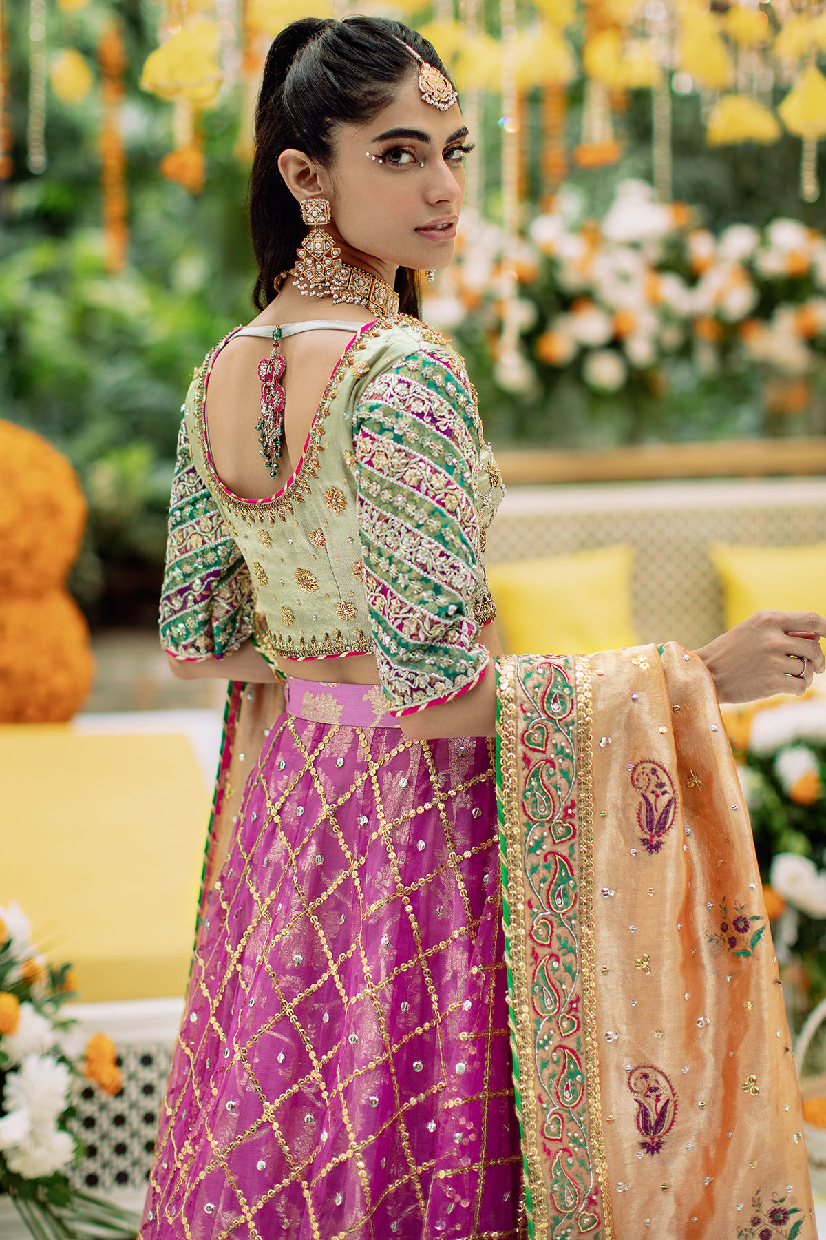 Net lehnga featuring sequins and gota details in gorgeous magenta pink canvas featuring hand block printed borders on hemline. The belt of the lehnga is decorated with handcrafted details and it is further adorned with handcrafted tassels. The lehnga is paired with mint green lame choli featuring zardozi and gota details, the chattapatti sleeves with zarodozi are sure to turn heads. The outfit can be paired with gold lame dupatta featuring hand block printed details in multicolours.