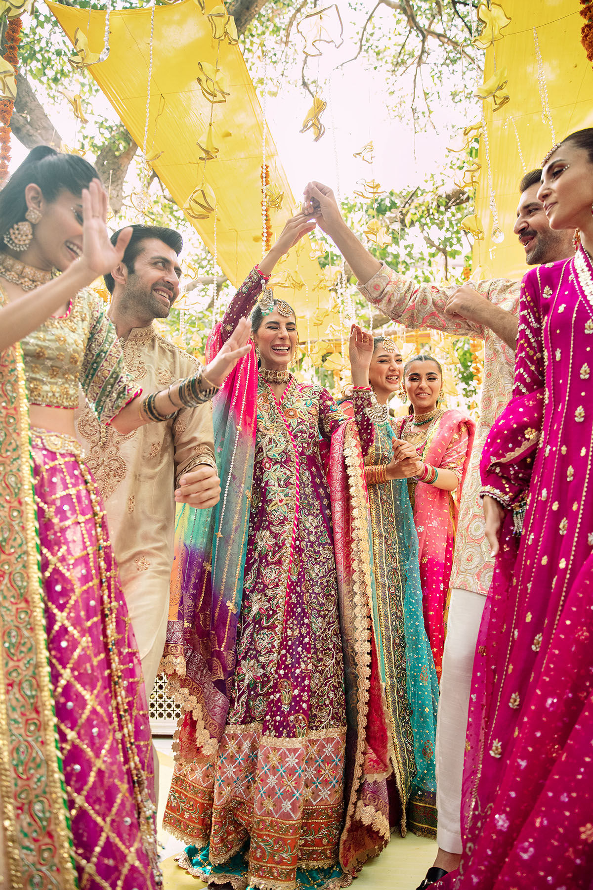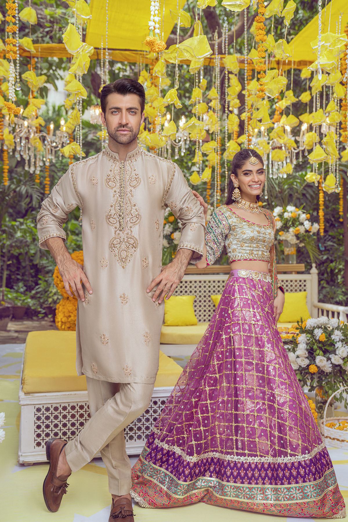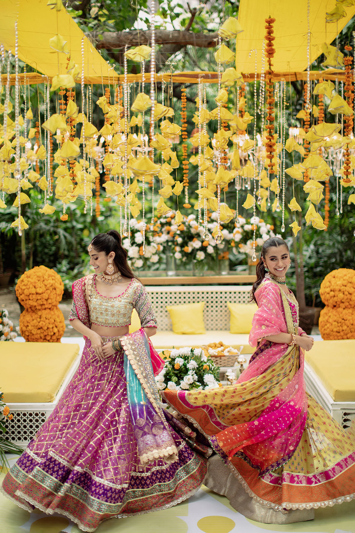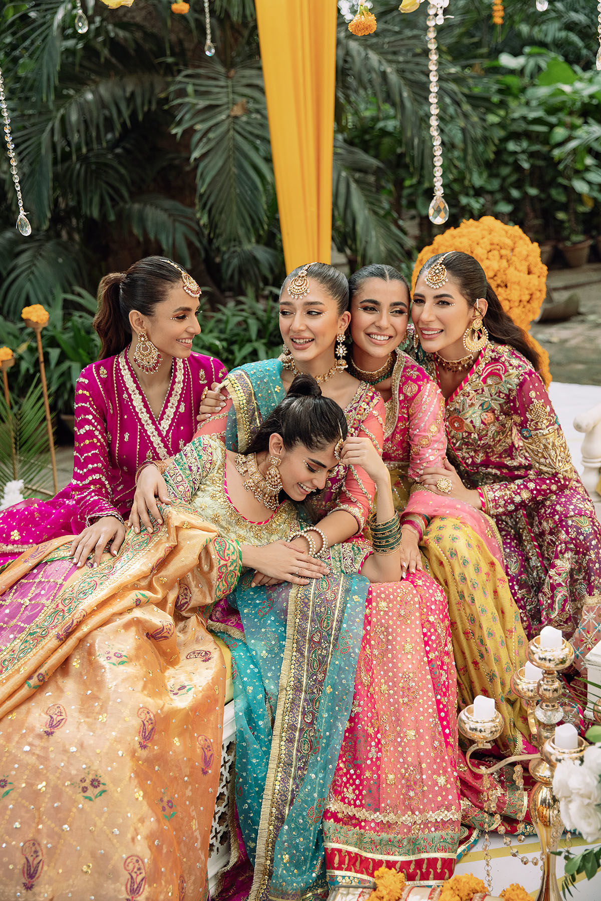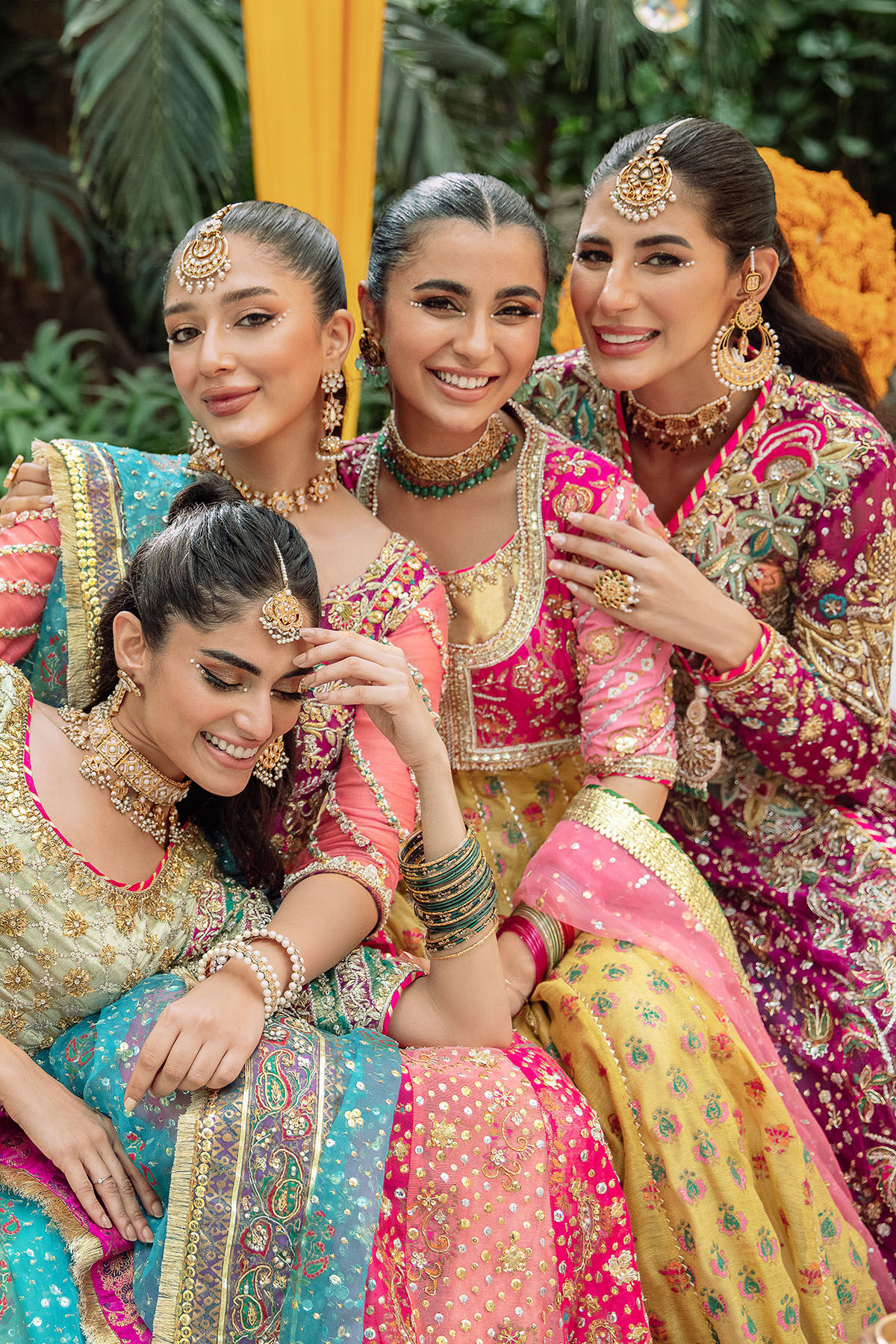 Net lehnga featuring sequins and gota details in gorgeous magenta pink canvas featuring hand block printed borders on hemline. The belt of the lehnga is decorated with handcrafted details and it is further adorned with handcrafted tassels. The lehnga is paired with mint green lame choli featuring zardozi and gota details, the chattapatti sleeves with zarodozi are sure to turn heads. The outfit can be paired with gold lame dupatta featuring hand block printed details in multicolours.