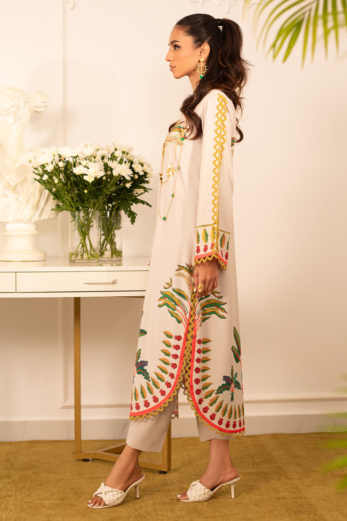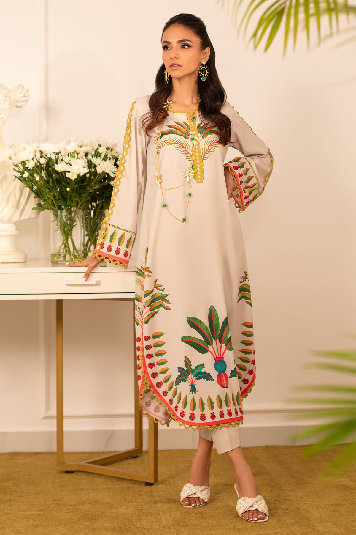 Quirky, trendy yet elegant co-ord set on crepe silk featuring balanced and carefully crafted prints, enhanced with lace details, is a must-have in your closet this summer.