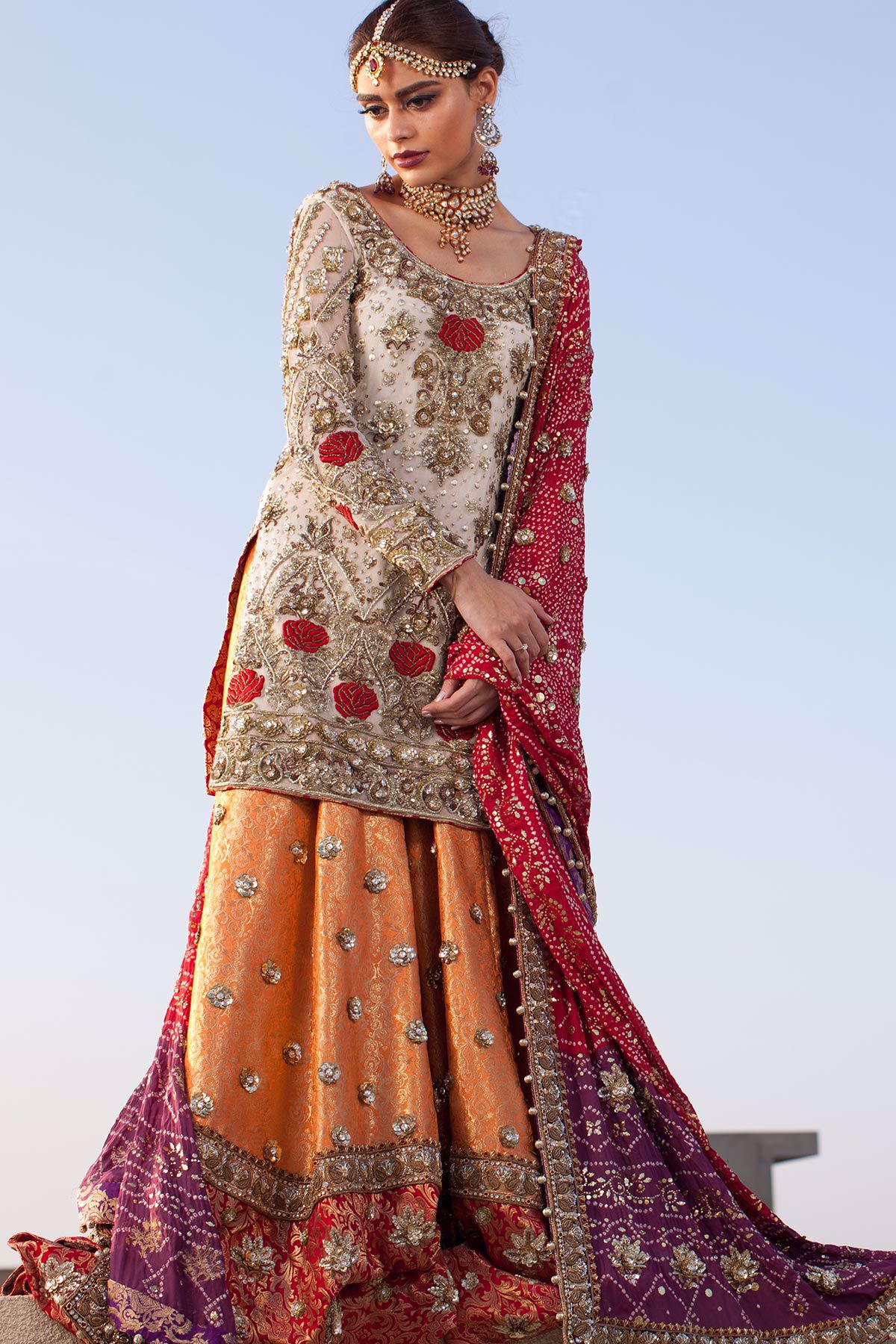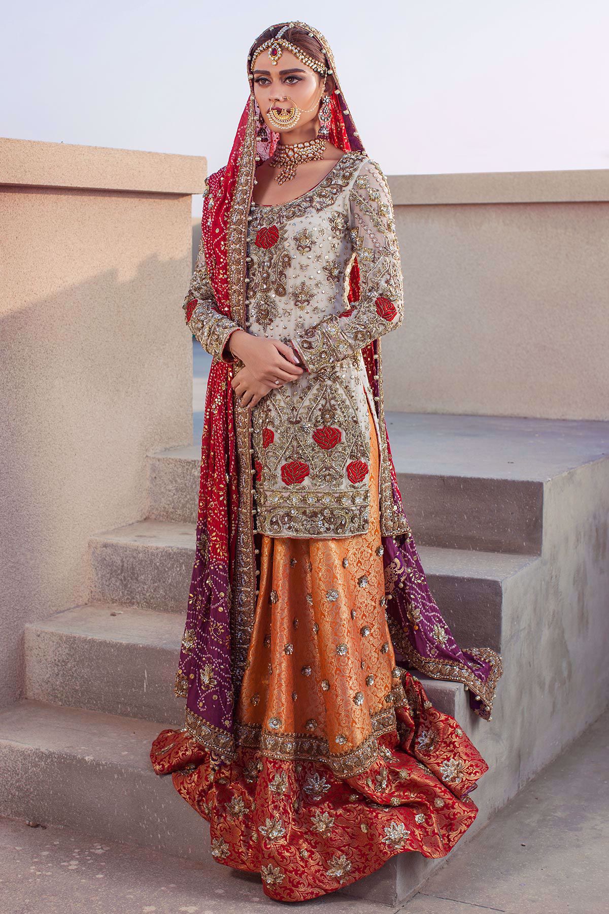 This ivory and red bridal from La Beauté is sure to turn heads. The ivory net shirt is loaded with dabka, naqshi and tila embroidery. The hemline of the shirt has heavy zardoze work which is adorned with oxblood resham roses. The two colored dhaka pajama has zardoze border and heavy botis on the paincha. The chundri dupatta has violet and red ombré dying which is adorned with heavy kamdani incorporated with four side zardoze borders and botis.
