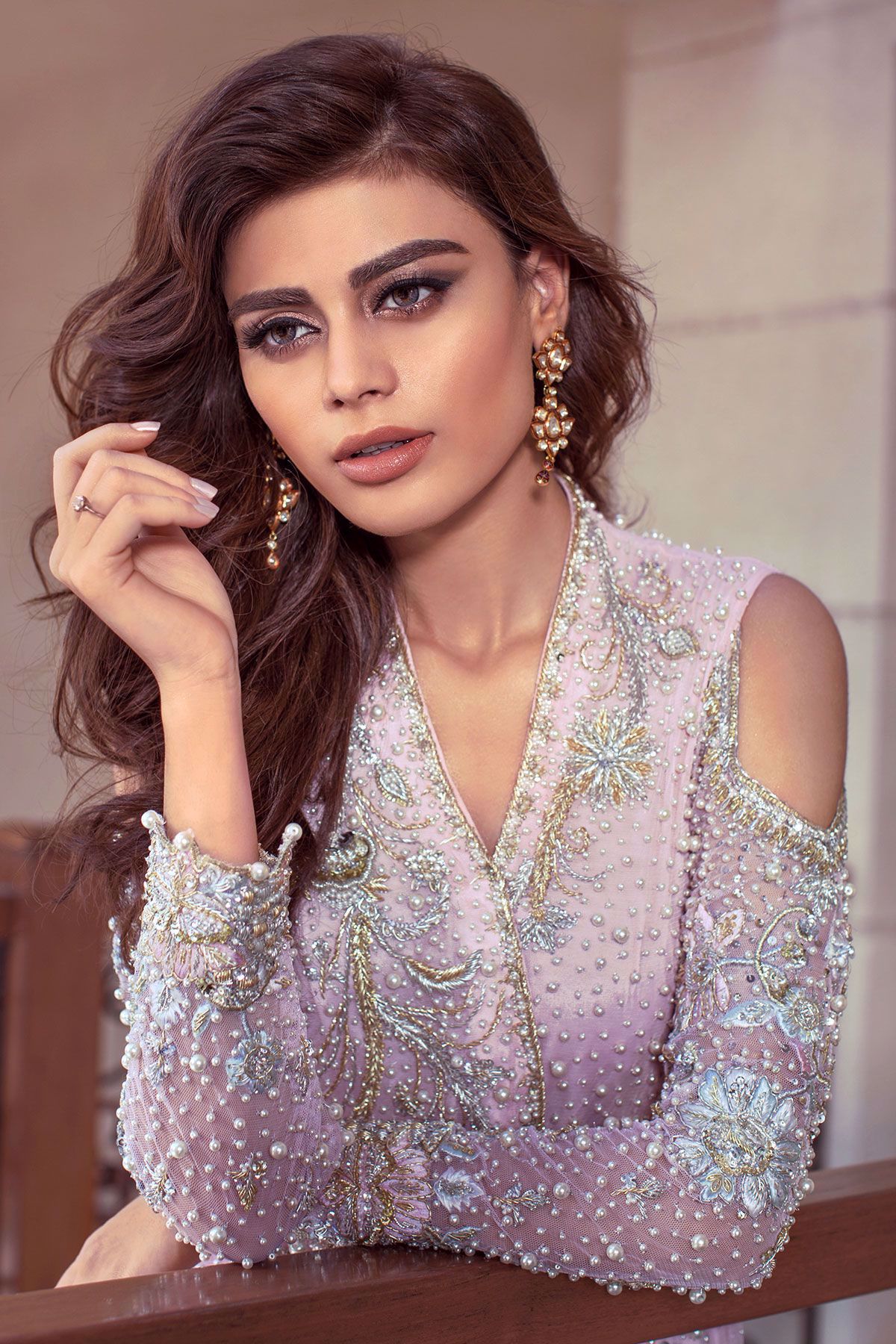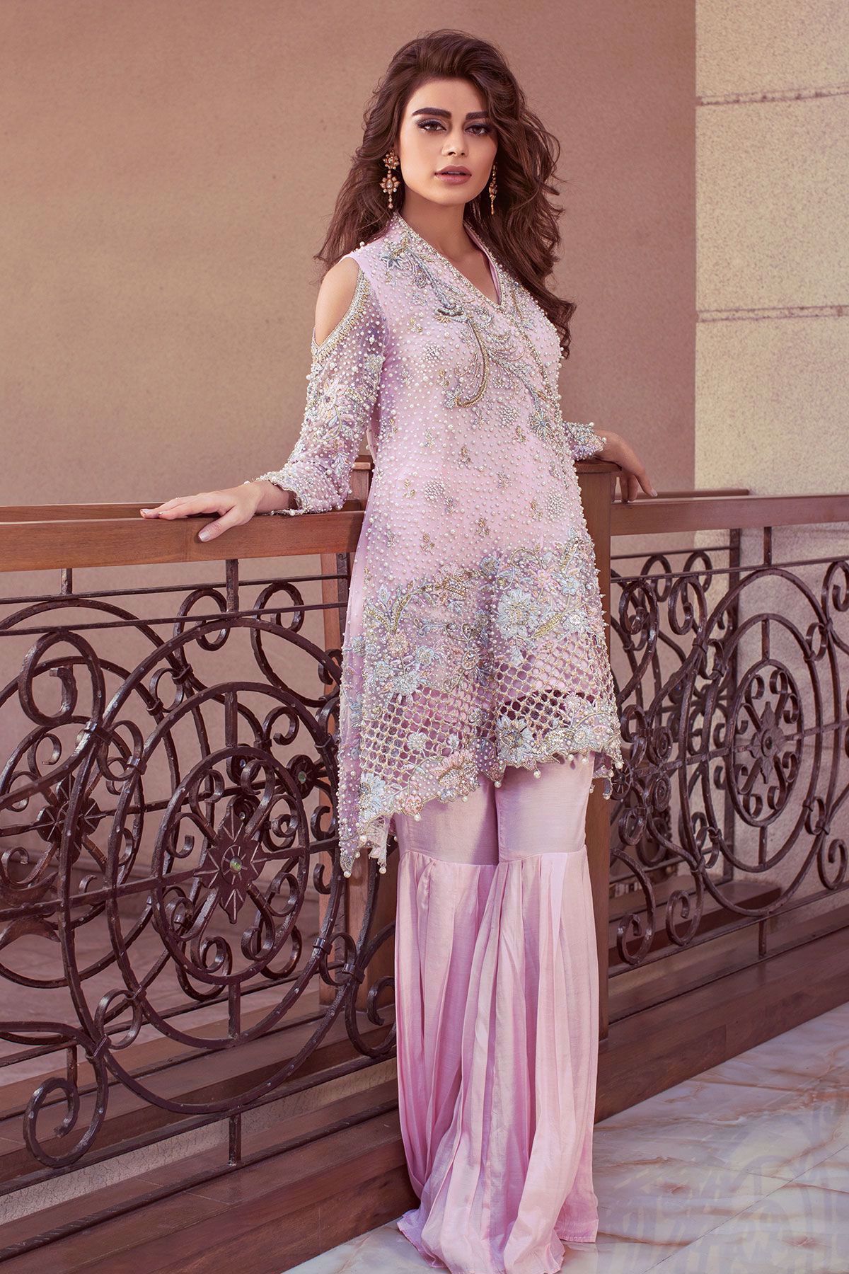Presenting you one of our super favourites carnation pink high low angarkha with cutwork hemline from La Beauté. The highlow angarkha has opulent embroidered hemline which is adorned with pearls, sequins and stones. The cold shoulder sleeves are enhanced with floral details along with light catching crystals. The shirt is overall sprayed with different sizes of pearls, stones and sequins. The pleated flared pants complete the look of this stunning ensemble from La Beauté.