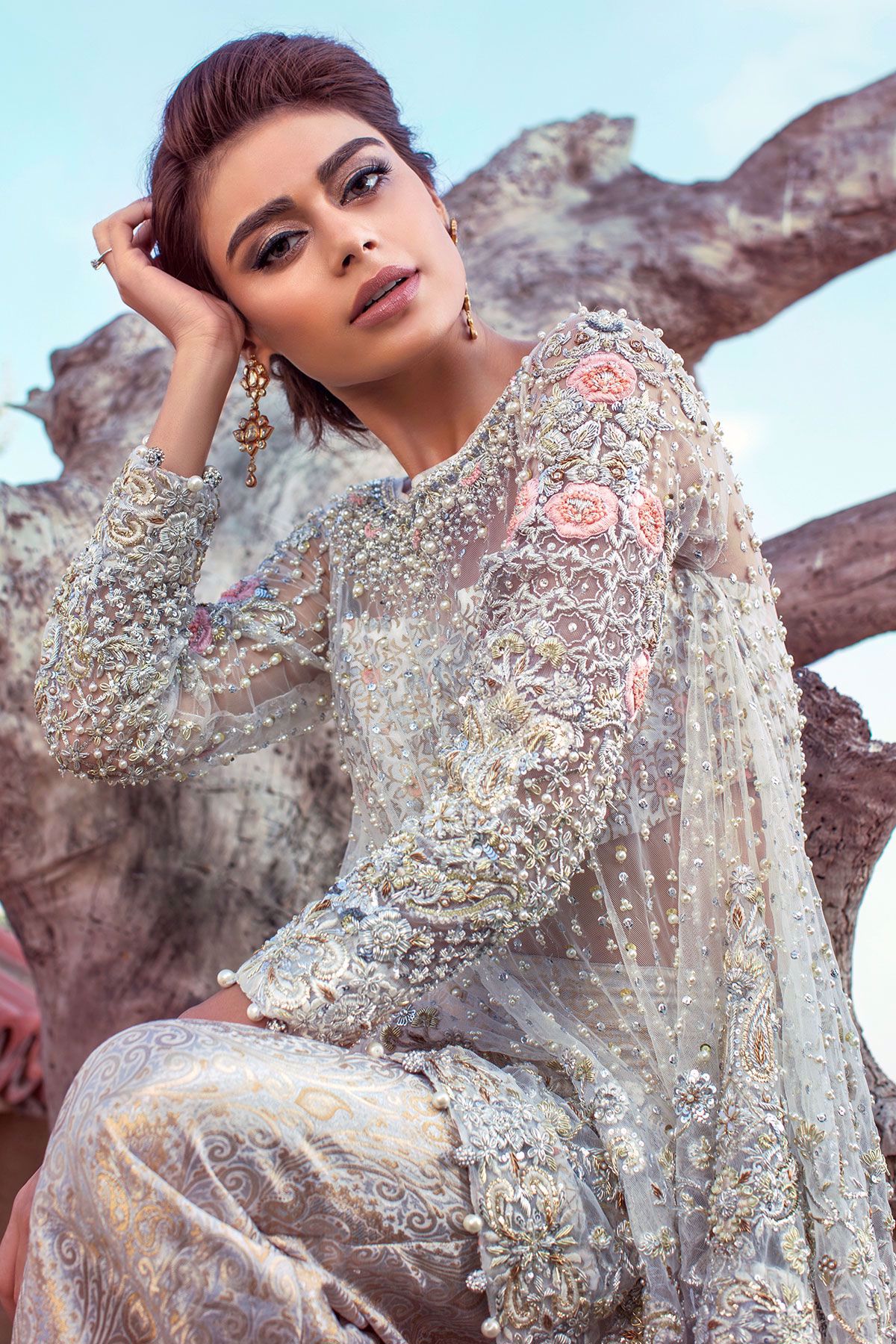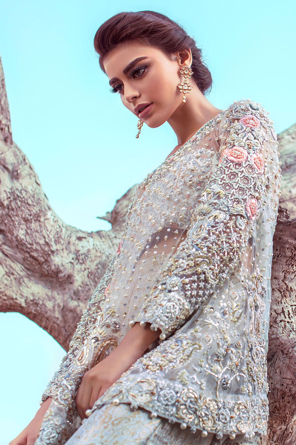 This super stunning silver cloud peplum is definitely worth a wear. This bias cut peplum has self embroidered hemline which is further decorated with pitta, dabka and light catching crystals. The hand-block printed slip is sure to turn heads.  The sleeves are heavily worked with zardoze and resham rosettes. The neckline has pearl work incorporated with light catching crystals and powder peach resham knots. The outfit has overall heavy spray of pearls, sequins and stones.