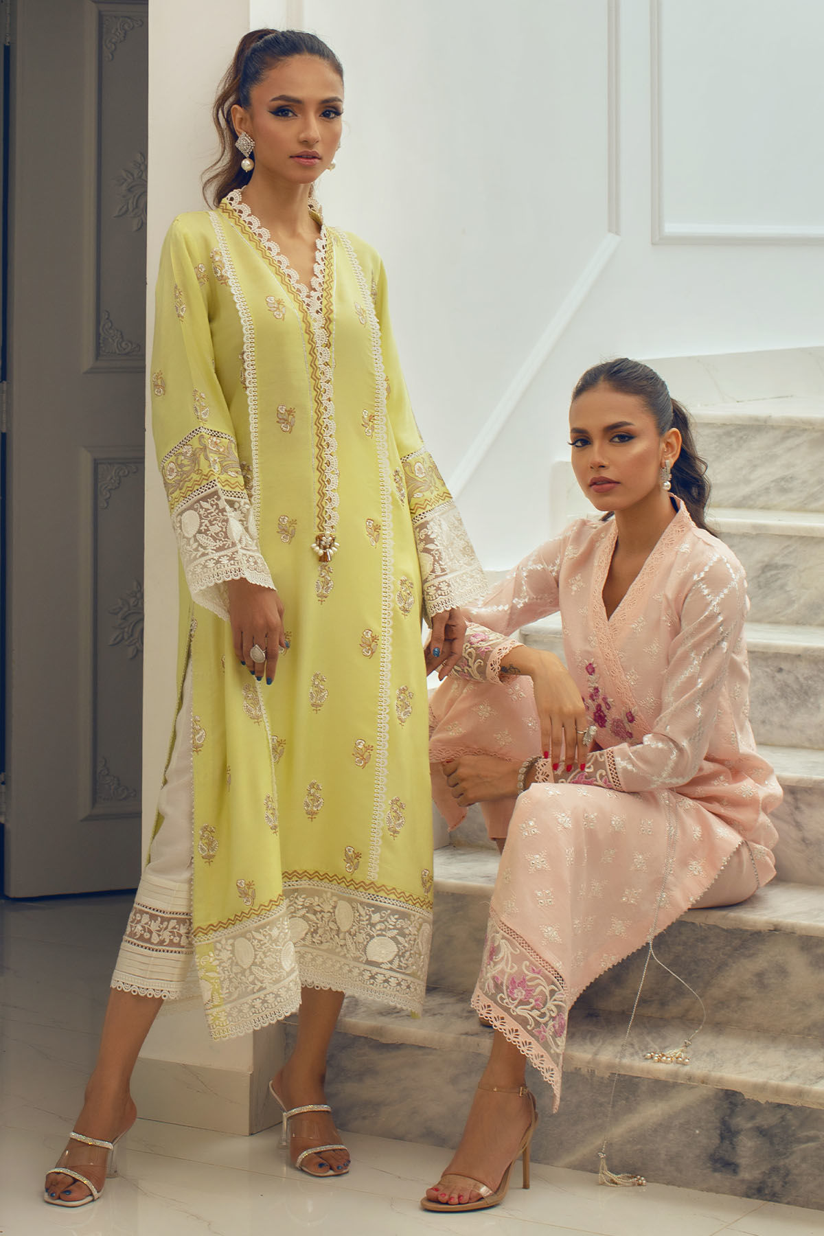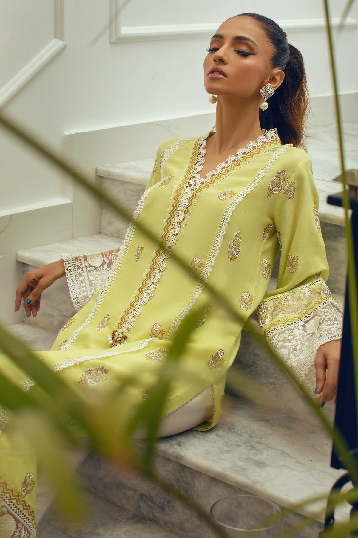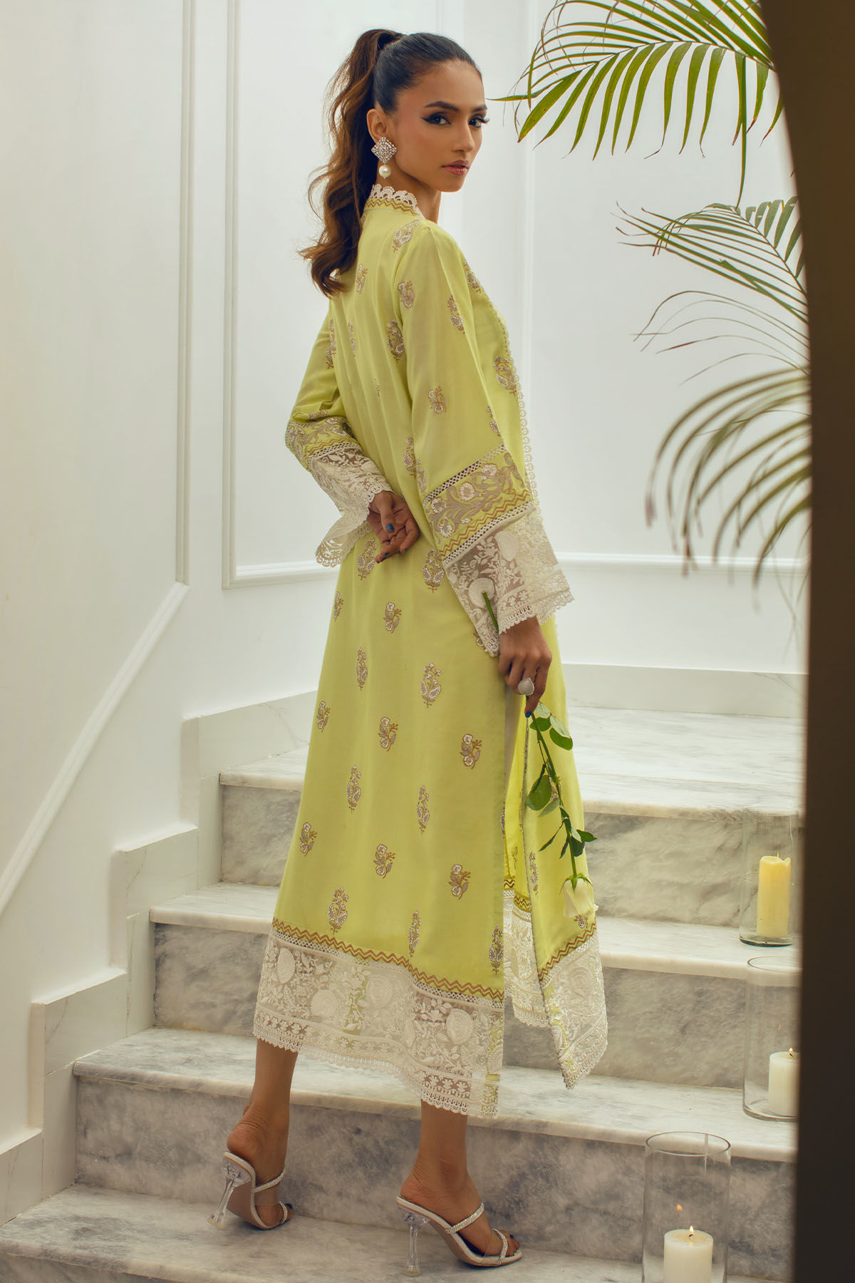 Long silhouette shirt on cotton net canvas in subtle lime shade featuring hand block printed details in golds, silver and whites. The neckline is adorned with gota and lace details and the hemline is set to perfection with embroidered organza panel. The shirt can be paired with Zuri pants featuring pleats and embroidered organza panel finished with lace.
