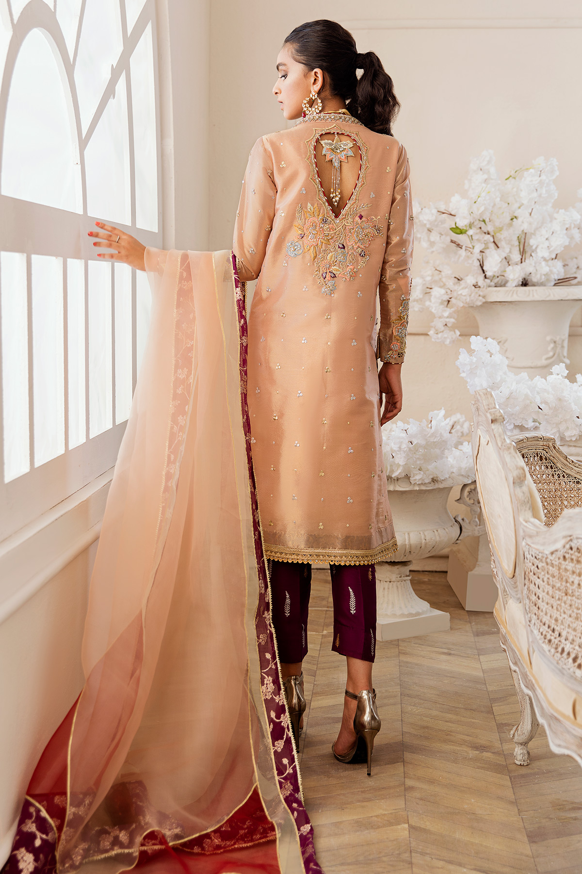 The shirt can be paired with gorgeous back details and is paired with contrasting purple pants featuring hand block printed details and a color blocked dupatta in mint, maroon and aubergine with gota finishing’s.