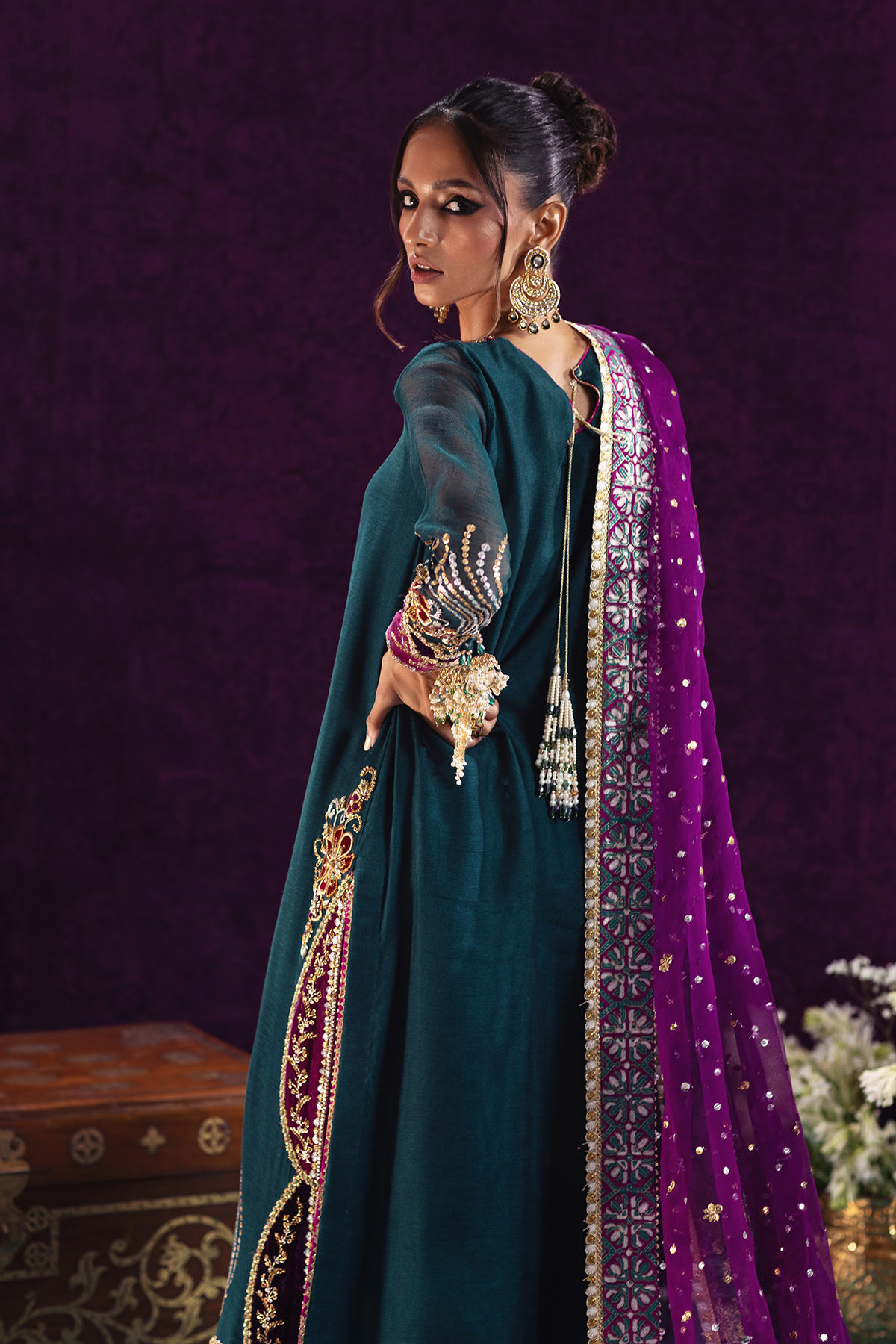 A-Line shirt on pure silk net canvas in deep emerald featuring classic hyderabadi neckline. The hemline is adorned with velvet appliqué details. The sleeves are adorned with handcrafted dangling jewel pieces. The shirt can be paired with matching izaar featuring classic gota details. The outfit is paired with contrasting organza dupatta featuring block print and sequins details.