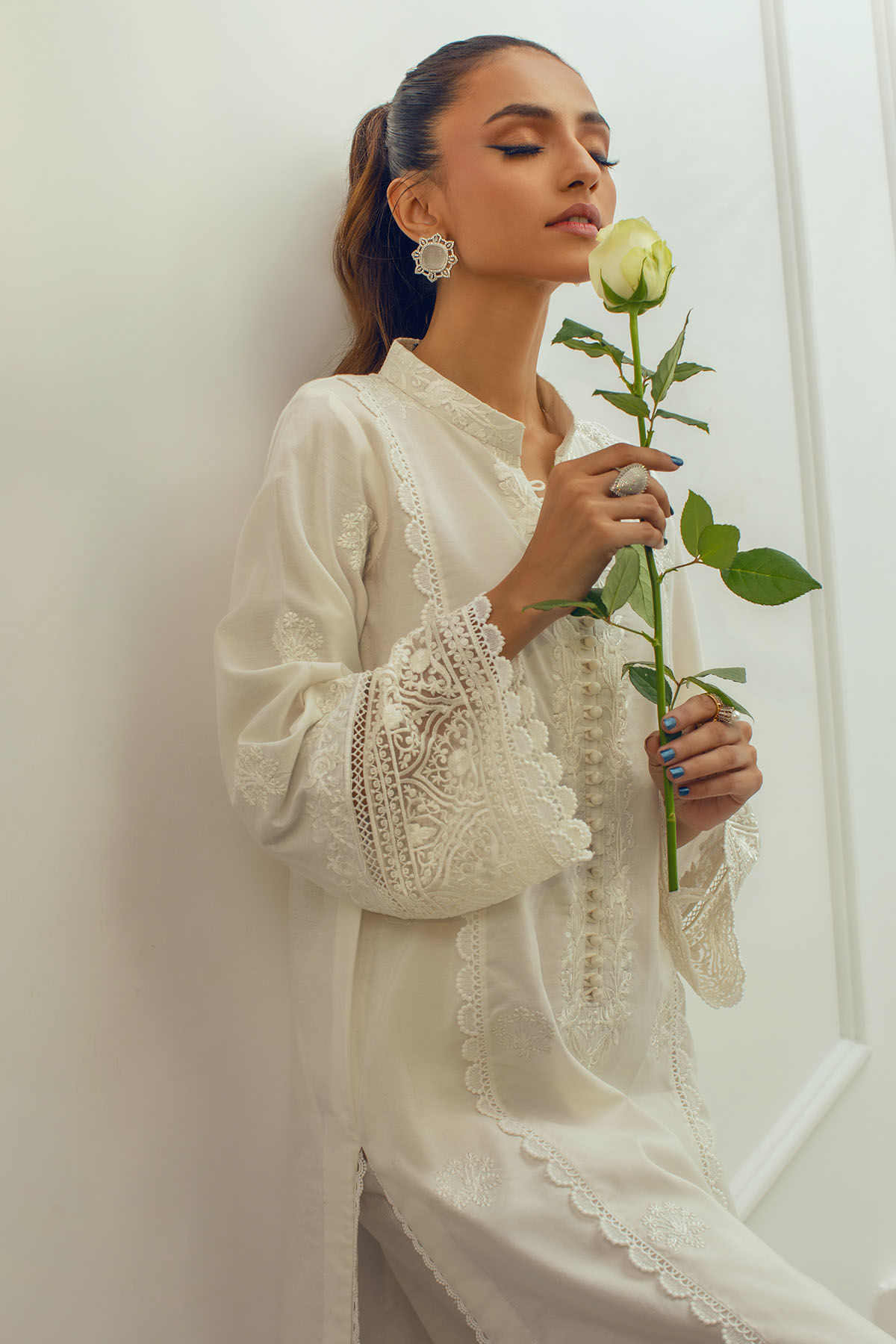Long silhouette cotton net kurta on opulent white canvas featuring self-embroidered details on neckline and centre front, the neckline is adorned with loop buttons details and the hem is enhanced with pure organza embroidered panel.