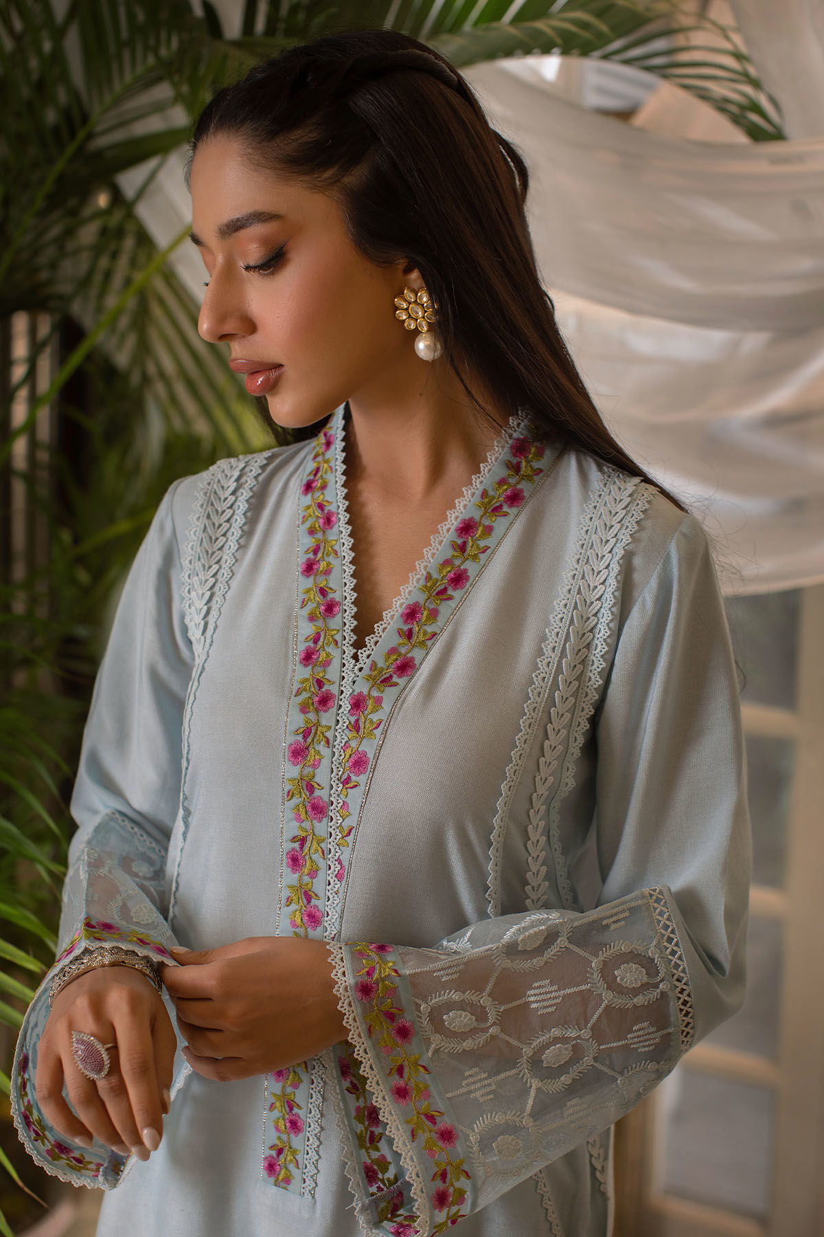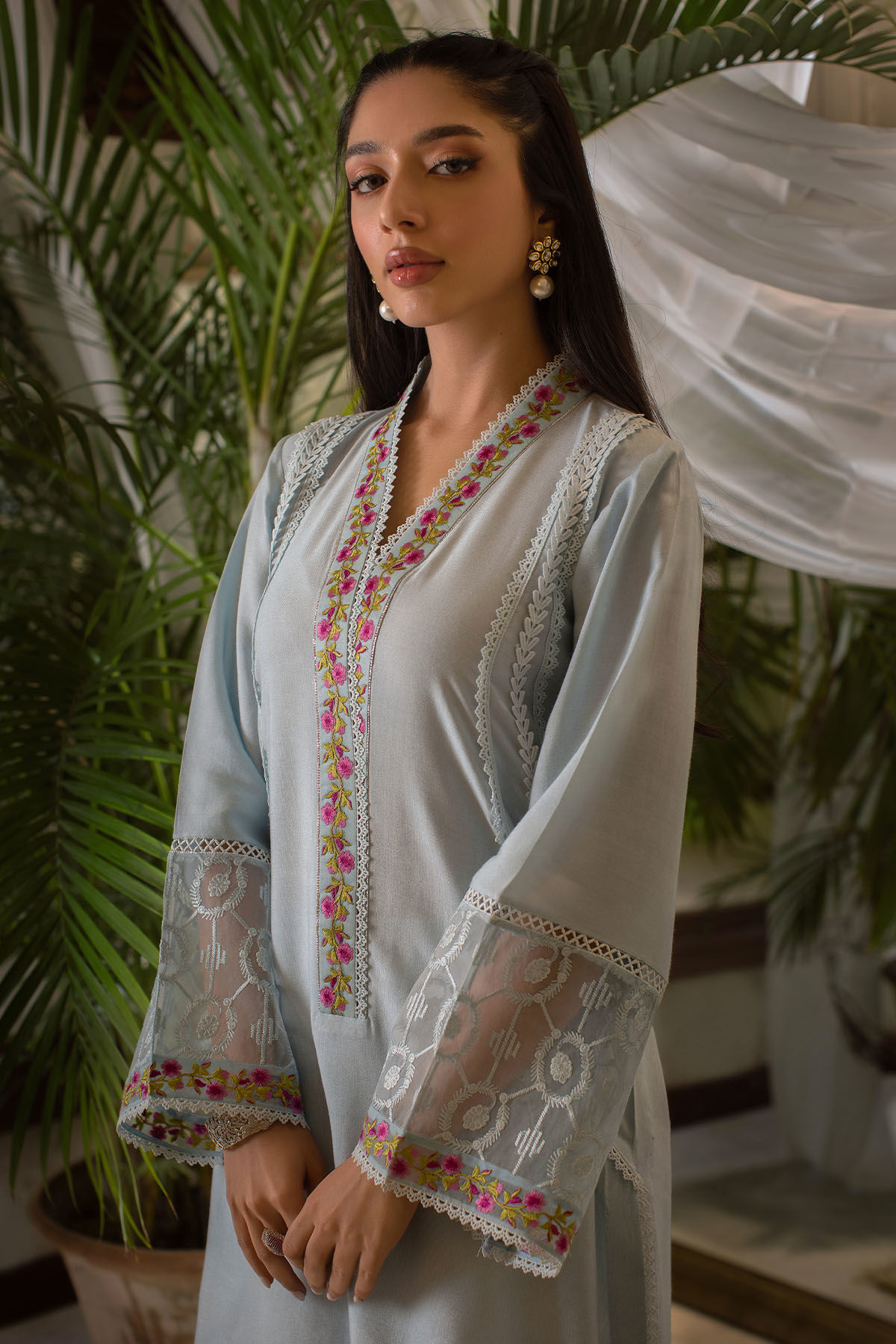 Long silhouette cotton net shirt in gorgeous shade of ocean blue featuring silk thread embroidered neckline. The center front is adorned with different crochet laces merged together to create a stunning pattern. The shirt can be paired with Neha izaar featuring laces and embroidered organza panel incorporated with pleats.