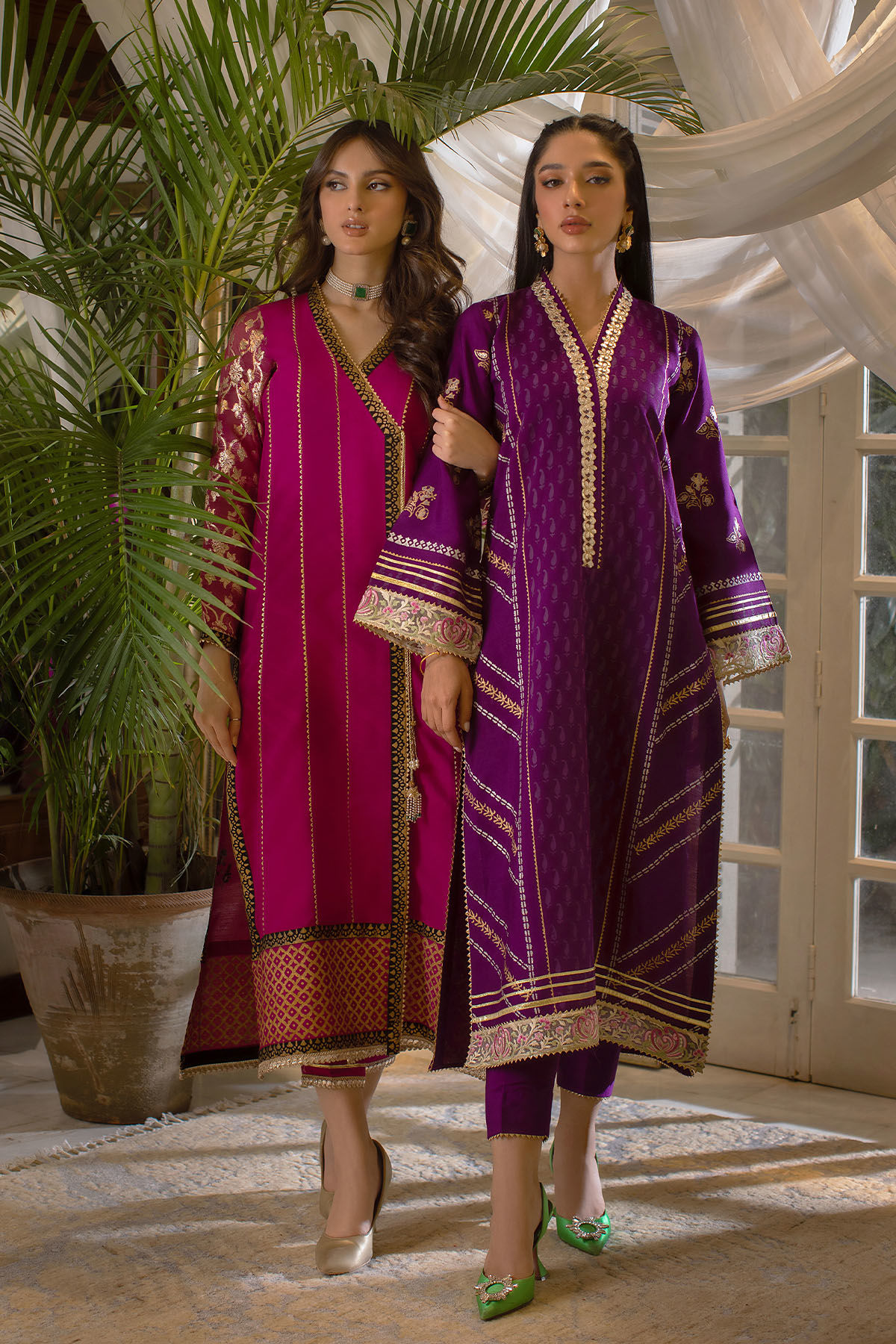 Straight silhouette cotton net shirt in deep purple shade featuring self hand block printed details on center panel, the side panels are enhanced with silver and gold hand block printed details. The hem is adorned with multicolored embroidery panel and gota details. The neckline is enhanced with gold festive lace and the shirt can be paired with straight pants with gota edging.