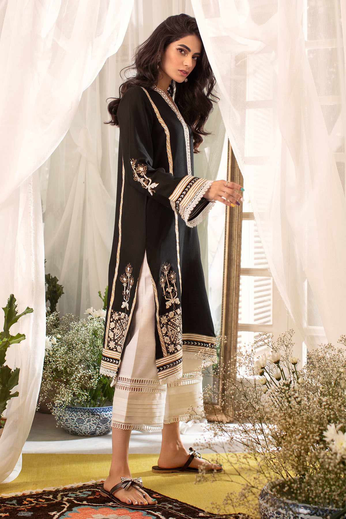 Straight silhouette cotton net shirt featuring hand block printed details in gold silver and white enhanced with crochet laces.