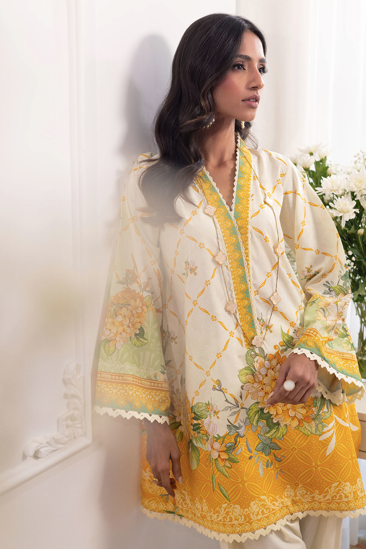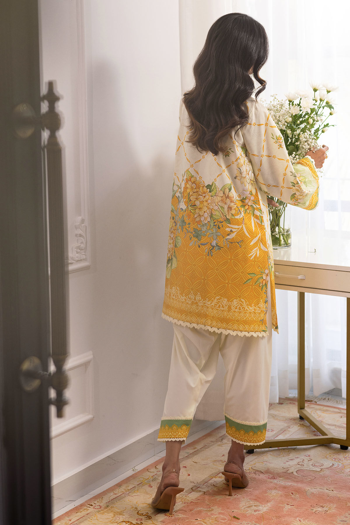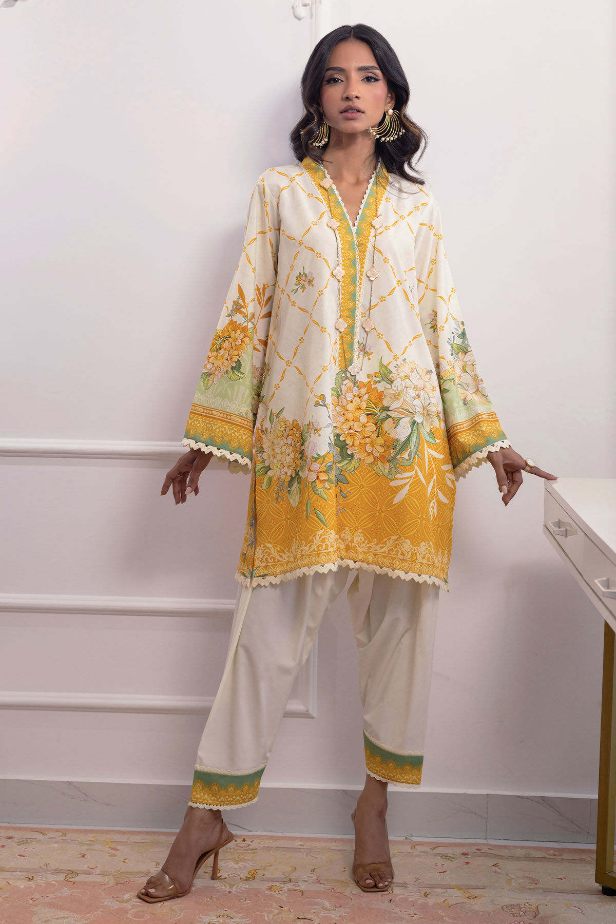 Experience the allure of our short-length shirt, beautifully showcasing exquisite floral and geometrical patterns in a rich creme and ochre canvas. Elevating its charm, the neckline is adorned with delicate lace details that add a touch of sophistication. When paired with coordinating shalwar, this ensemble guarantees to turn heads and make a stunning statement wherever you go.