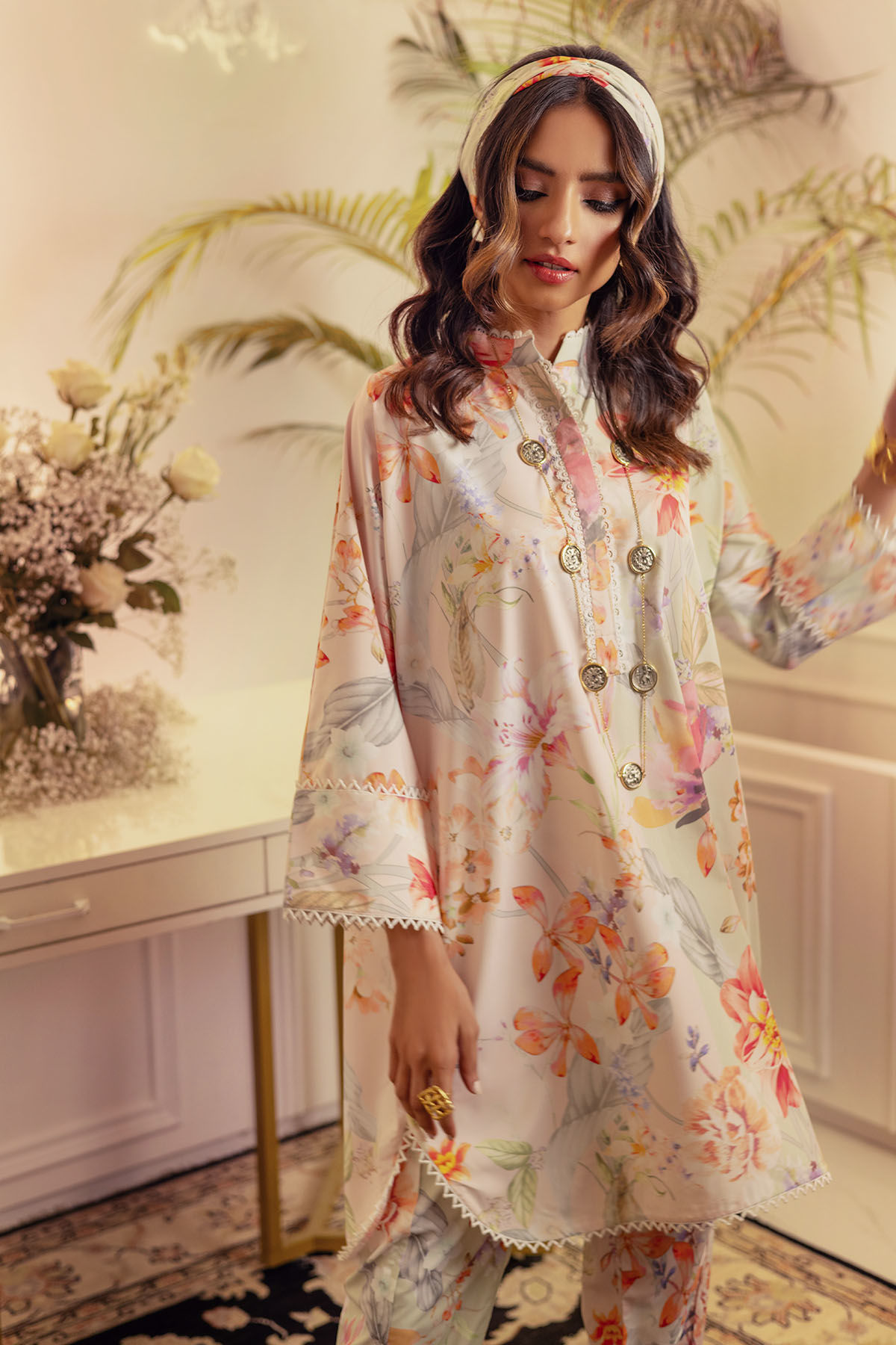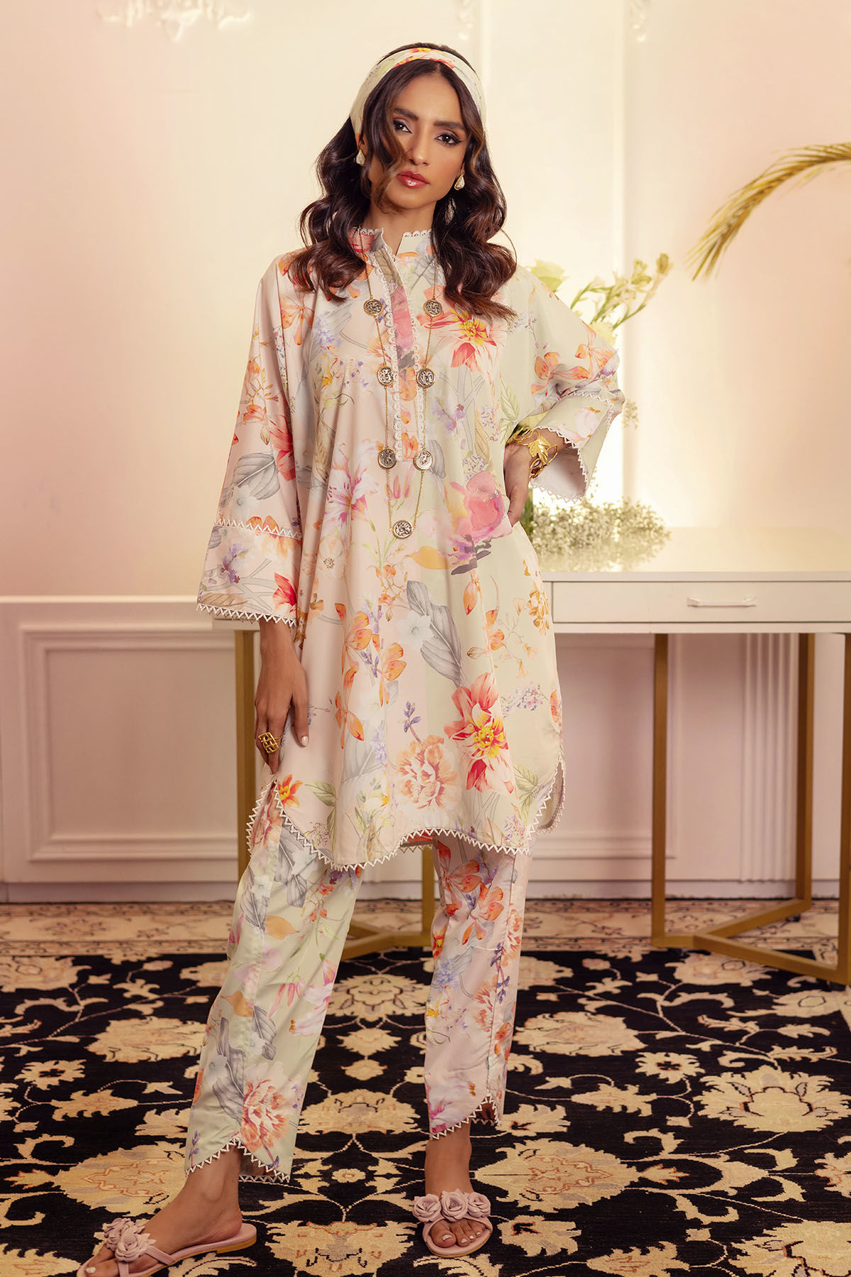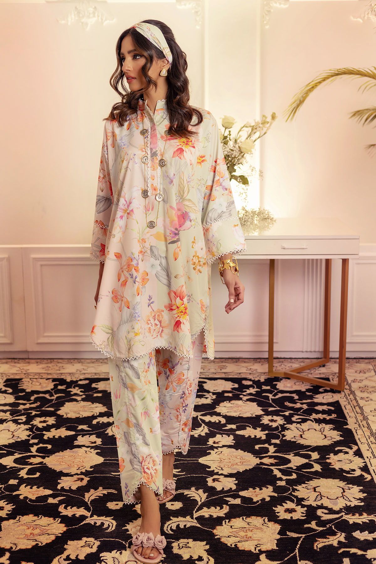Half mint and half peach asymmetrical floral co-ord set featuring floral details. The neckline is adorned with lace details and the shirt is paired with tulip shalwar featuring lace details.