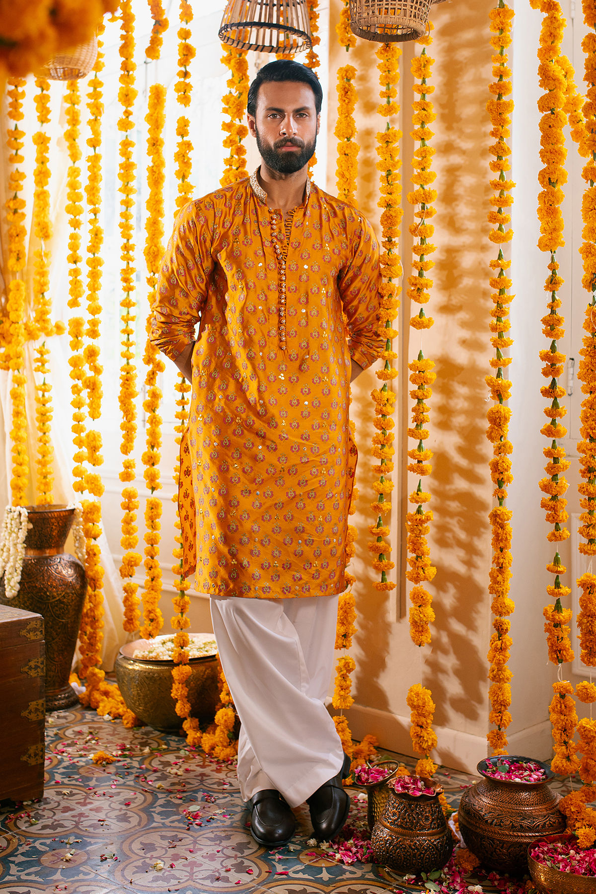 Old school classic zardozi and kaamdani details on burnt orange block printed silk canvas.