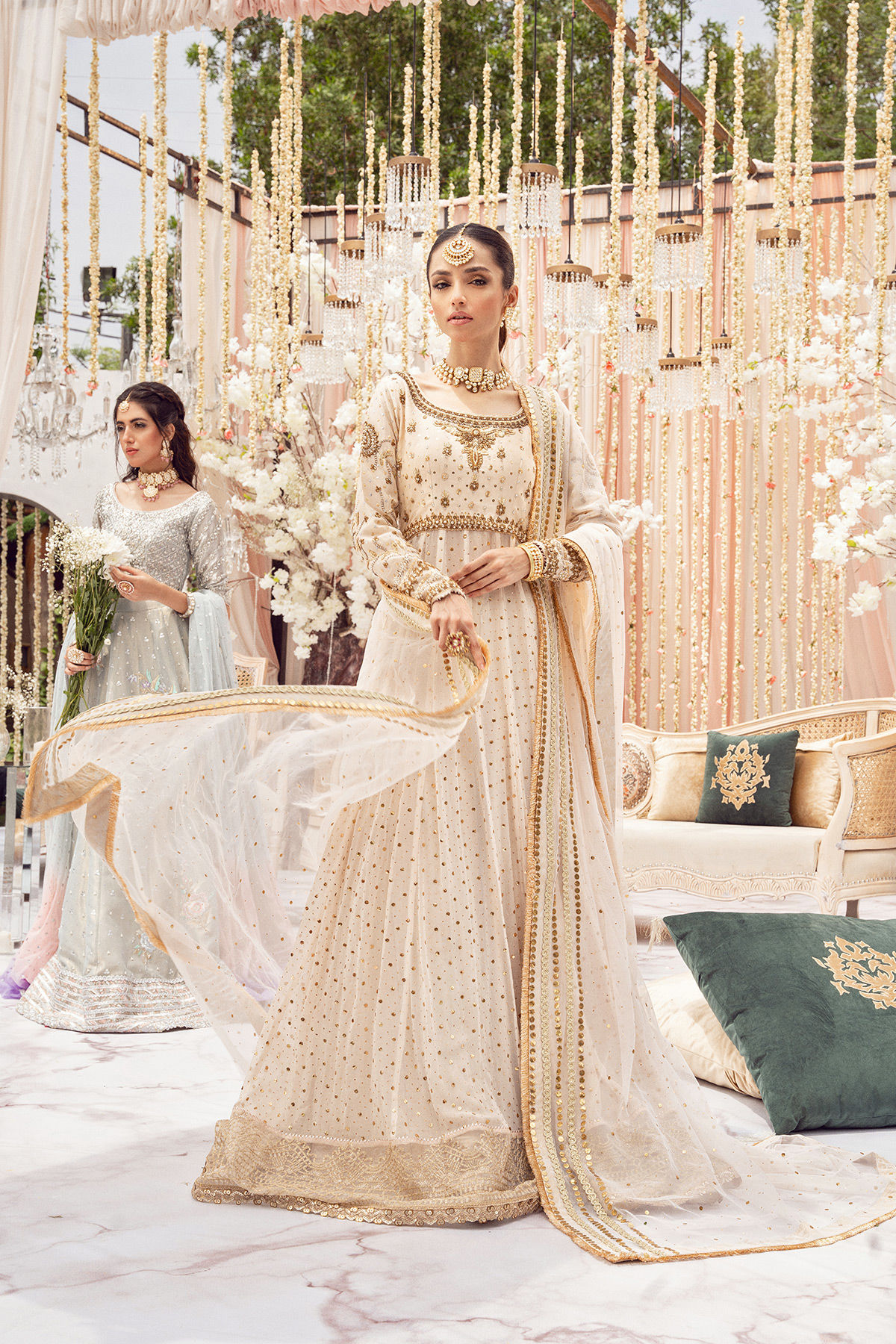 Old school details to take your breath away; this ivory chiffon peshwas features gorgeous kaamdani details on front and back. The cotton net bodice is adorned with antique and gold zardozi embroidery. The peshwas is paired with net kaamdani dupatta with laces and kiran details.