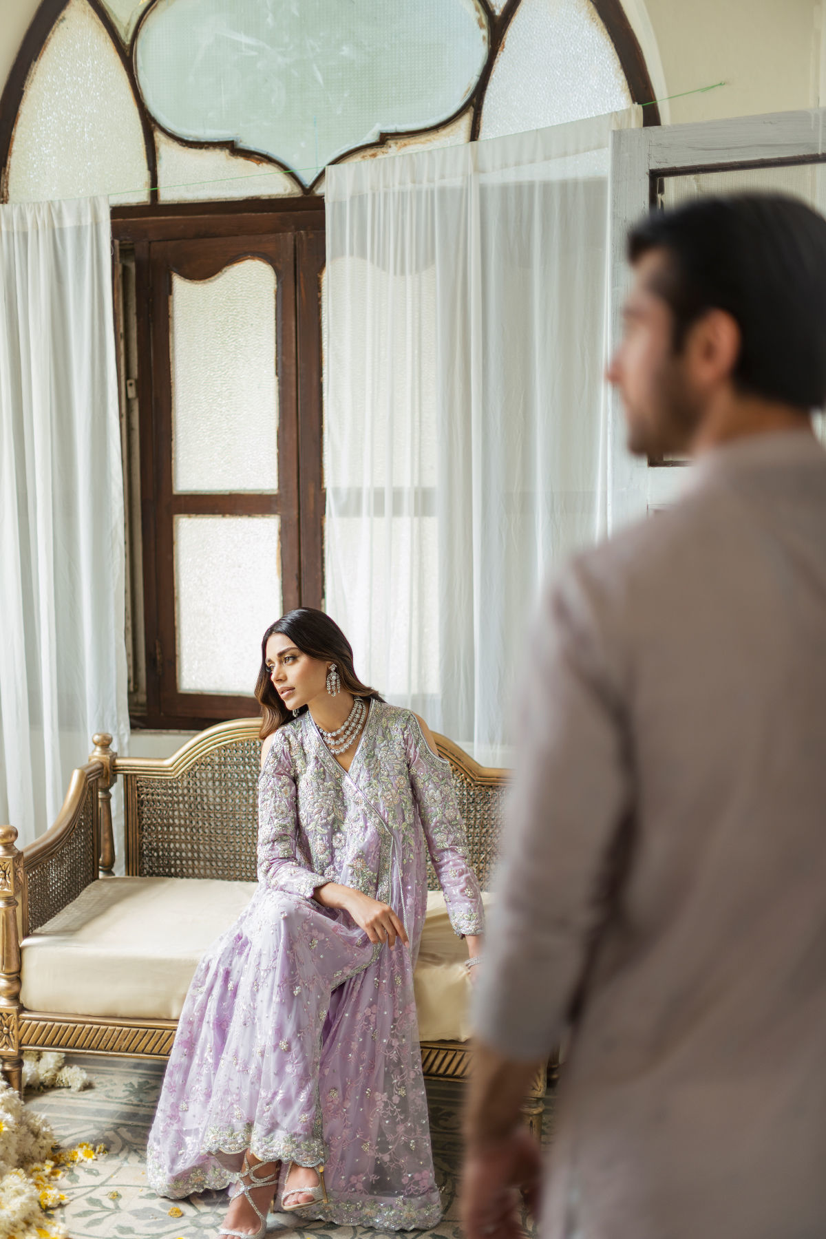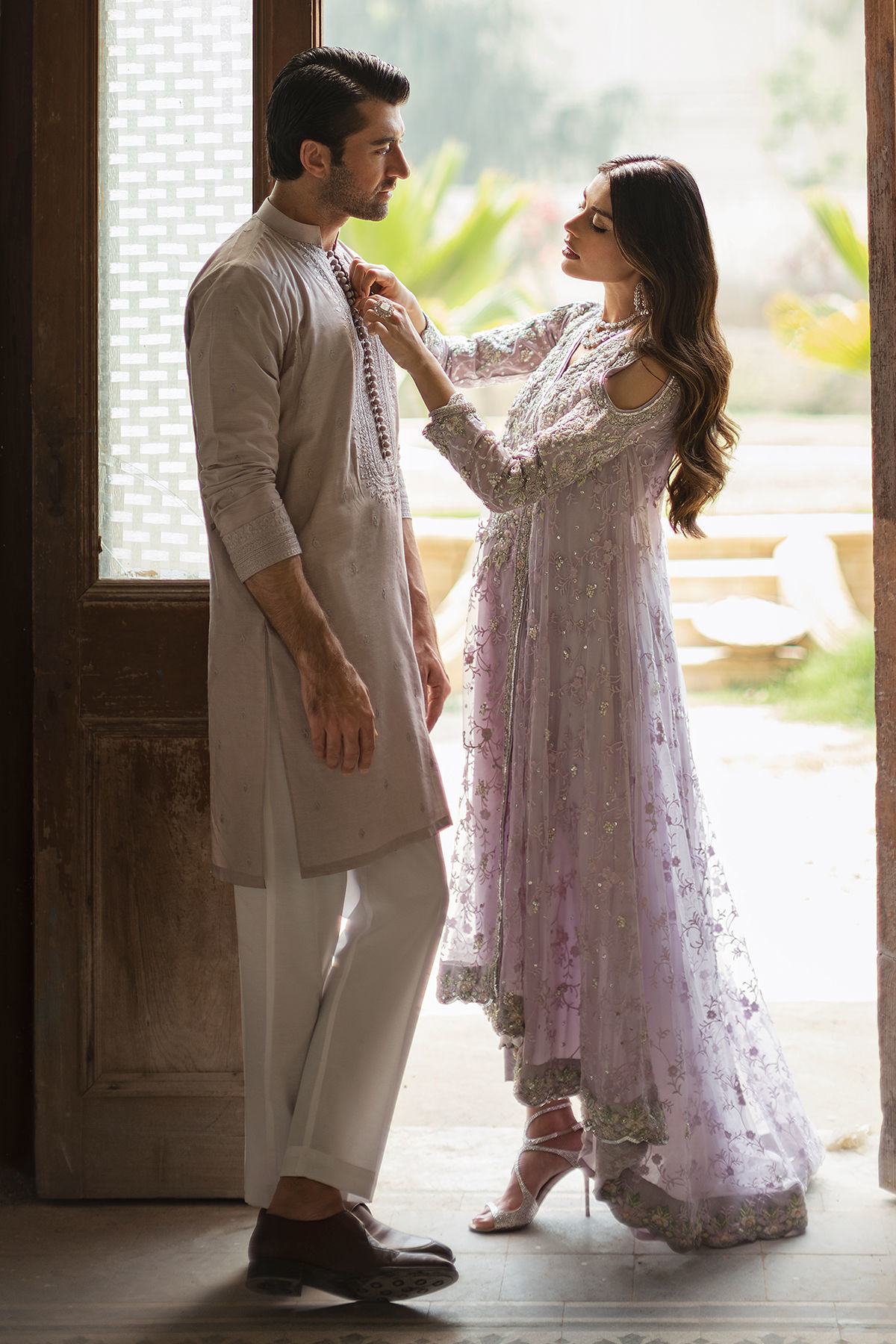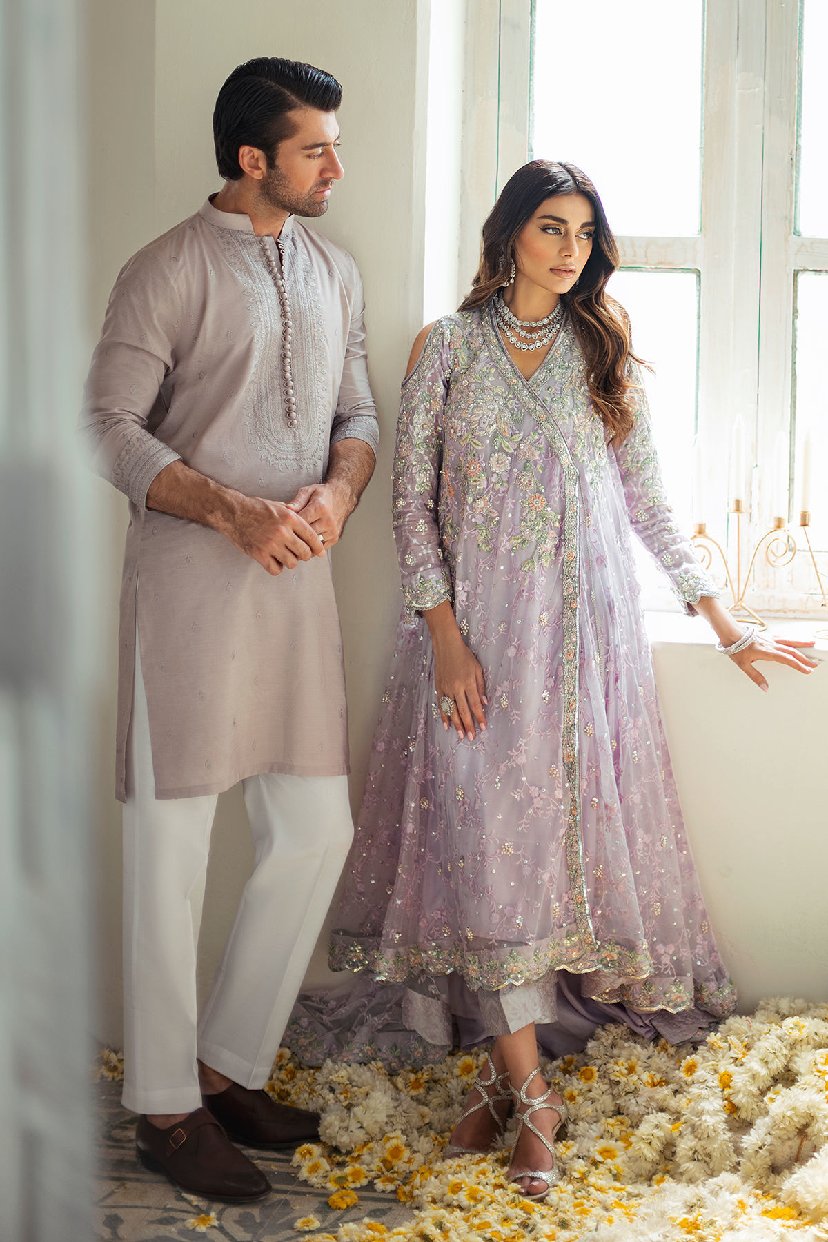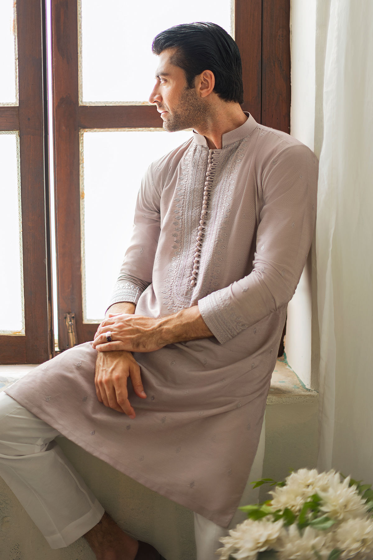 Subtle violet kurta on cotton net canvas featuring silk thread embroidered details on neckline and back. The kurta is enhanced with loop and handcrafted button details and can be paired with white cotton pants.