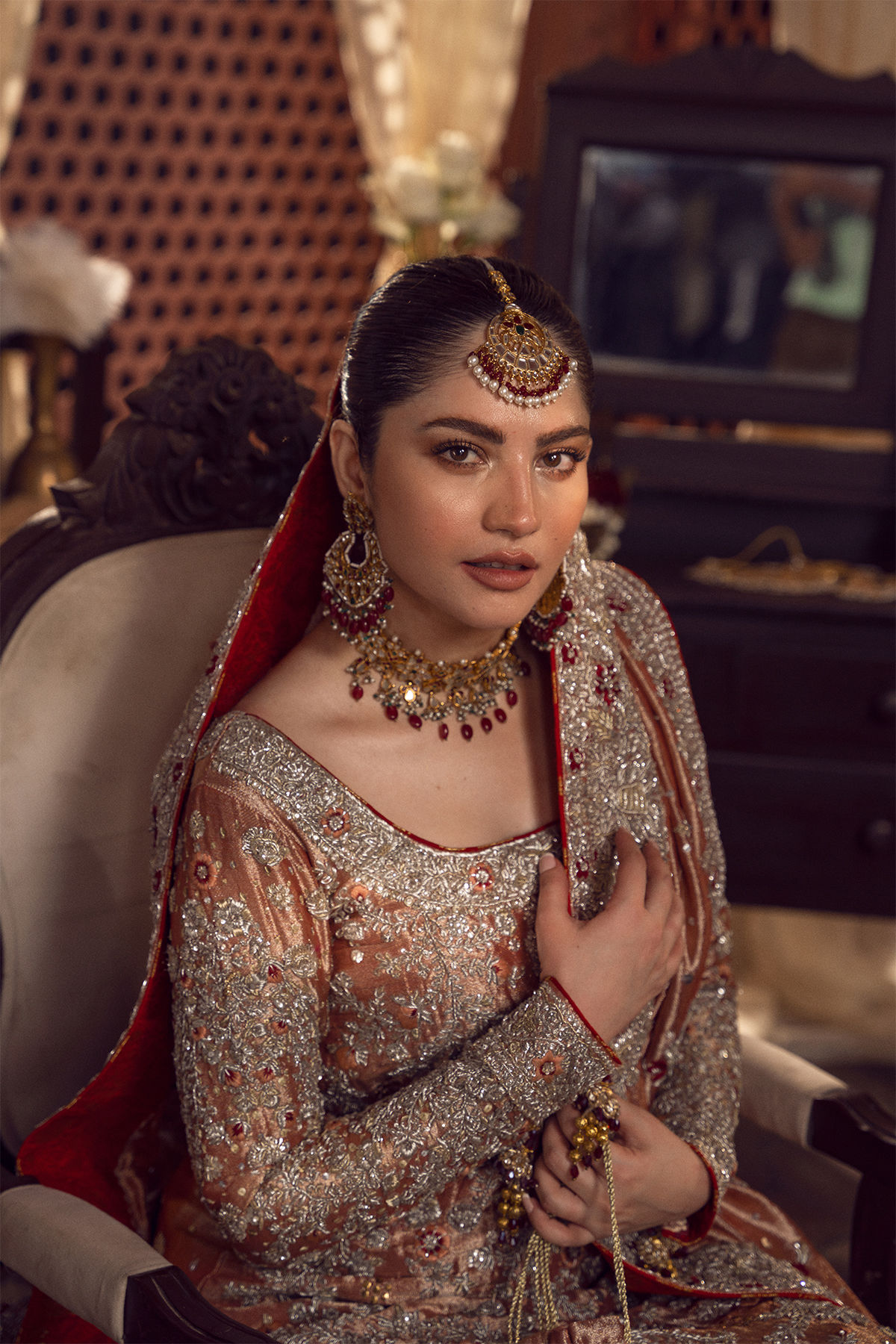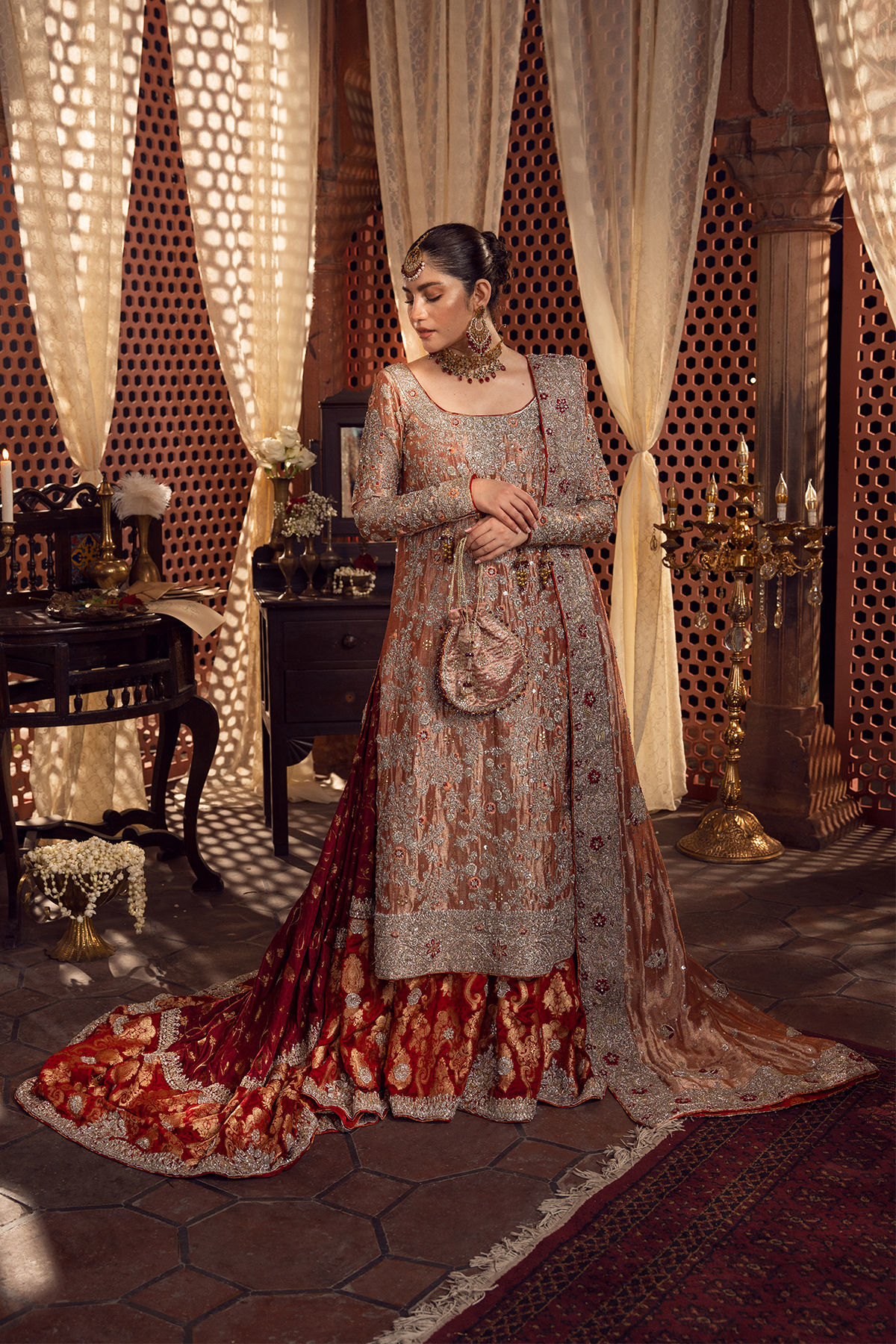 Long shirt in metallic peachy gold colour featuring all silver zardozi details enhanced with kaamdani and silk thread embroidered rosettes. The shirt is paired with maroon and red farshi lehnga featuring zardozi embroidered bunches . The lamé dupatta is enhanced with heavily embroidered silver zardozi borders and motifs.