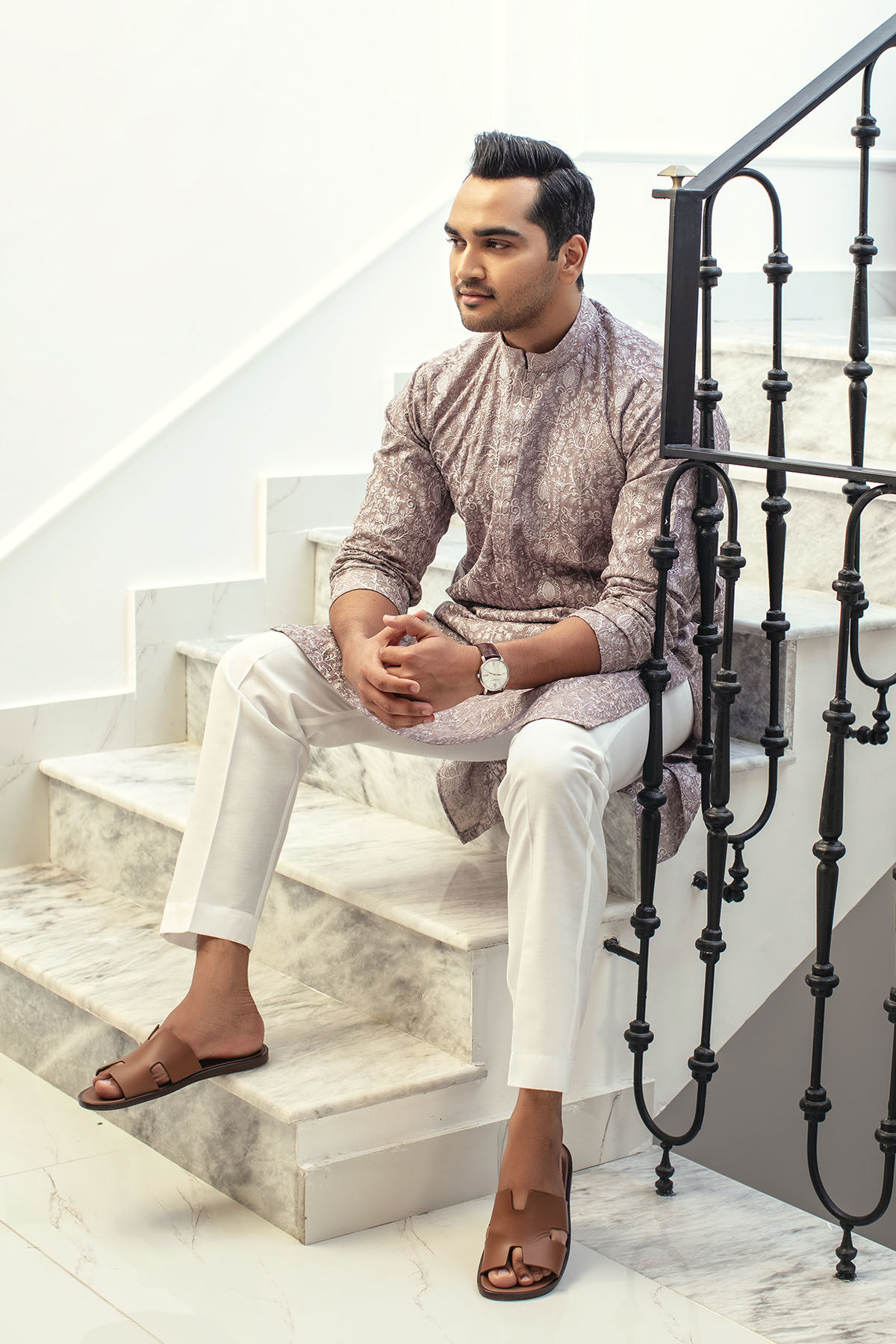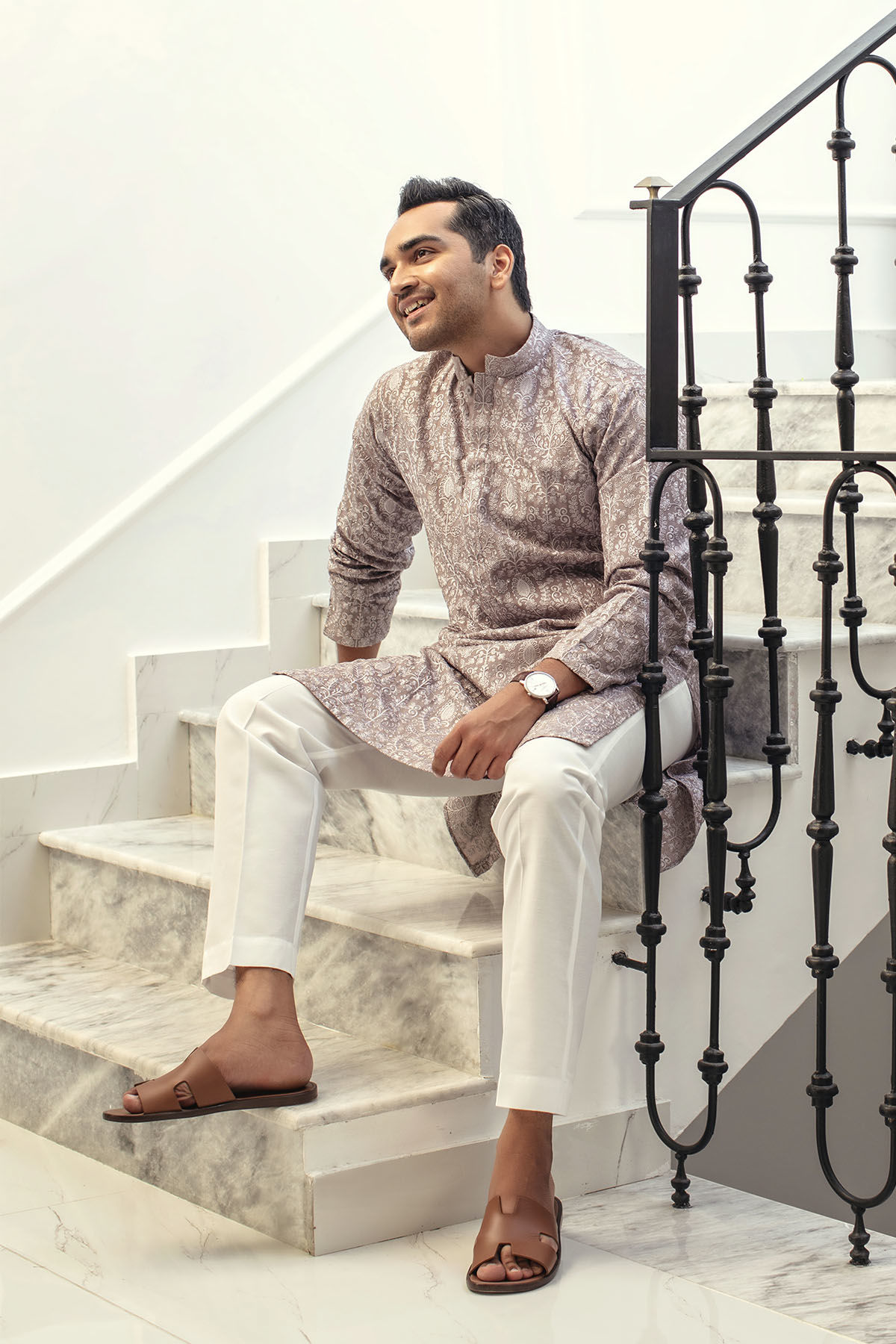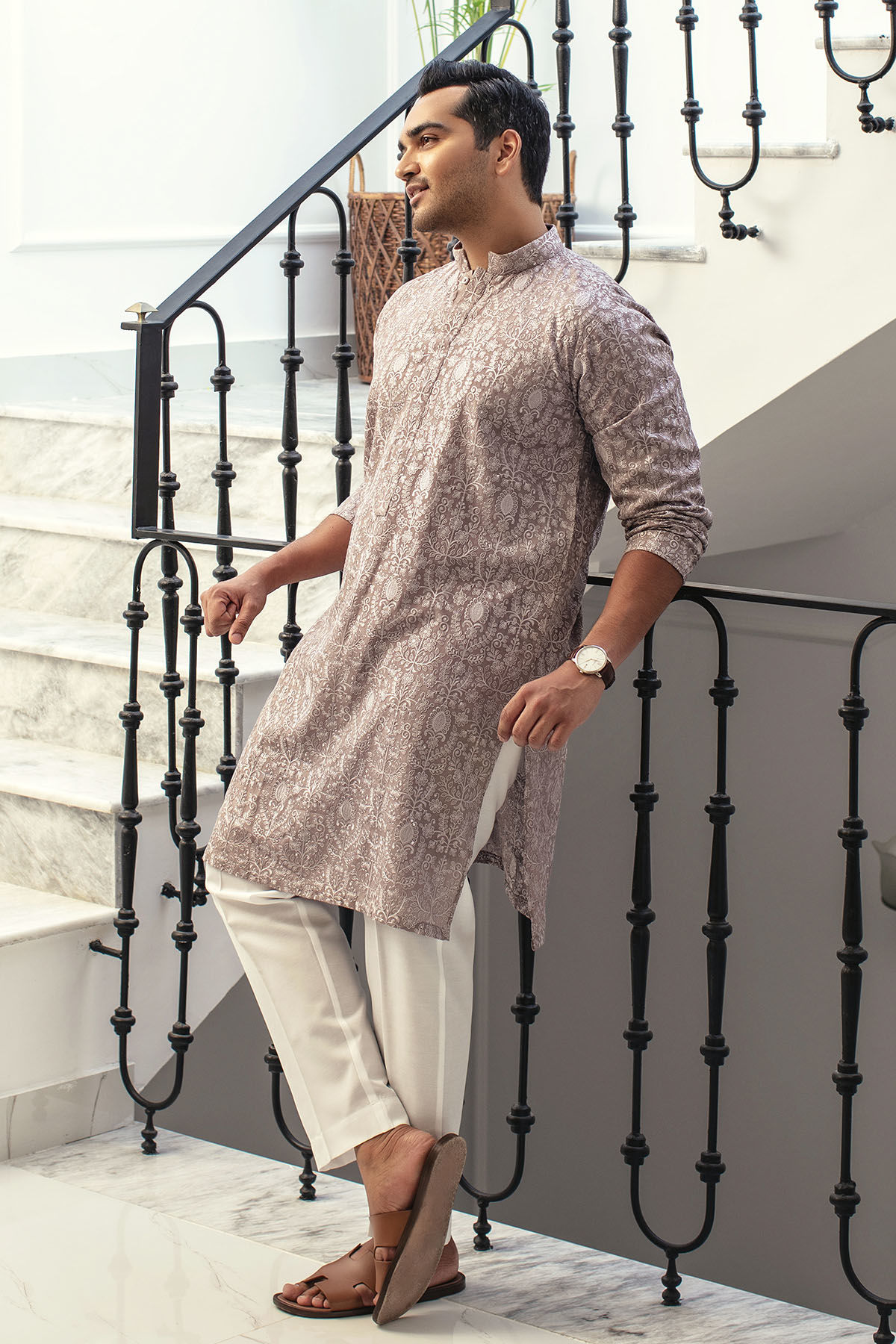 Embroidered raw silk kurta in subtle grey shade featuring self-pattern details adorned with light catching sequins.