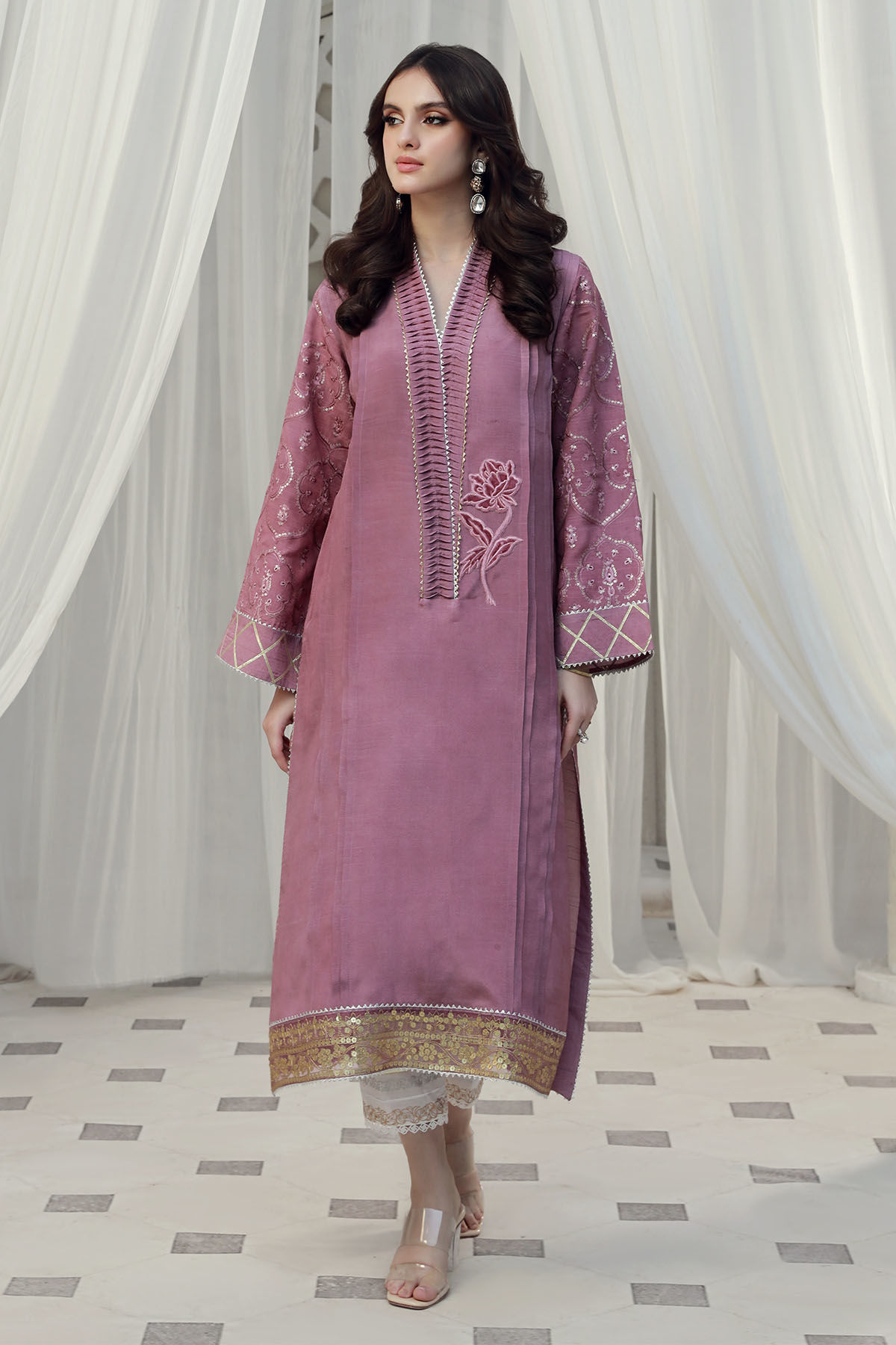 Long silhouette shirt on raw silk canvas in onion pink shade featuring fabric manipulation details on neckline. The centre front is adorned with velvet appliqué details and the hem is decorated with sequins and zari panel. The centre front is enhanced with pleats detailing. The shirt can be paired with soneri pants for a festive look.