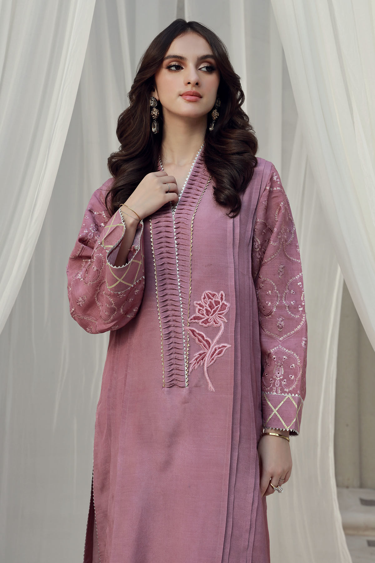 Color: Onion Pink Fabric: Raw Silk Work Details: Appliqued