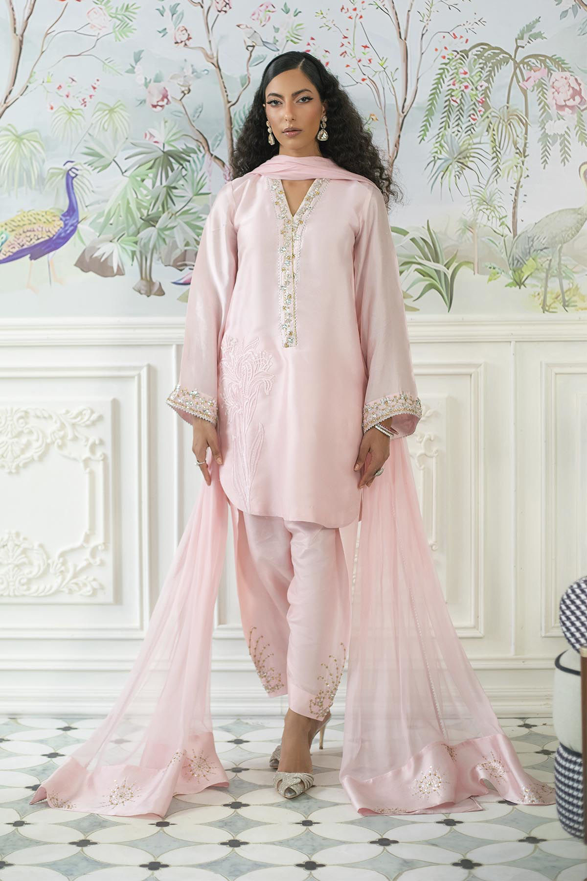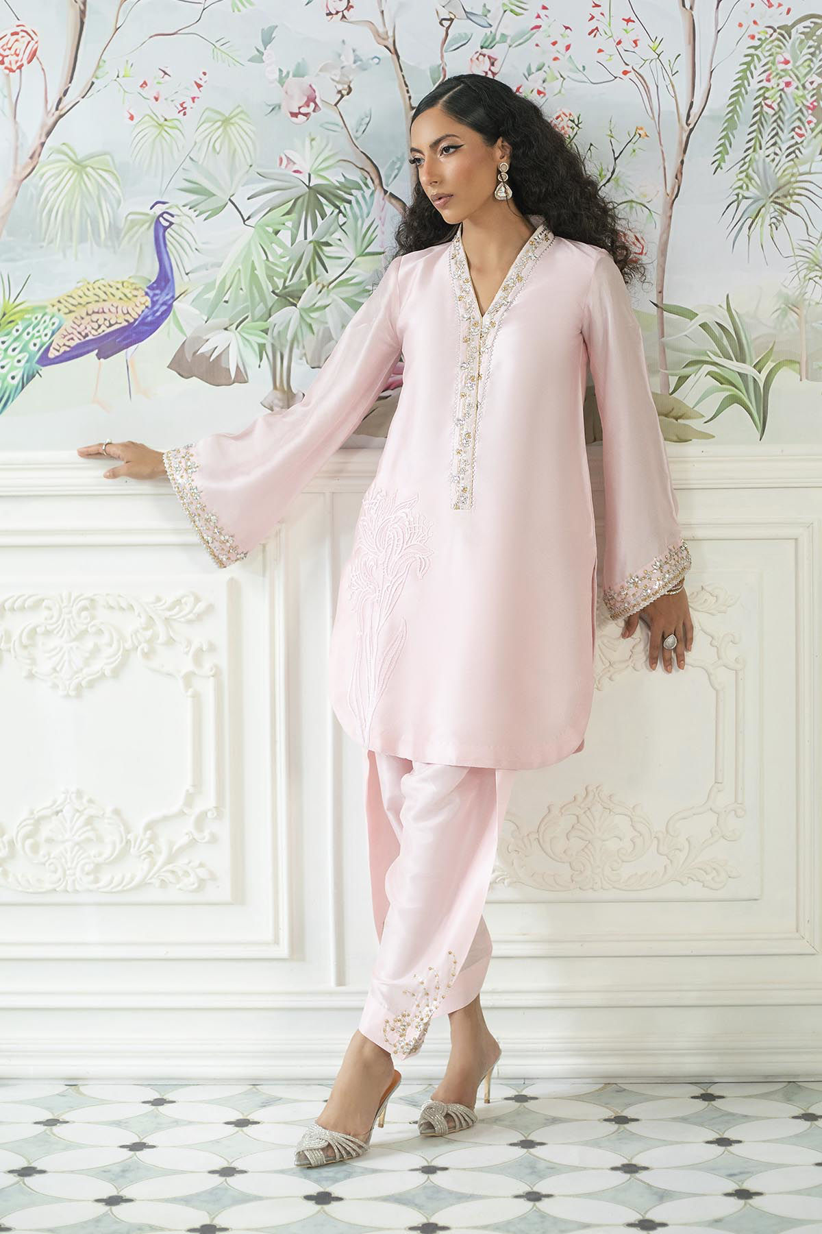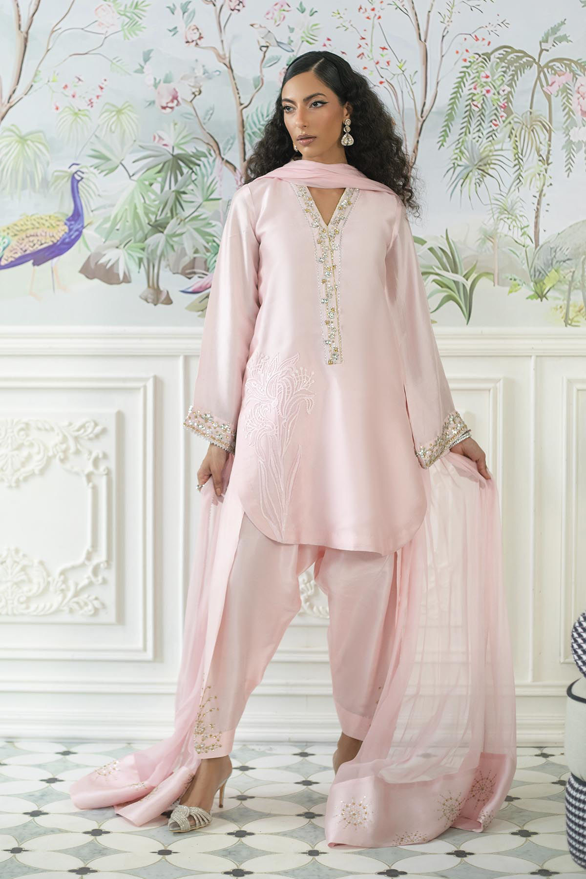 Knee-length shirt in a subtle rose pink hue, featuring light-catching crystal and sequin embellishments at the neckline. The side slits are elegantly adorned with appliqué details. This shirt is complemented by sheesha silk shalwar, intricately handcrafted with lotus designs in crystals and sequins. Additionally, the outfit includes a chiffon dupatta, which showcases meticulous handwork on each pallu, crafted from pure silk panels.