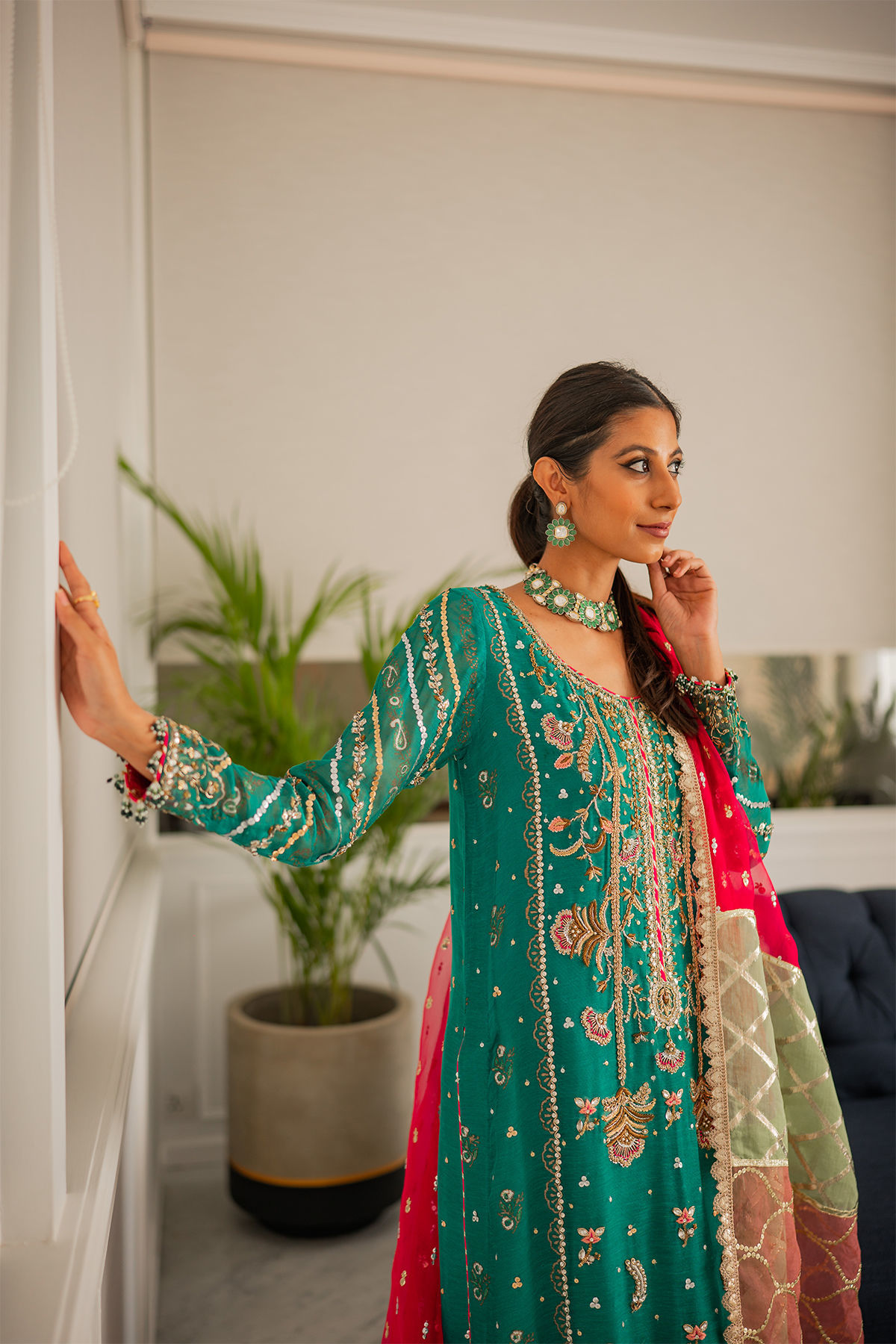 Long length A- Line shirt in gorgeous shade of green is adorned with hand block printed details and further adorned with zardozi and single thread neckline. The shirt can be paired with Magenta crushed izaar featuring old school gota details. The colour blocked dupatta in shades of fuchsia, mint and coral with sequins and gota details complete the look.