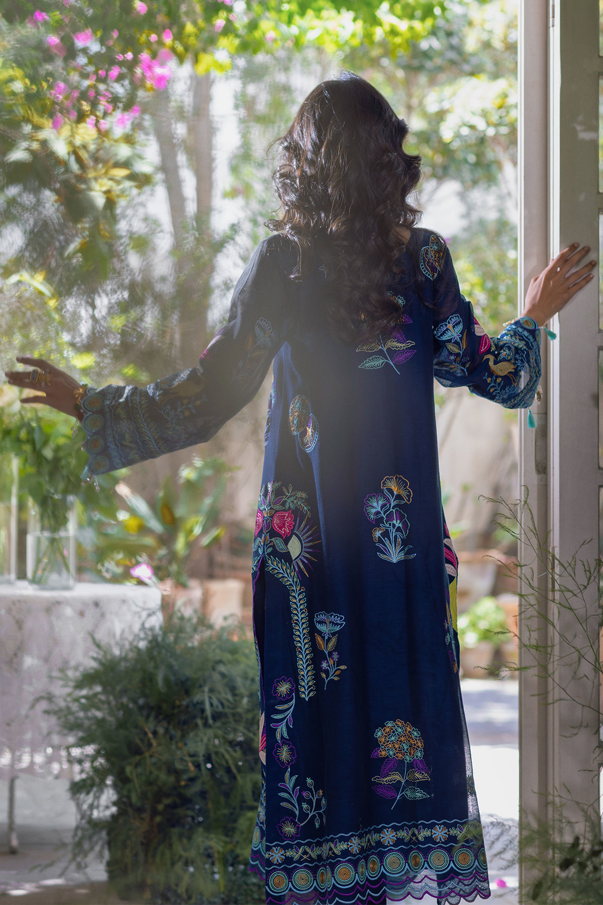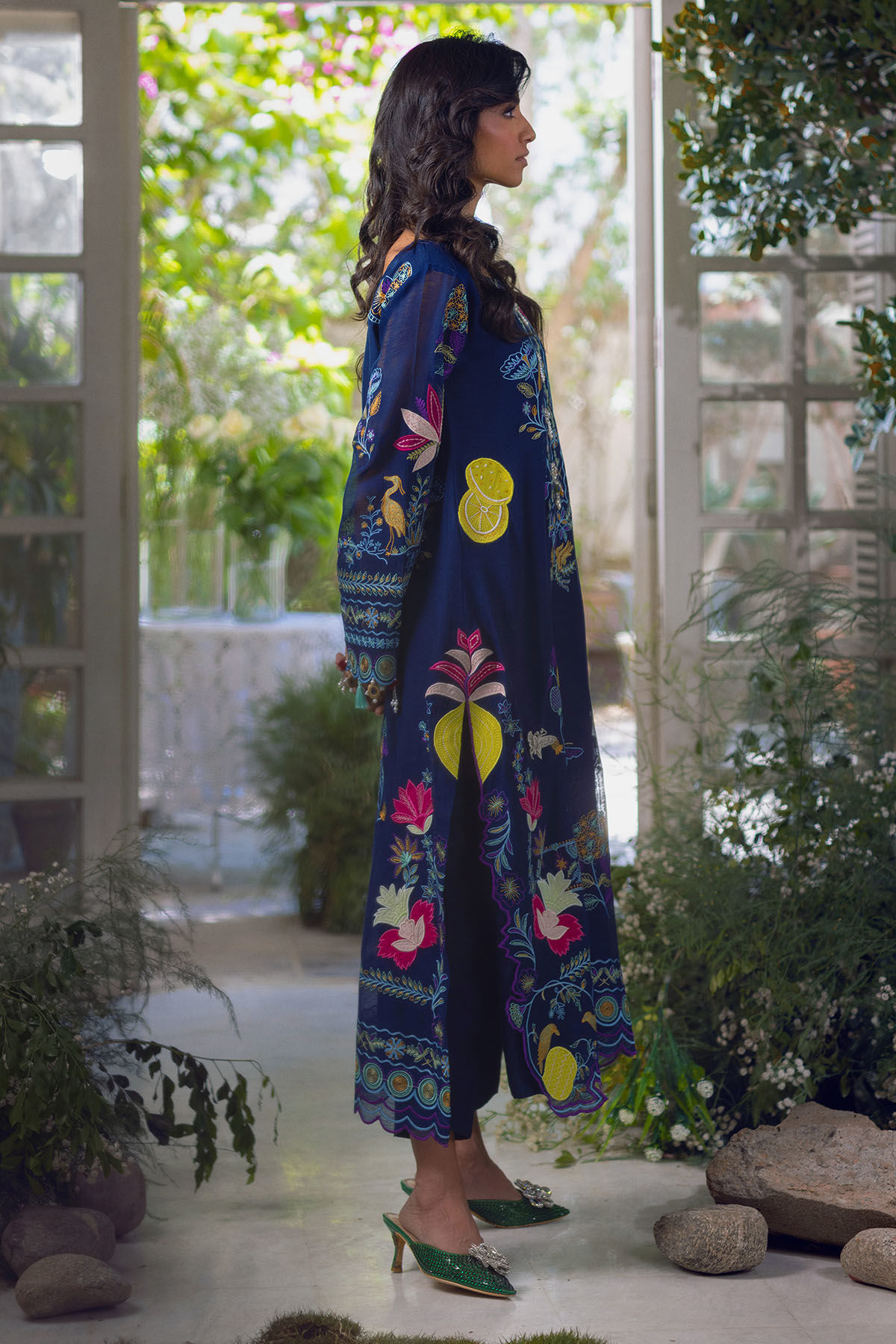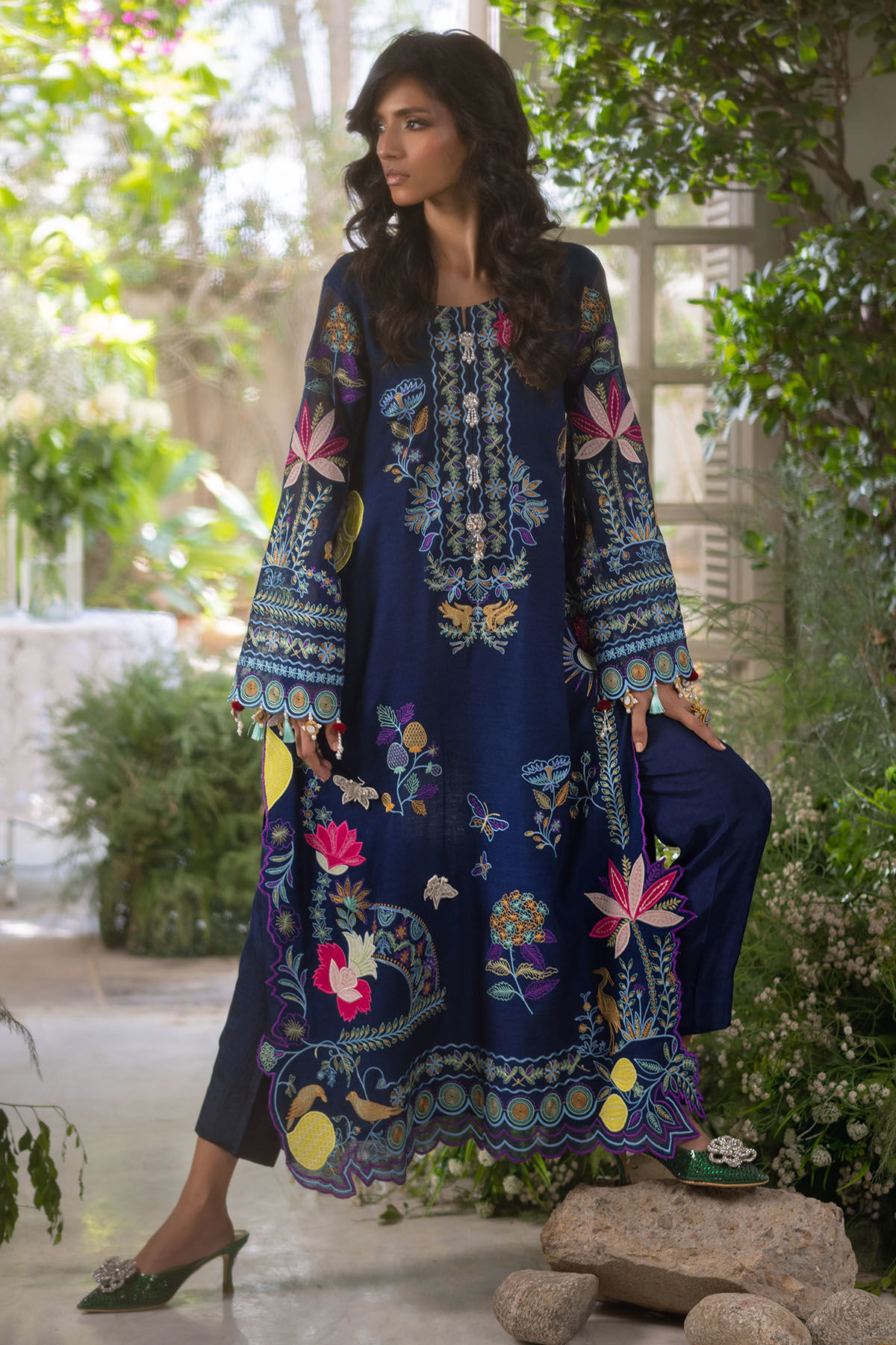 Long silhouette shirt in a rich midnight blue on pure silk net, showcasing an exquisite array of embroidery and meticulously hand-embellished details. The center front is elegantly adorned with appliqué designs in a captivating pattern. The sleeves are embellished with handcrafted tassels, and the shirt is accompanied by straight matching raw silk pants to enhance the overall aesthetic.