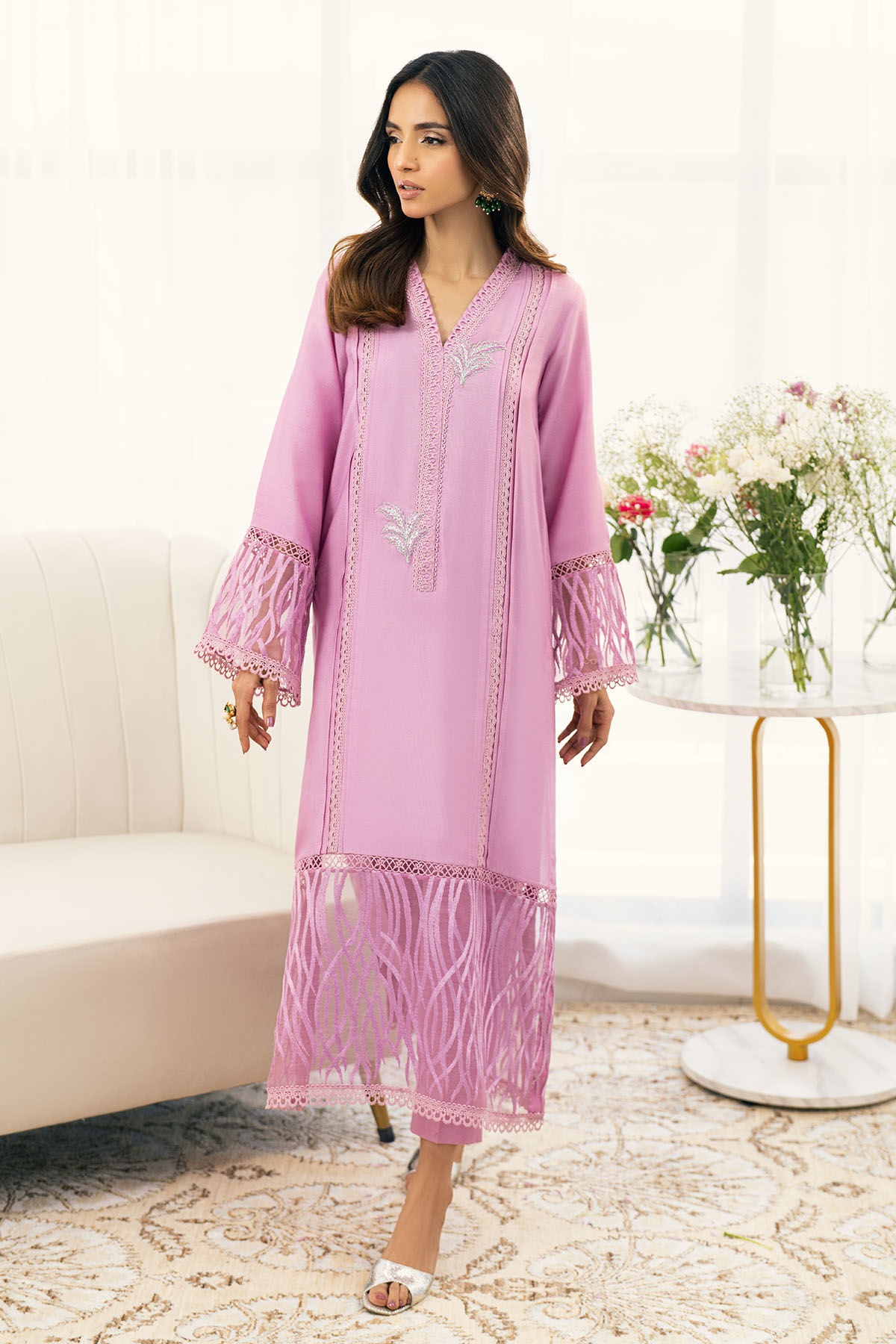 Long silhouette cotton net shirt in a pretty sorbet pink shade featuring lace details on centre front. The hemline is adorned with organza panel and finished with lace details. The neckline is further adorned with handcrafted leaf embellished details in silk thread and zari. The shirt can be paired with straight matching pants.