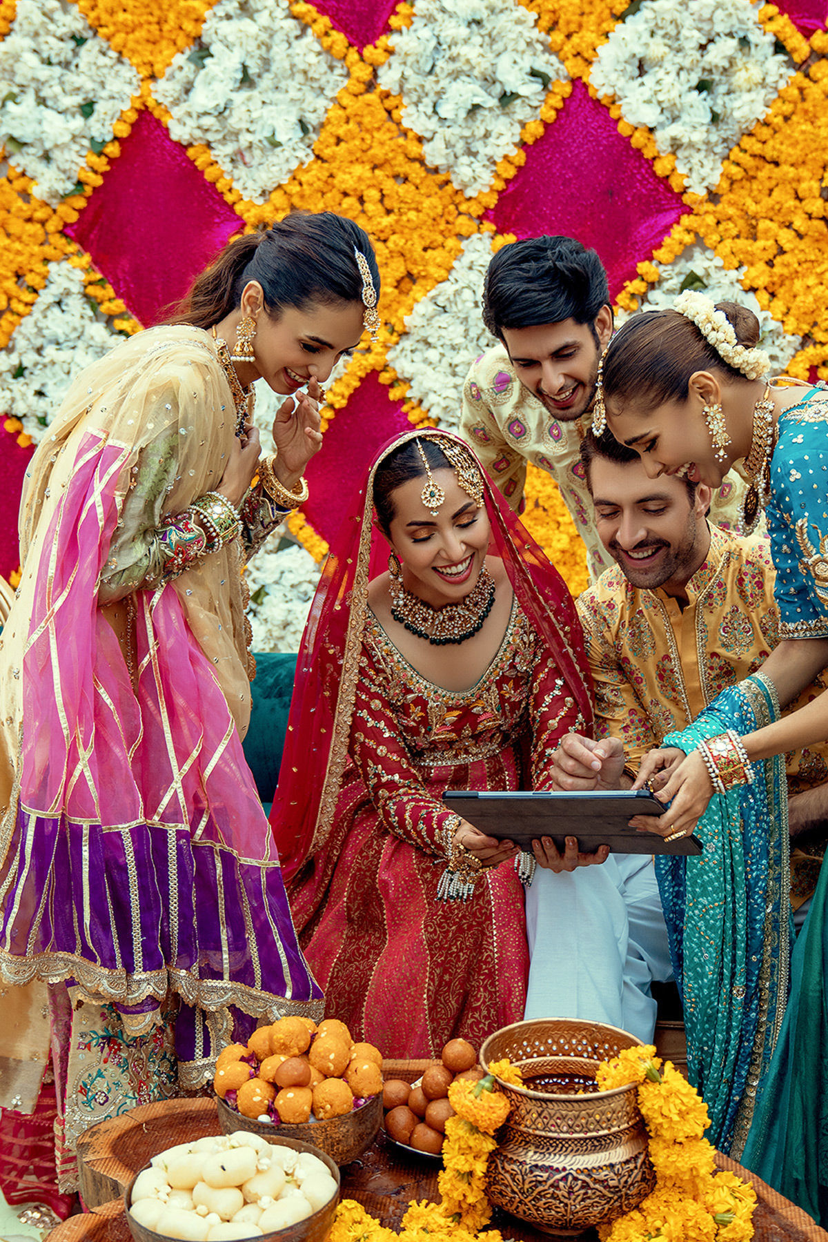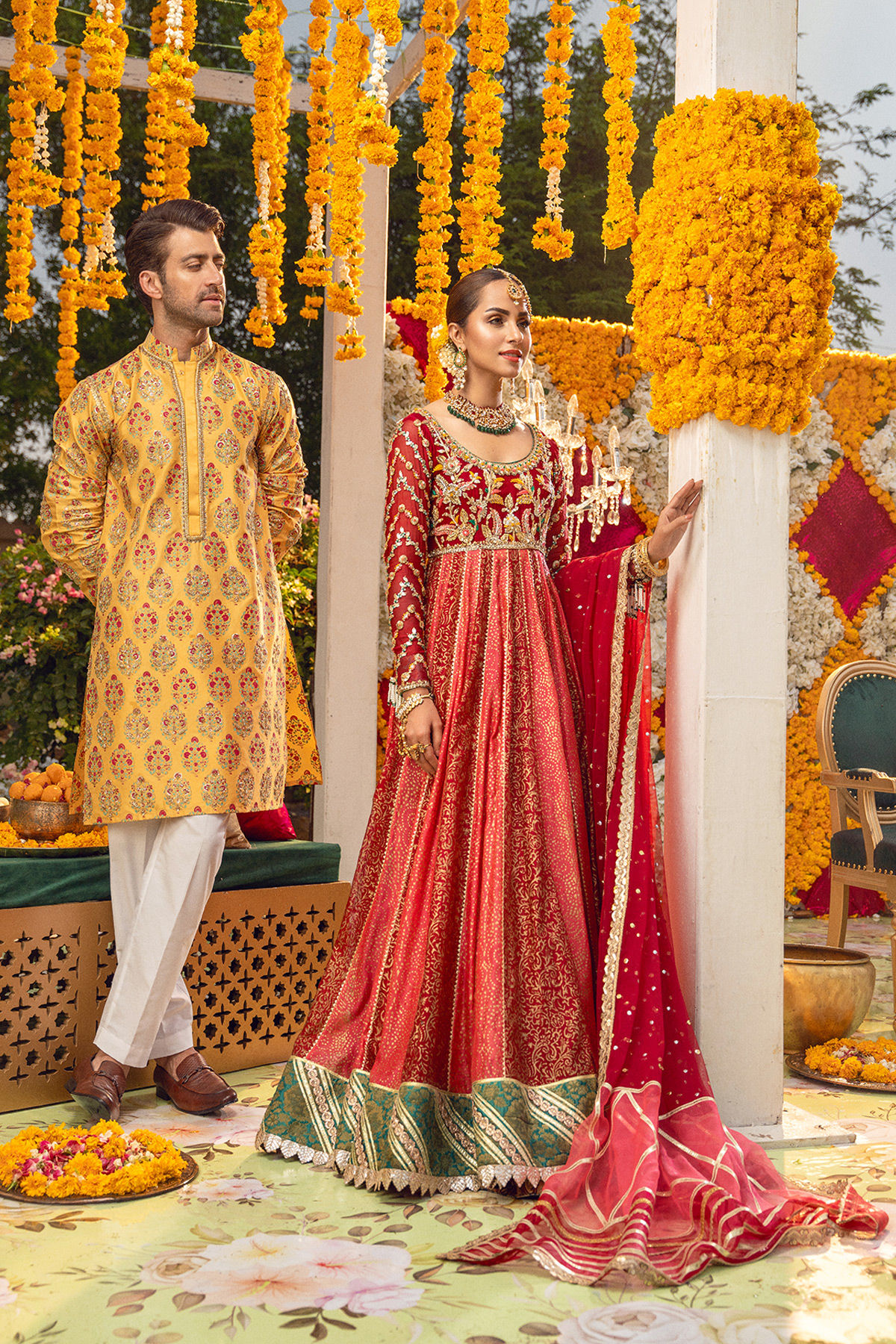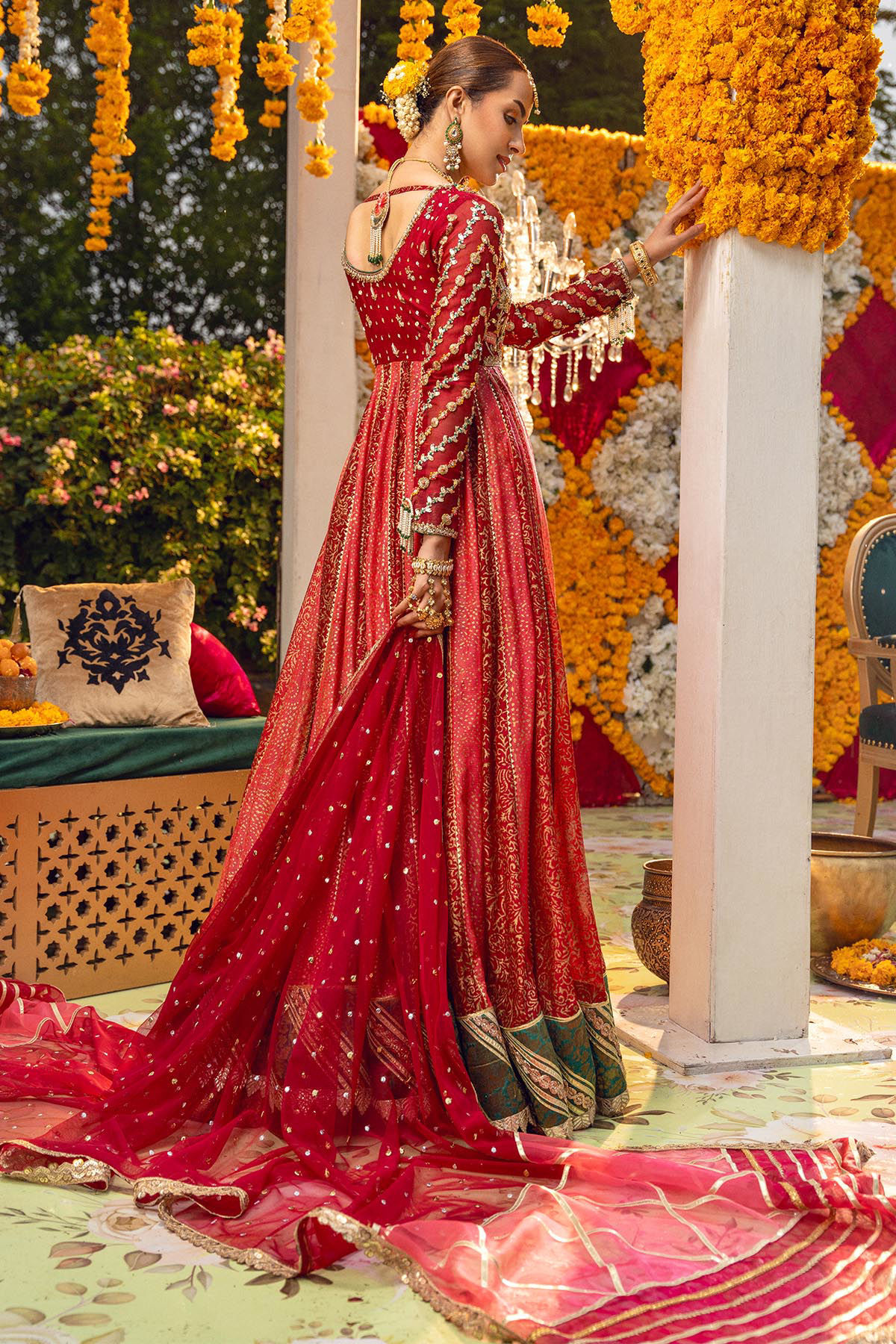 Floor length peshwas featuring zardozi and French knots embroidered details on bodice and sleeves adorned with gota on pure silk net red and watermelon pink canvas. The sleeves of the peshwas comes with dangling tassels and the hemline is adorned with contrasting hem enhanced with gota and laces. The peshwas is paired with color blocked dupatta with gota details.