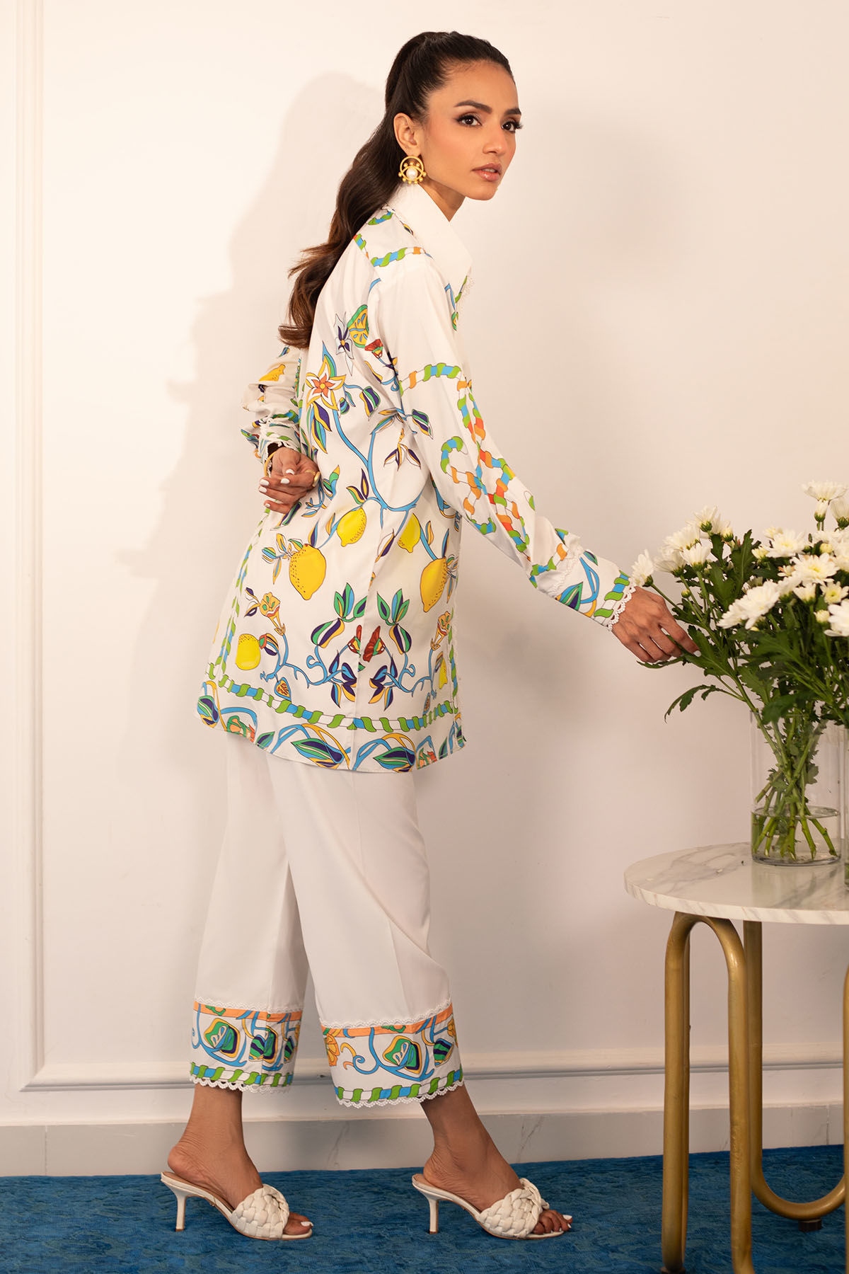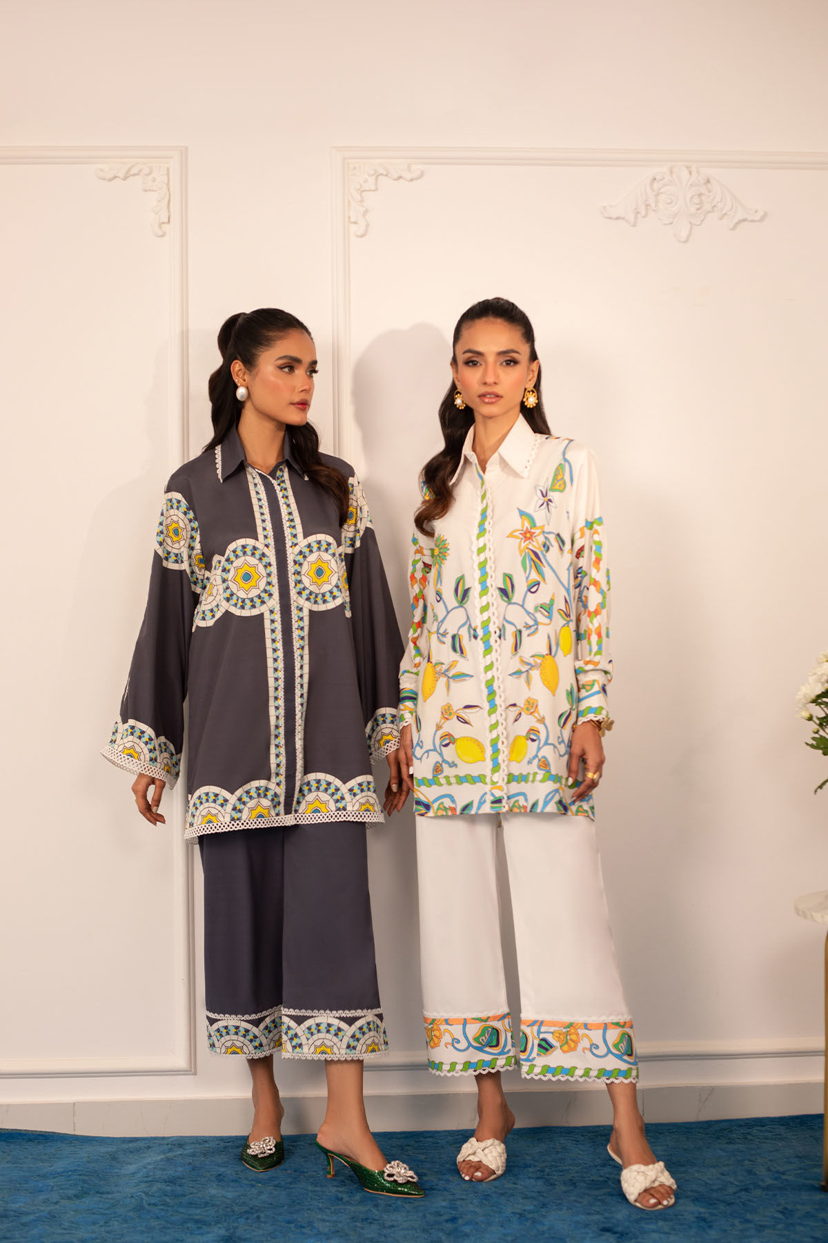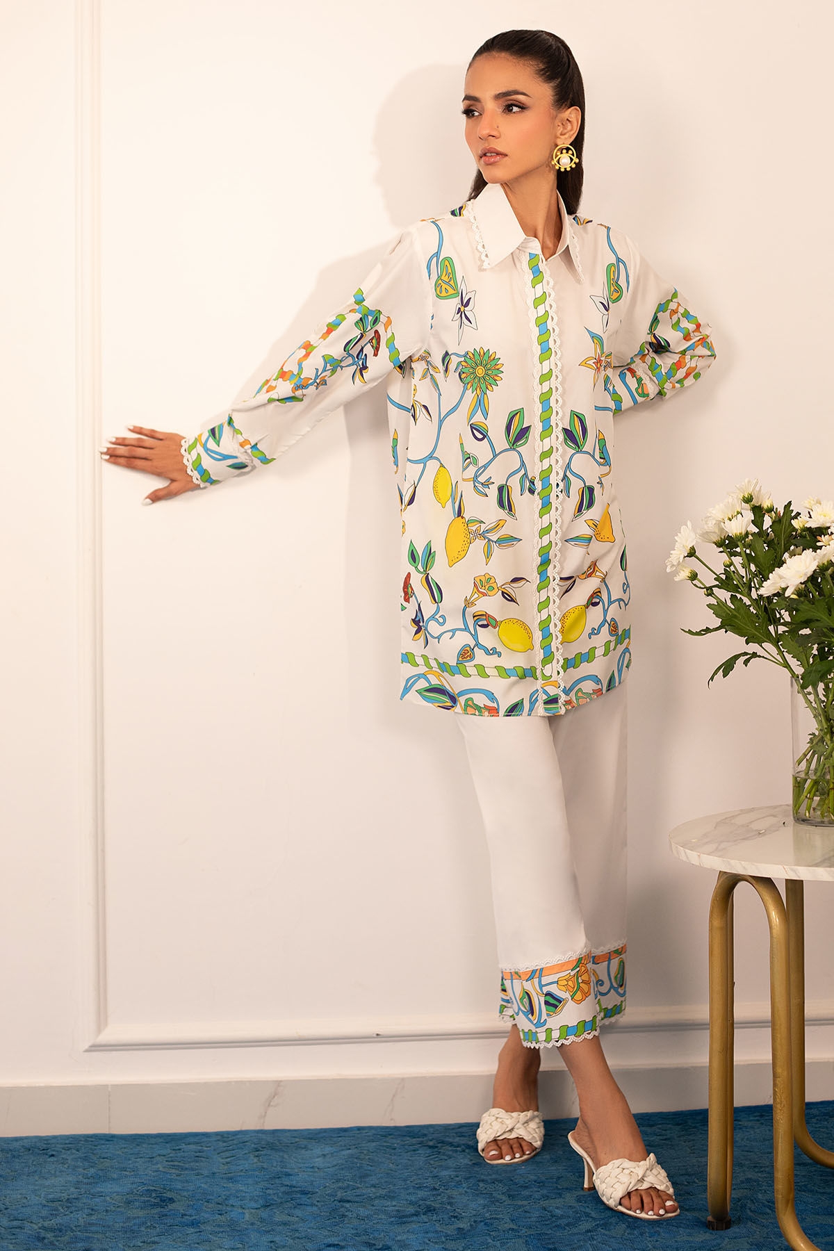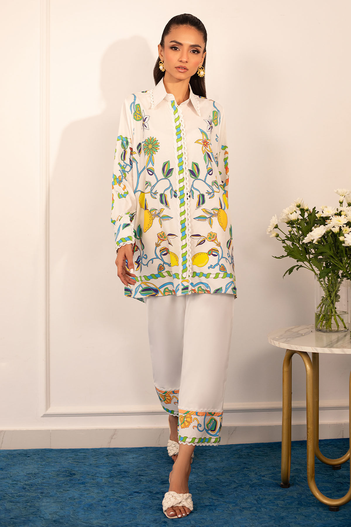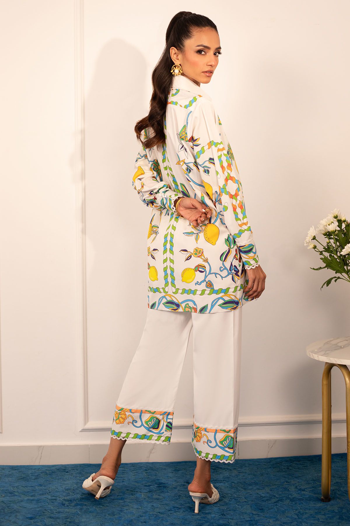 Quirky, trendy yet elegant co-ord set on crepe silk featuring balanced and carefully crafted prints, enhanced with lace details, is a must-have in your closet this summer.