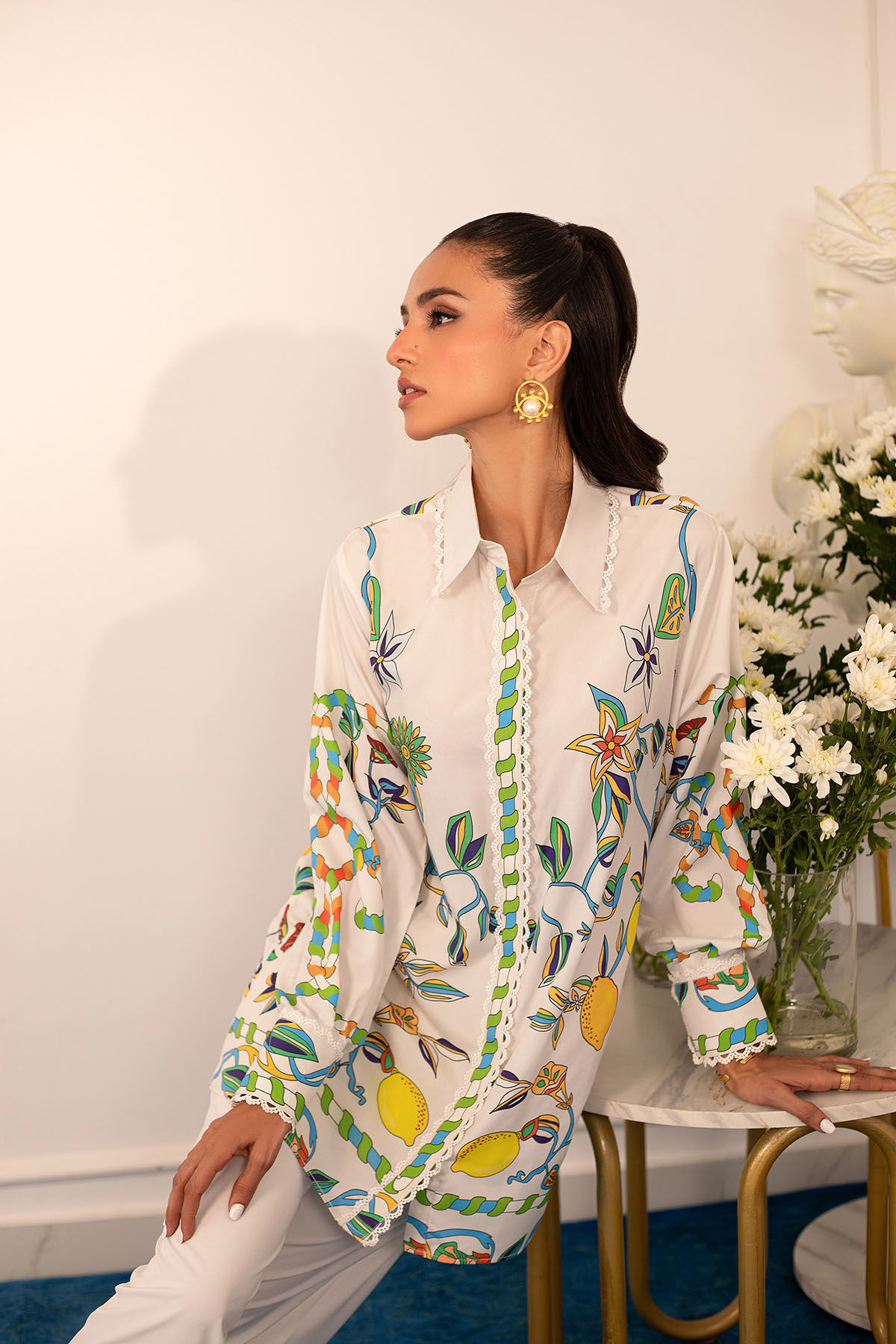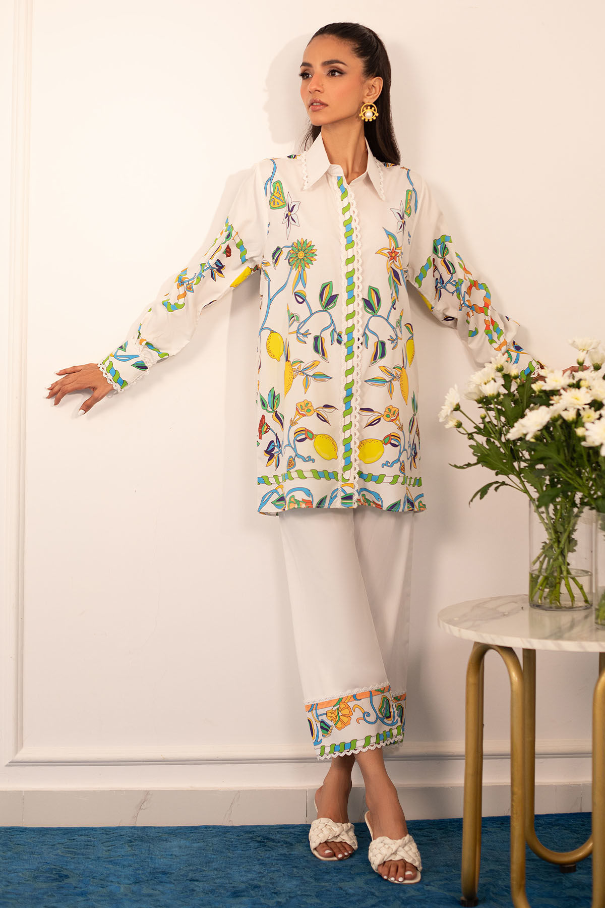 Quirky, trendy yet elegant co-ord set on crepe silk featuring balanced and carefully crafted prints, enhanced with lace details, is a must-have in your closet this summer.