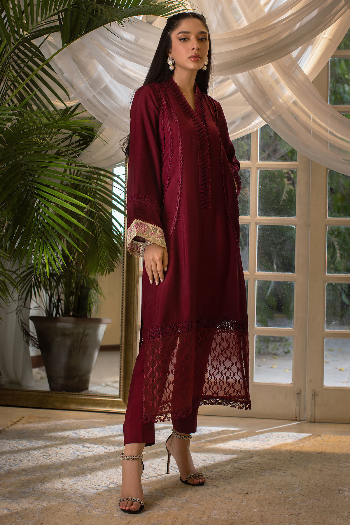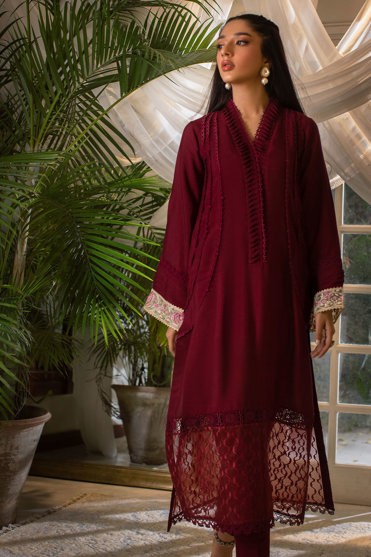Color: Oxblood Fabric: Cotton Net Work Details: Lace Detailing