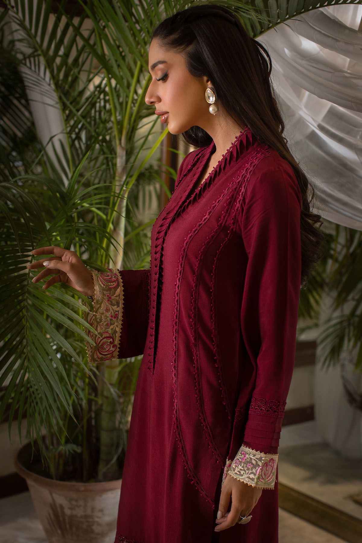 Long silhouette cotton net shirt in oxblood shade featuring fabric manipulated neckline incorporated with lace details on center front. The hem is adorned with embossed organza details and the sleeves hem are finished with multicolored embroidered organza embroidery panel. The shirt is paired with straight pants