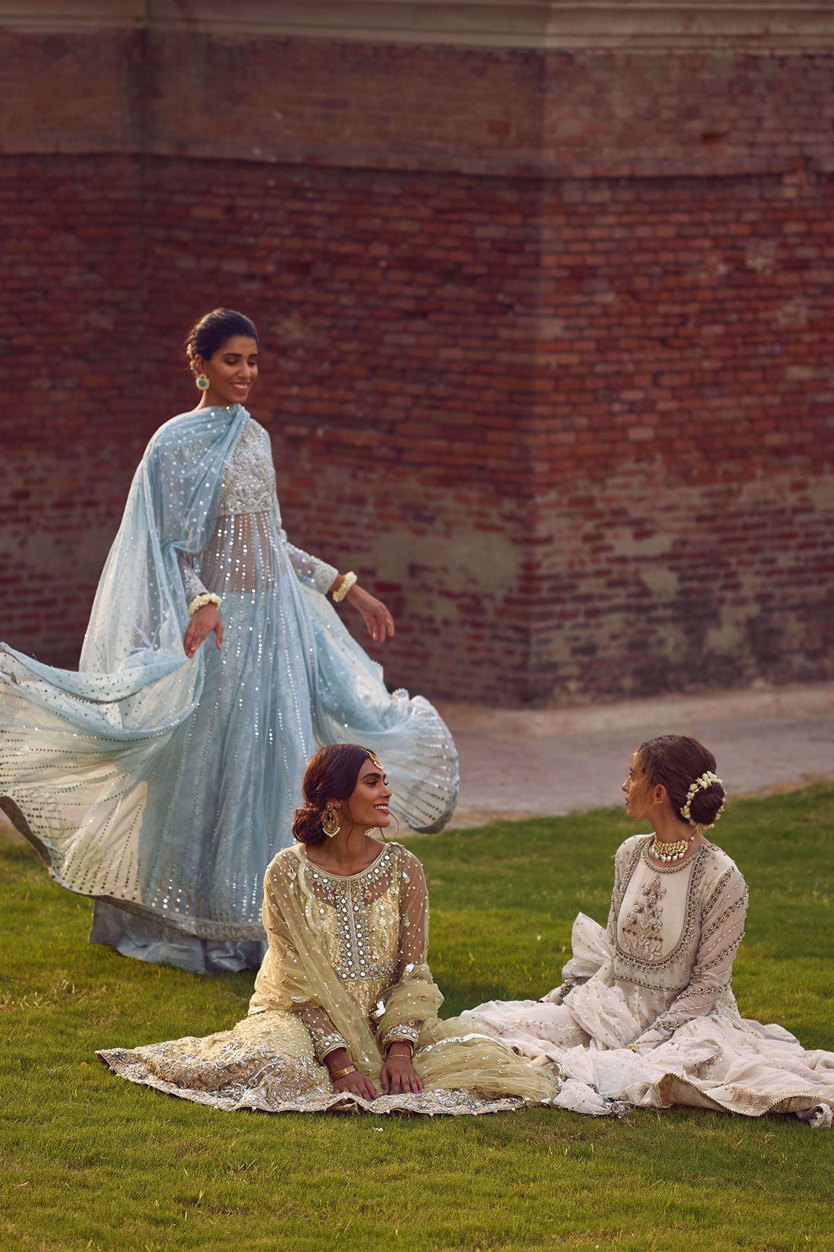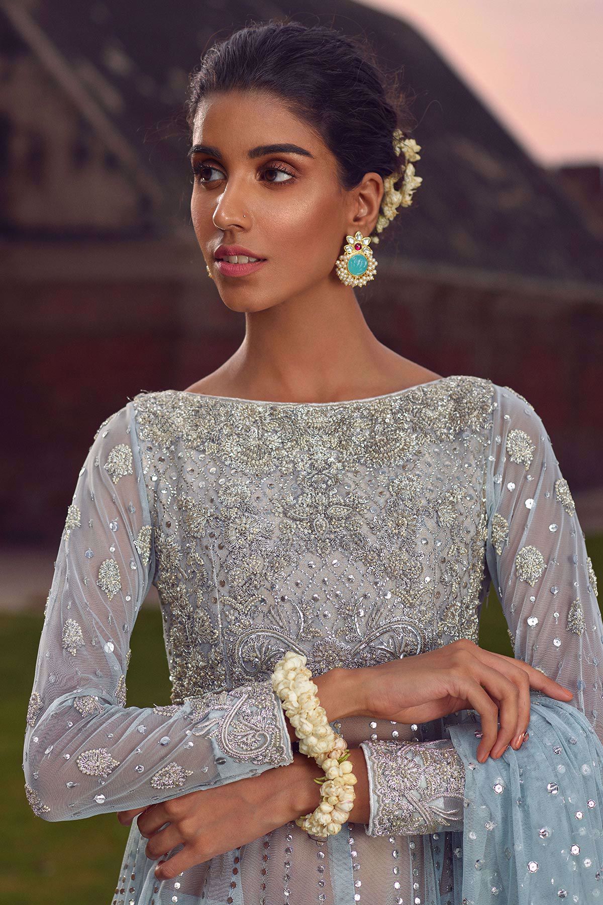Stunning ice blue pishwas featuring delicate hand embroidered details of nakshi kora and dabka on the bodice. The pishwas is further enhanced with kaamdani details. This outfit is paired with ice blue and silver dhaka pajama and net dupatta with sequins and lace finishings.