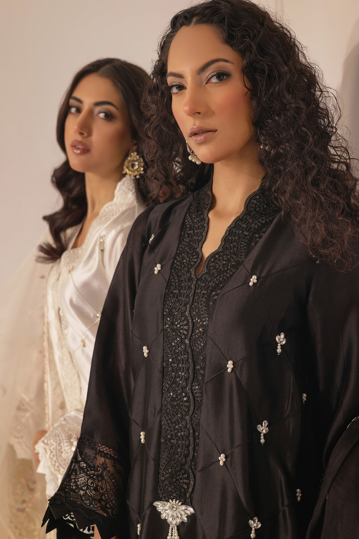 Long silhouette shirt on pure sheesha silk featuring geometrical pin tucks details on centre front. The pin tucks are further adorned with light catching crystals and pearls details. The shirt comes with organza embroidered dupatta with lace details. The outfit can be paired with straight raw silk pants to create a festive look.