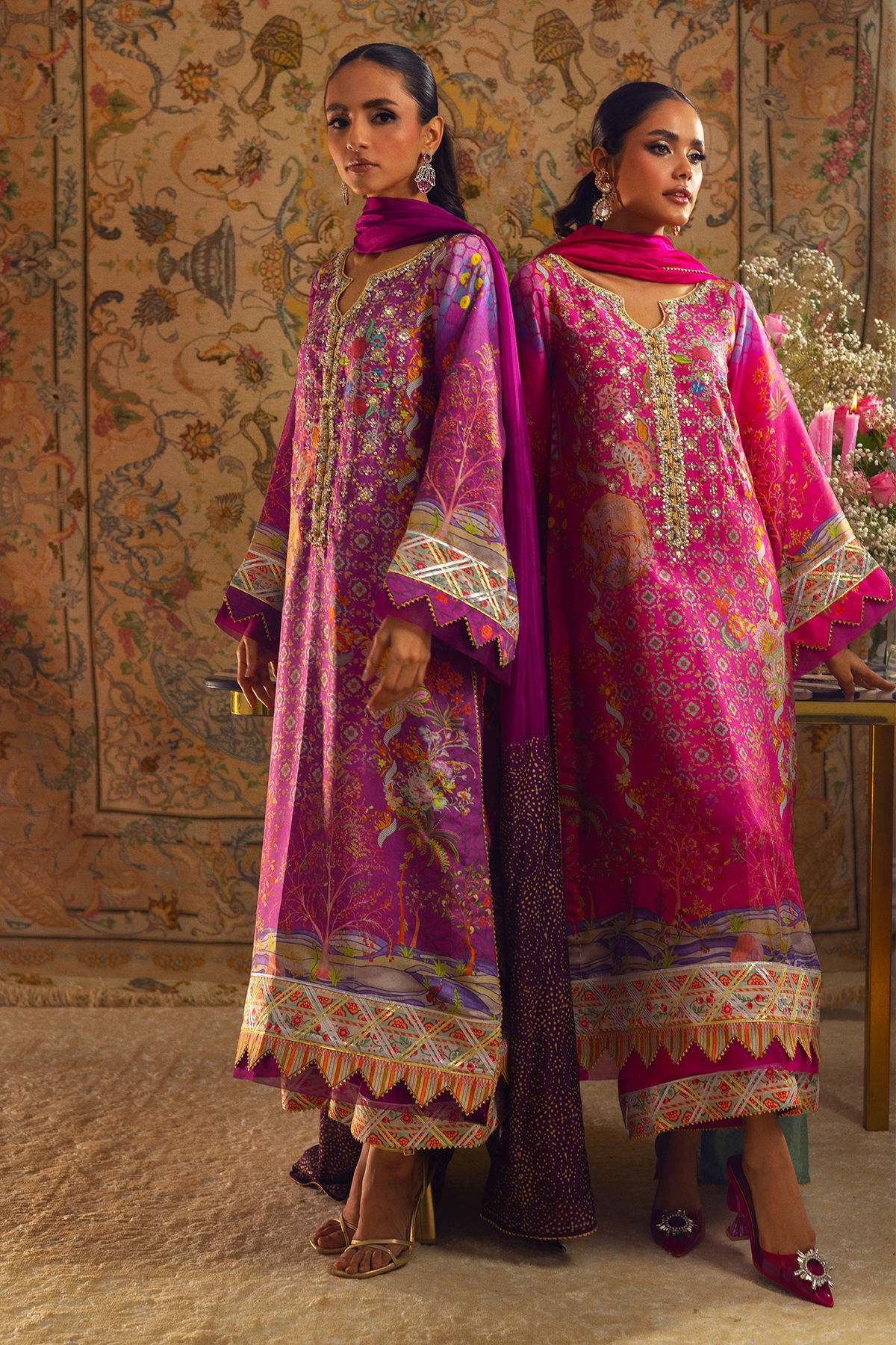 Crafted from exquisite pure raw silk, this elongated silhouette shirt showcases a captivating spectrum of vibrant colors against a deep pink canvas. The neckline is embellished with intricate zardozi detailing in shimmering silver and gold. The hem is meticulously finished employing gota work and advanced fabric manipulation techniques. This ensemble is complemented by matching pants and an ombré dupatta in a striking coral green and pink, adorned with hand block printed details on the pallu and elegantly enhanced with gota accents.