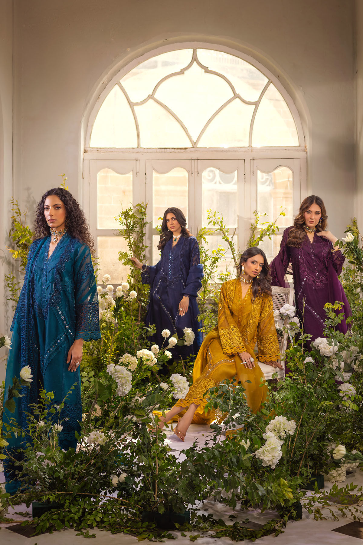 A- Line silhouette column shirt in a gorgeous shade of ochre gold featuring an array of techniques on pure silk net canvas. The neckline is adorned with appliqué and pleats detail incorporated with sequins and laces. The center front is enhanced with mirror embroidered details, the hemline is carefully crafted with pure organza schiffli details. The shirt is paired with organza dupatta featuring schiffli borders and matching straight pants to create that glamorously festive look.