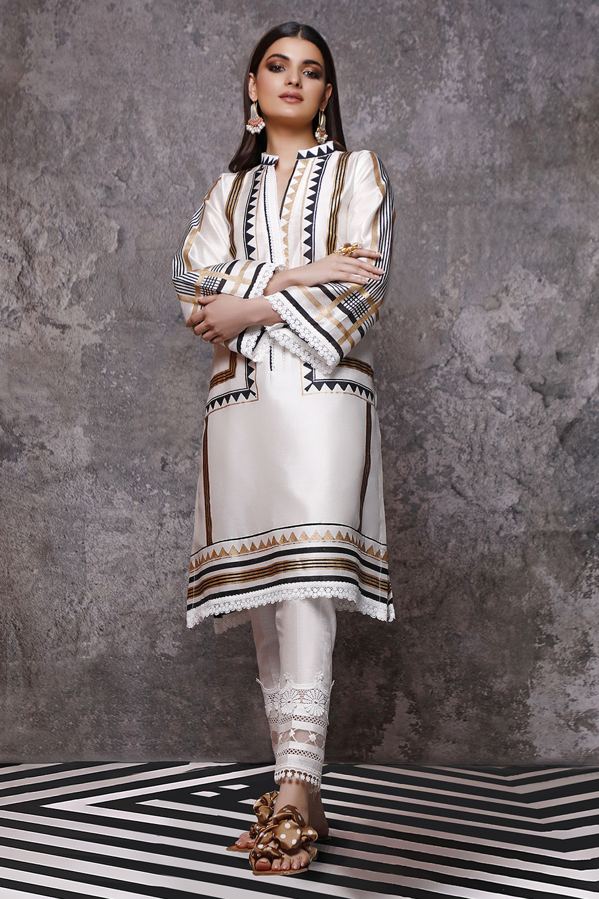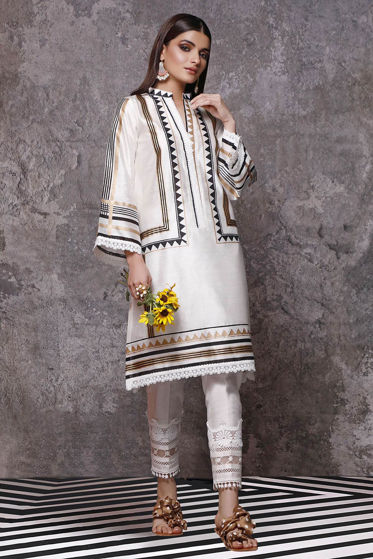 Straight silhouette cotton net kurta with black and white geometric printed details on front and back of the sleeves with a hint of gold. The neckline and hemline is adorned with crochet laces in black and white tones.