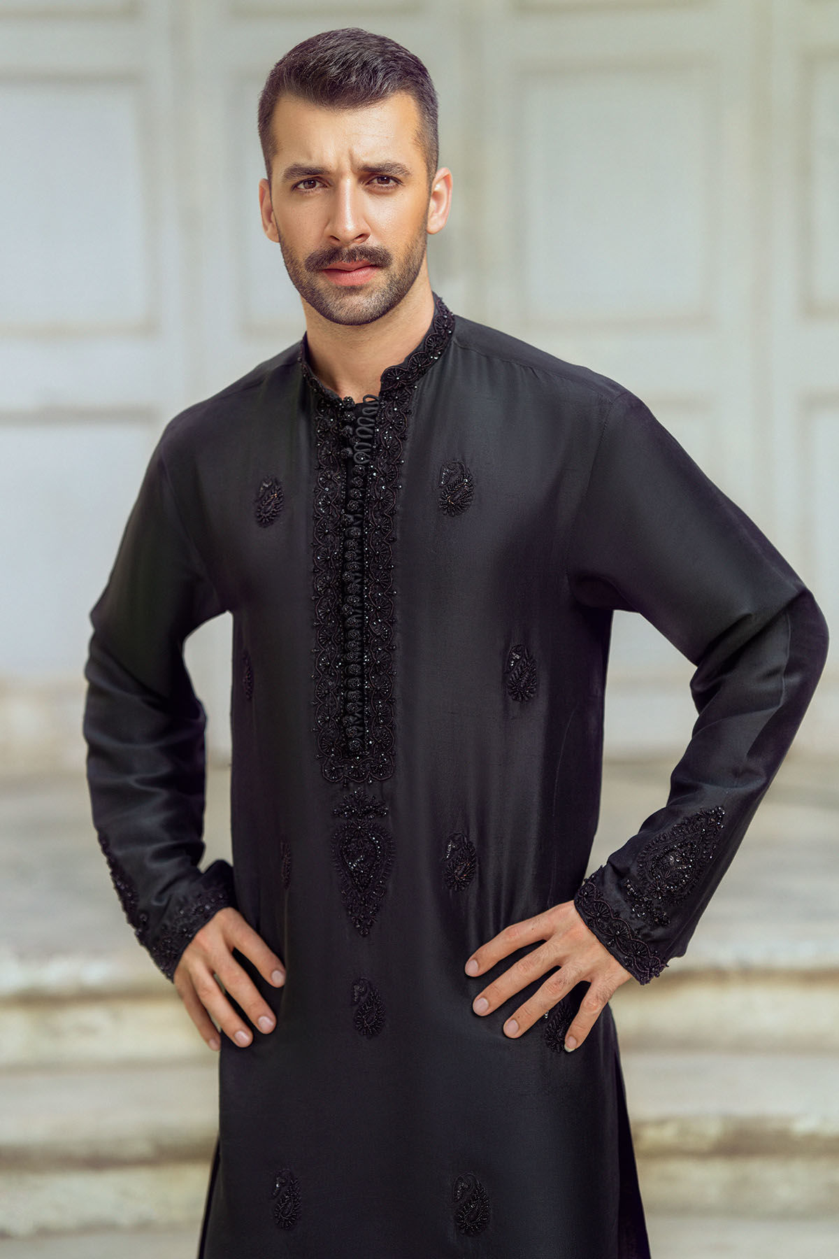 Pure raw silk kurta in head turning Noir shade featuring silk thread anchor embroidered details on neckline and sleeves and collar, the embroidered details are enhanced with zardozi in all black which are adorned with light catching crystals and sequins. The kurta is paired with matching raw silk pants.