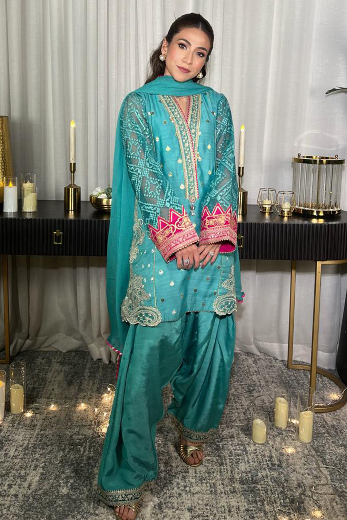 Knee-length shirt crafted from Lorex canvas in a stunning feroza mint hue, accentuated by intricately aari embroidered neckline and zari appliqué motifs at the side slits. The sleeves are embellished with a contrasting pink screen-printed panel, elegantly finished with appliqué and gota embellishments. This ensemble is complemented by farshi shalwar and a chiffon dupatta, completing the sophisticated look.