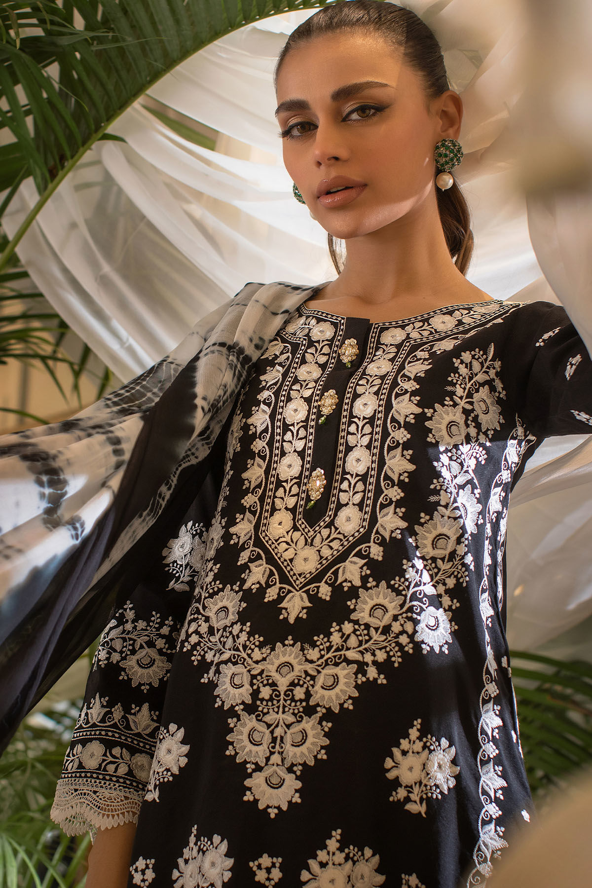 Long silhouette shirt on faux silk black canvas featuring white embroidery details on front back and sleeves. The hem of the sleeves and shirt are adorned with crochet laces and the neckline is adorned with handcrafted dabka and light catching stones embellishments. The shirt can be paired with straight cotton pants. The shirt comes with tie and dye chiffon dupatta featuring crochet laces on each side.