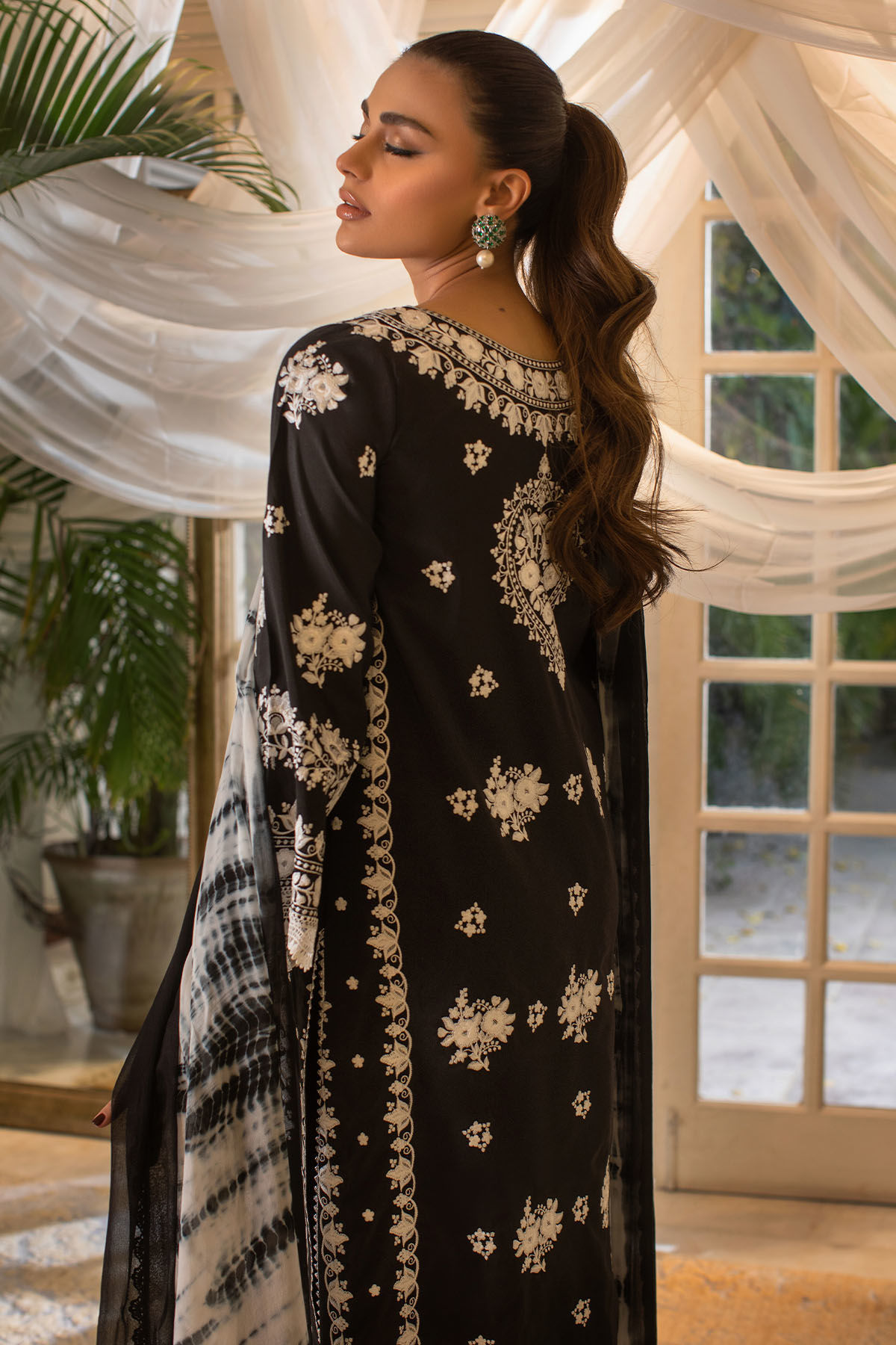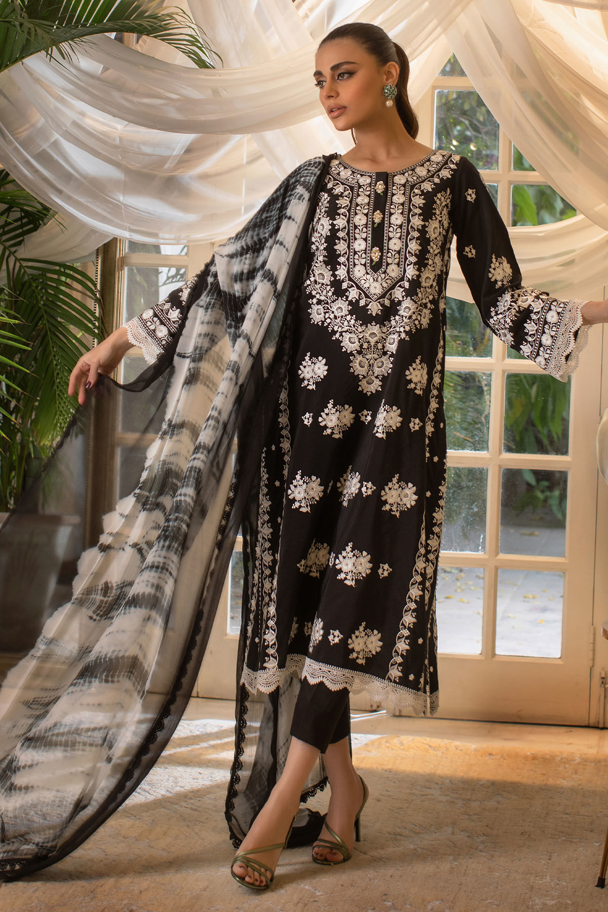 Long silhouette shirt on faux silk black canvas featuring white embroidery details on front back and sleeves. The hem of the sleeves and shirt are adorned with crochet laces and the neckline is adorned with handcrafted dabka and light catching stones embellishments. The shirt comes with tie and dye chiffon dupatta featuring crochet laces on each side.