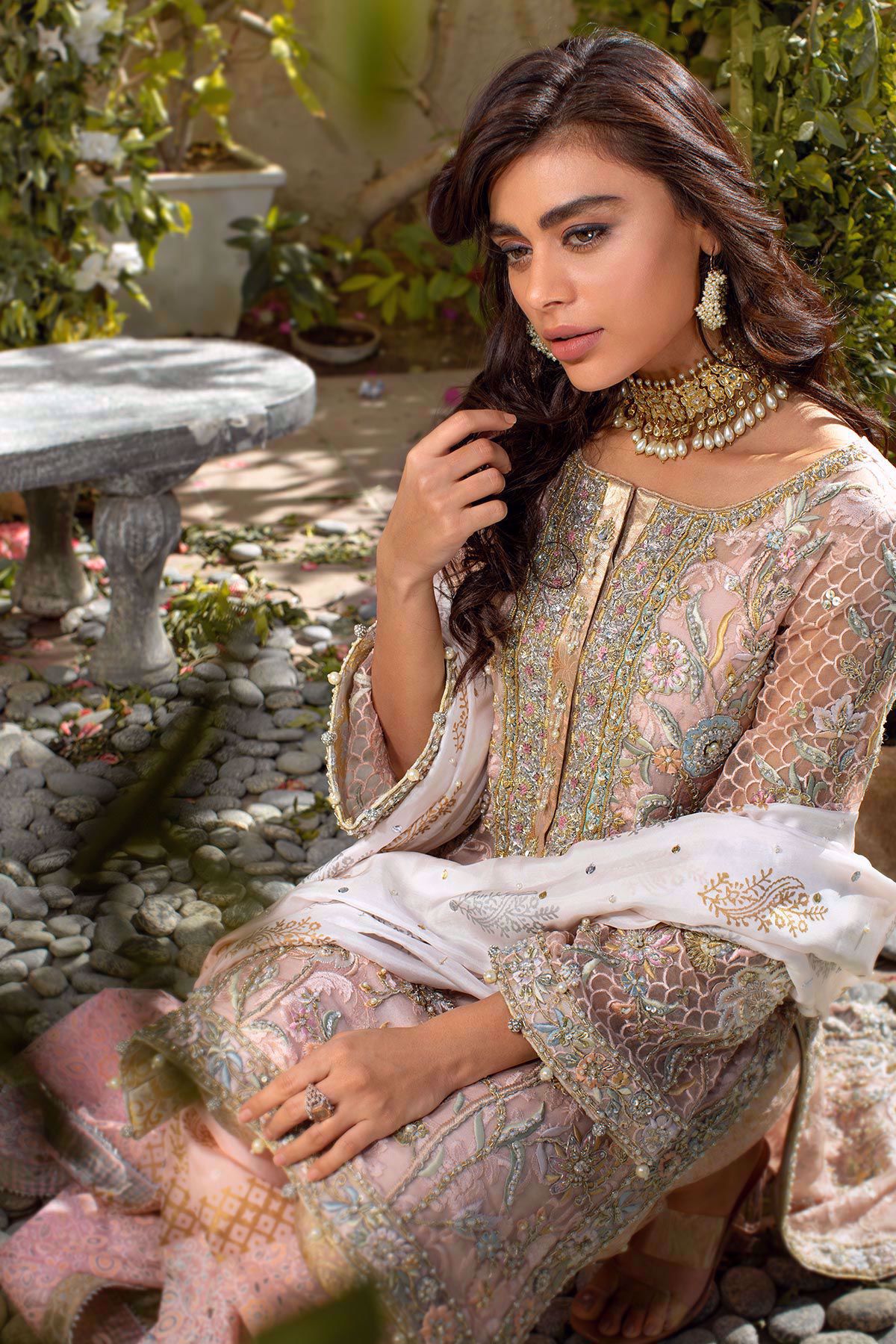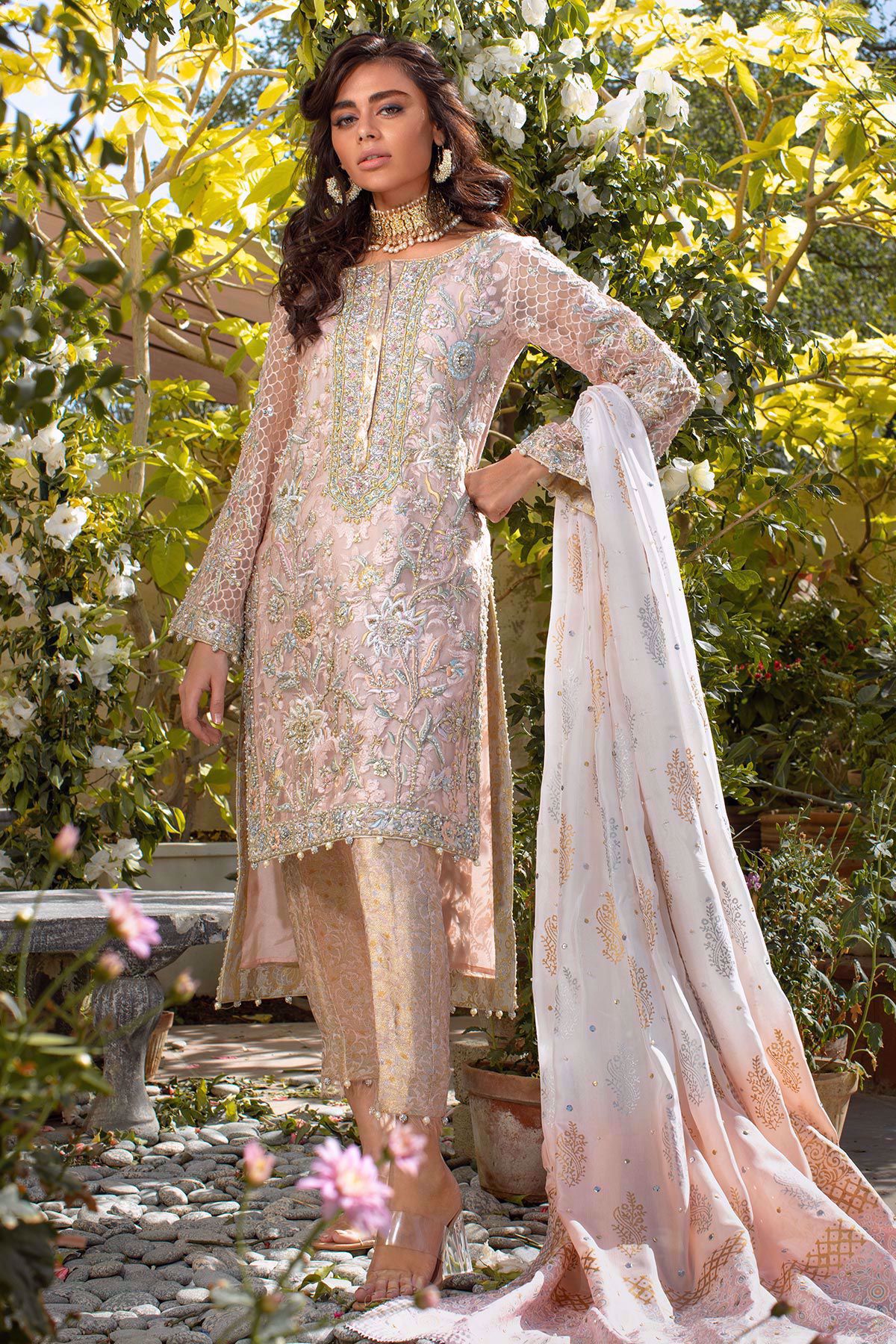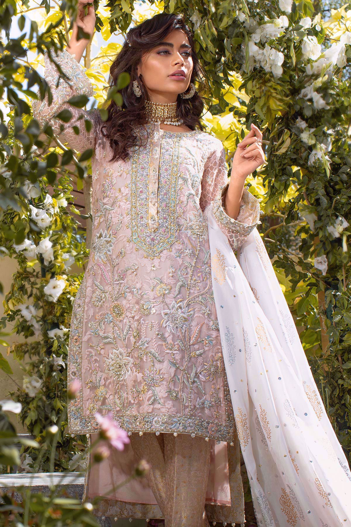 Straight silhouette embroidered organza high low shirt with subtle silk rosettes details on the front and back of the shirt, the silk thread rosettes are enhanced with pearls, crystals and sequins incorporated with dabka, nakshi and kora. The neckline of the shirt has handcrafted details of nakshi and dabka with light catching crystals. The shirt is paired with damask straight pants. Hand block printed silk dupatta with pearls and sequins completes the look.