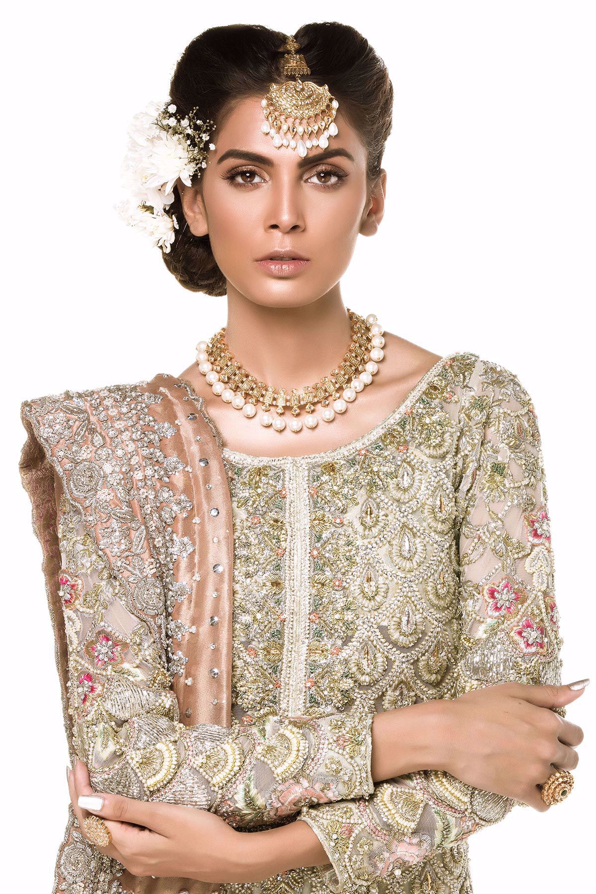 This silver and ice blue gorgeous handcrafted shirt is a reflection to modern regality, an ode to old meets new. The shirt is creatively adorned with mukesh, dabka and pearl details, while incorporated with handcrafted tassels on hemline. The rosegold lamé dupatta has handcrafted dabka border in shades of silver. The farshi dhaka pajama with scattered motifs makes this ensemble head turning.
