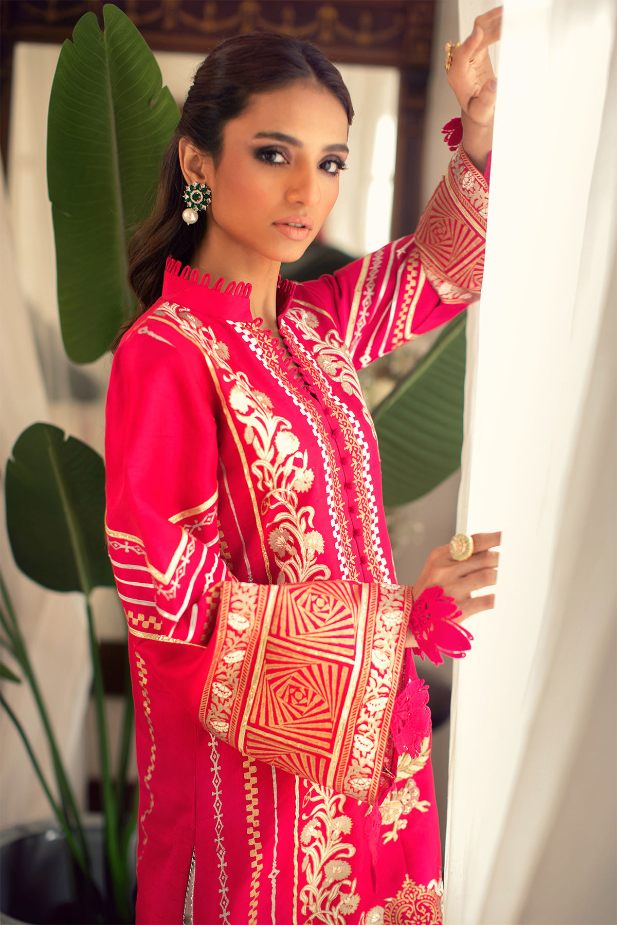 Long silhouette pure raw silk shirt in deep Fuchsia featuring hand block printed details in silver and gold. The block printed details are further enhanced with gota insertions and silk thread embroidered rosettes on centre front. The sleeves of the shirt featuring crochet flowers hangings. The outfit is paired with pure raw silk Rooh pants featuring embroidered organza, fabric manipulation and crochet lace details.