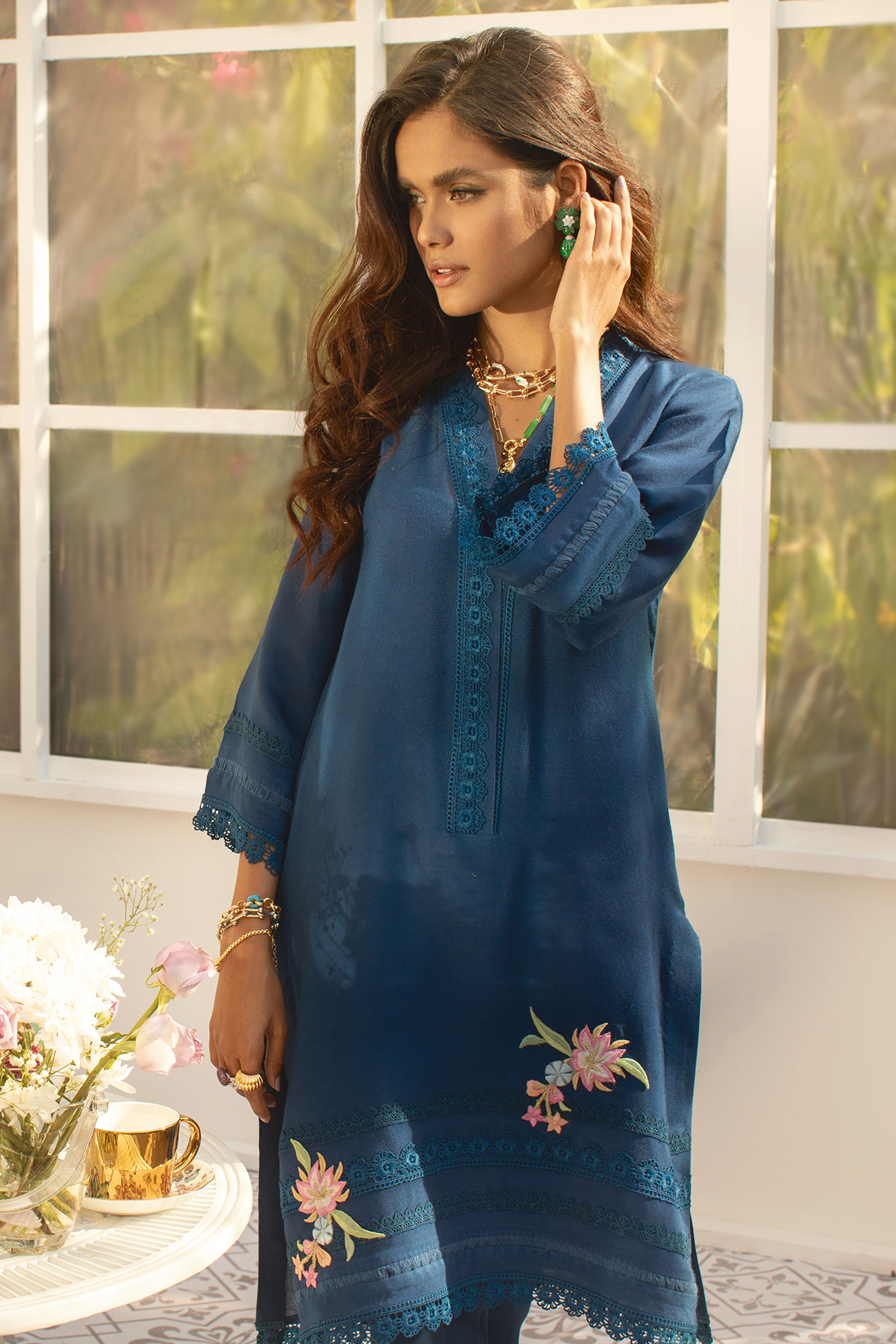 Long straight silhouette berry blue cotton net shirt with details on the neckline. The front of the shirt is enhanced with different types of laces and silk thread floral details.