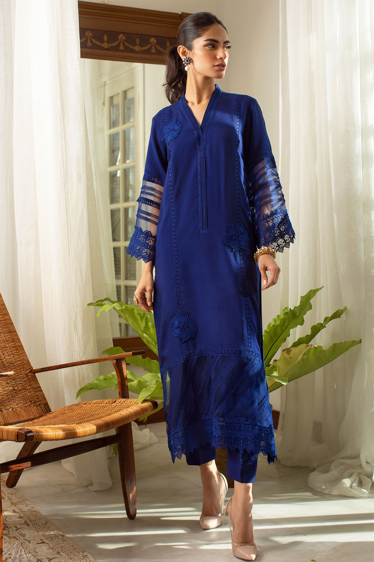 Color: Cobalt Blue Fabric: Cotton Net Work Details: Lace and Applique details