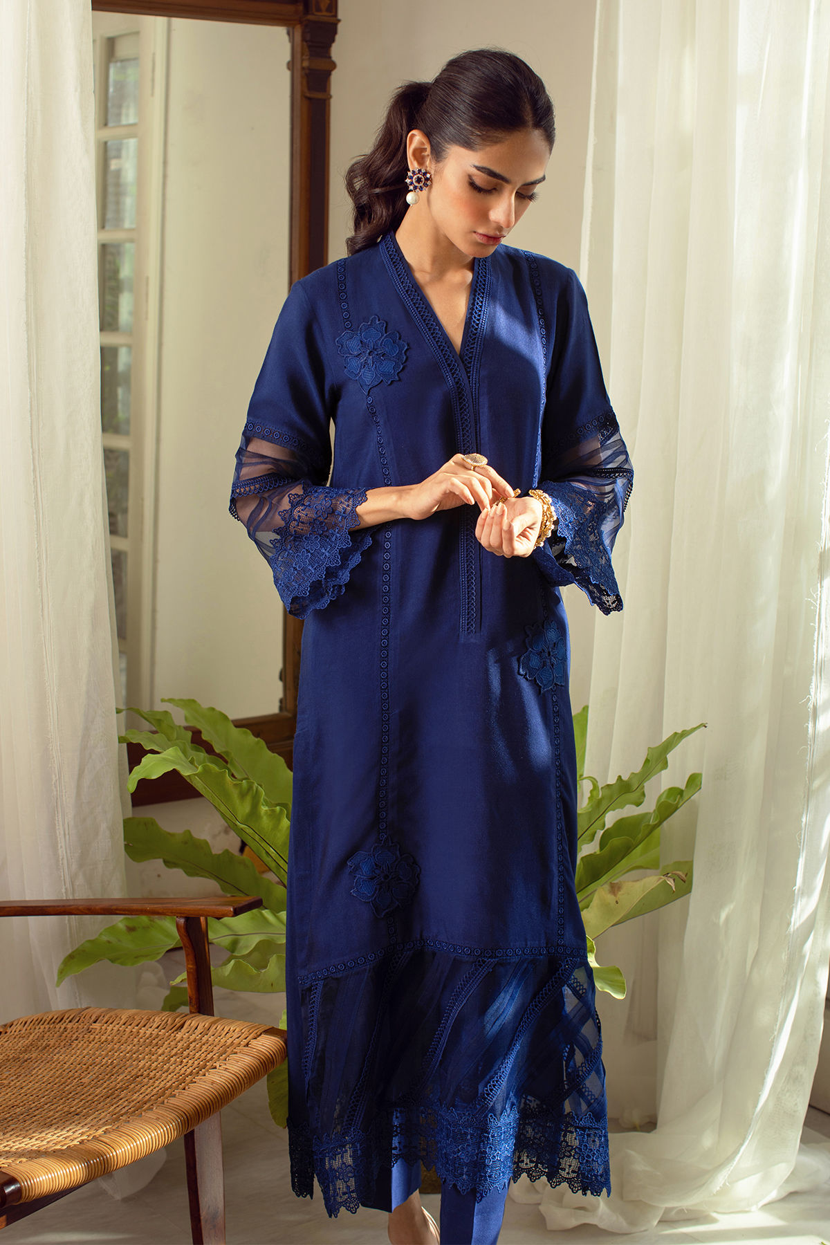 Long silhouette cotton net shirt featuring lace and applique details on centre front, the hem of the shirt is adorned with pleats and laces on pure organza canvas and is further enhanced with matching laces, the shirt can be paired with straight matching pants