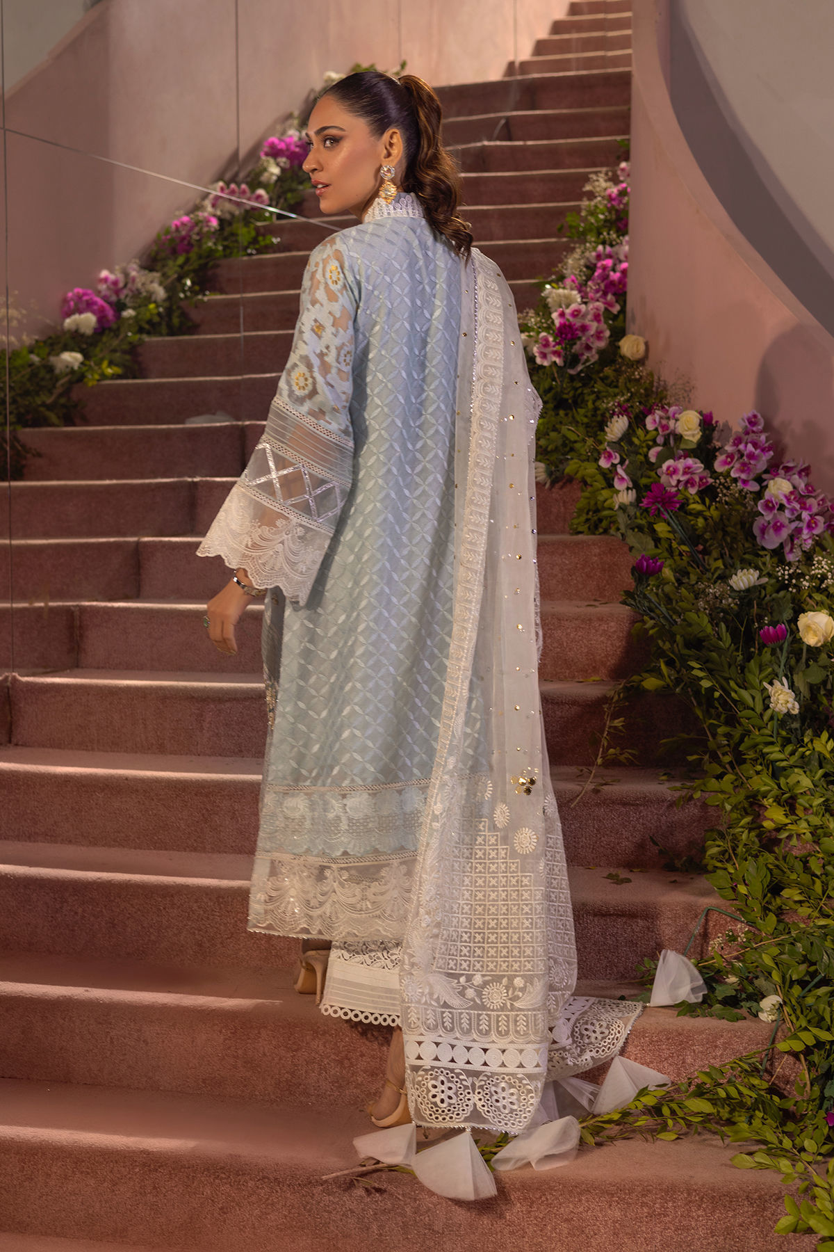 A- line shirt on embossed silk net canvas featuring shimmering spray of pearls and light catching crystals on centre front. The neckline is set to perfection with crystal lace and silk thread rosettes. The hem is carefully crafted with silk thread floral embroidered panel which is further decorated with zardozi details. The shirt can be paired with Ameeza kaamdani organza dupatta and Runa mirror embroidered izaar to create a festive look.