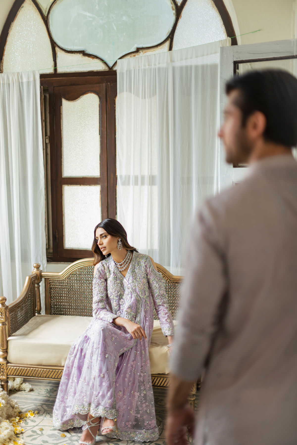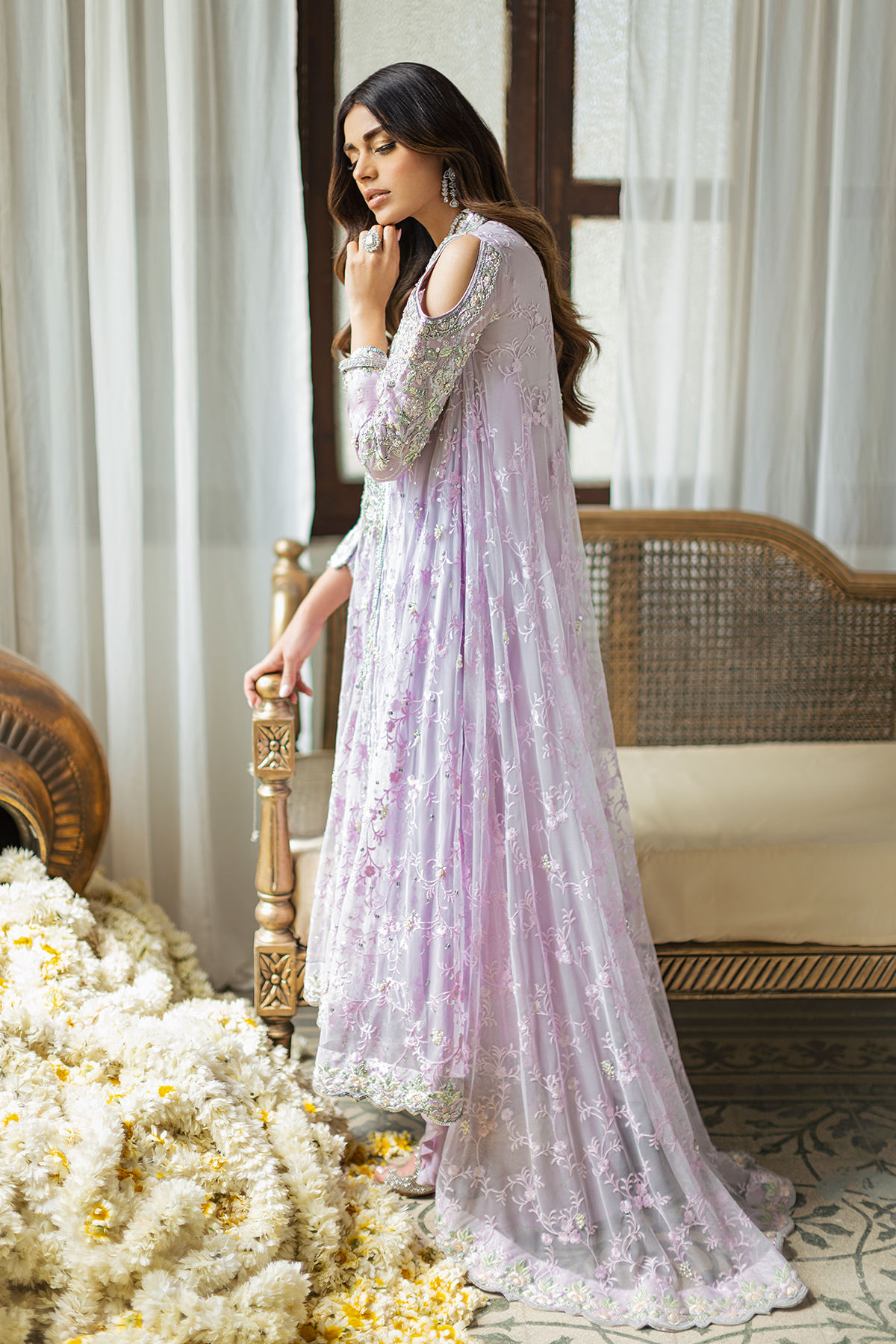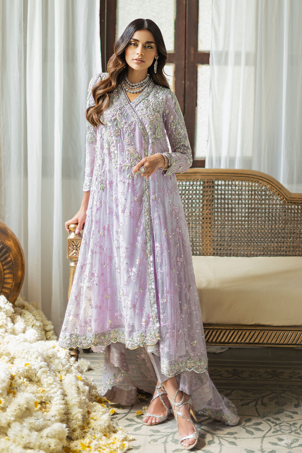 High low silhouette flared angharka on a dreamy lilac embossed net canvas featuring silk thread embroidered details in subtle pastel shades, the embroidered rosettes are further adorned with pearls and zardozi details in all silver. The center front is adorned with handcrafted tassels and the outfit is paired with matching pure damask straight pants.